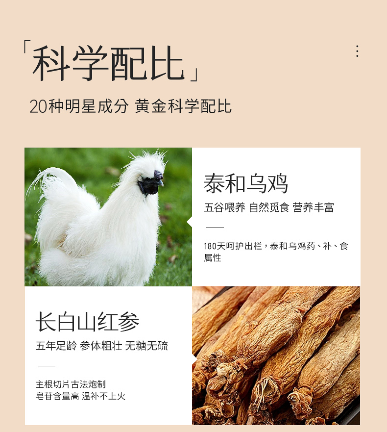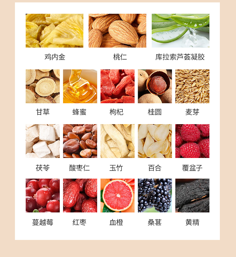 【配料】乌鸡 (15%) 、红参 (五年及五年以下人工种植)鸡内金、桃仁、甘草、蜂蜜、枸杞、麦芽、桂圆、获苓、酸枣仁、玉竹、百合、覆盆子、蔓越莓、大枣血橙、桑棋、黄精、库拉索芦荟凝胶