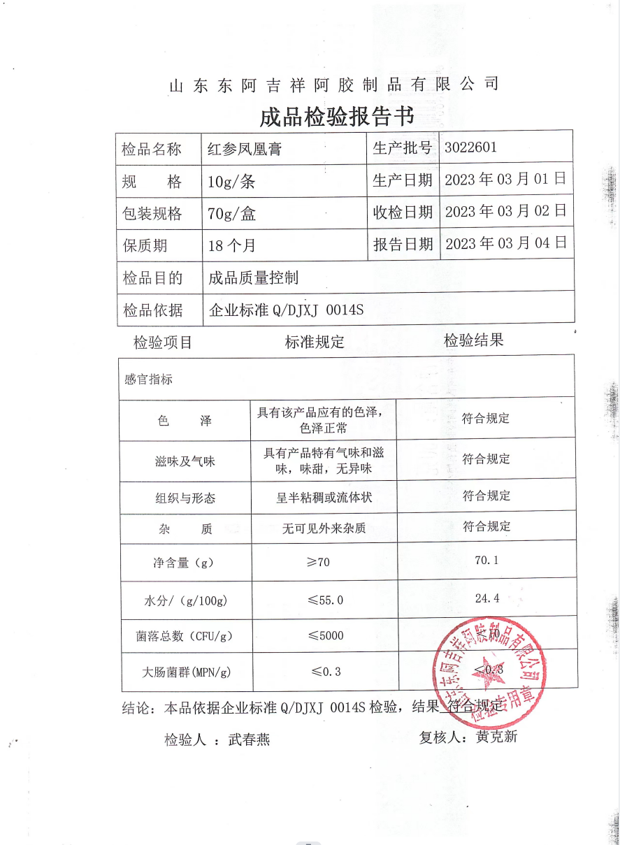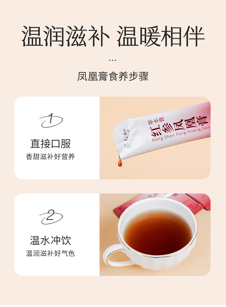 红参凤凰膏补血养血,用心精选,萃取乌鸡、红参(五年及五年以下人工种植)、鸡内金、桃仁、甘草、蜂蜜、枸杞、麦芽、桂圆、茯苓、酸枣仁、玉竹、百合、覆盆子、蔓越莓、大枣、血橙、桑椹、黄精共19种药食同源食材最精贵的部分,每一料细致入微呵护你