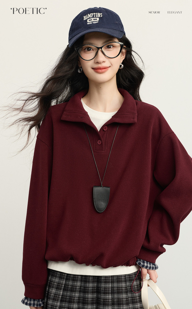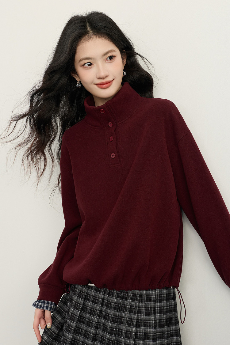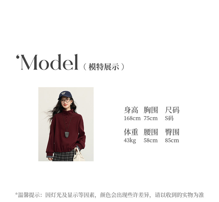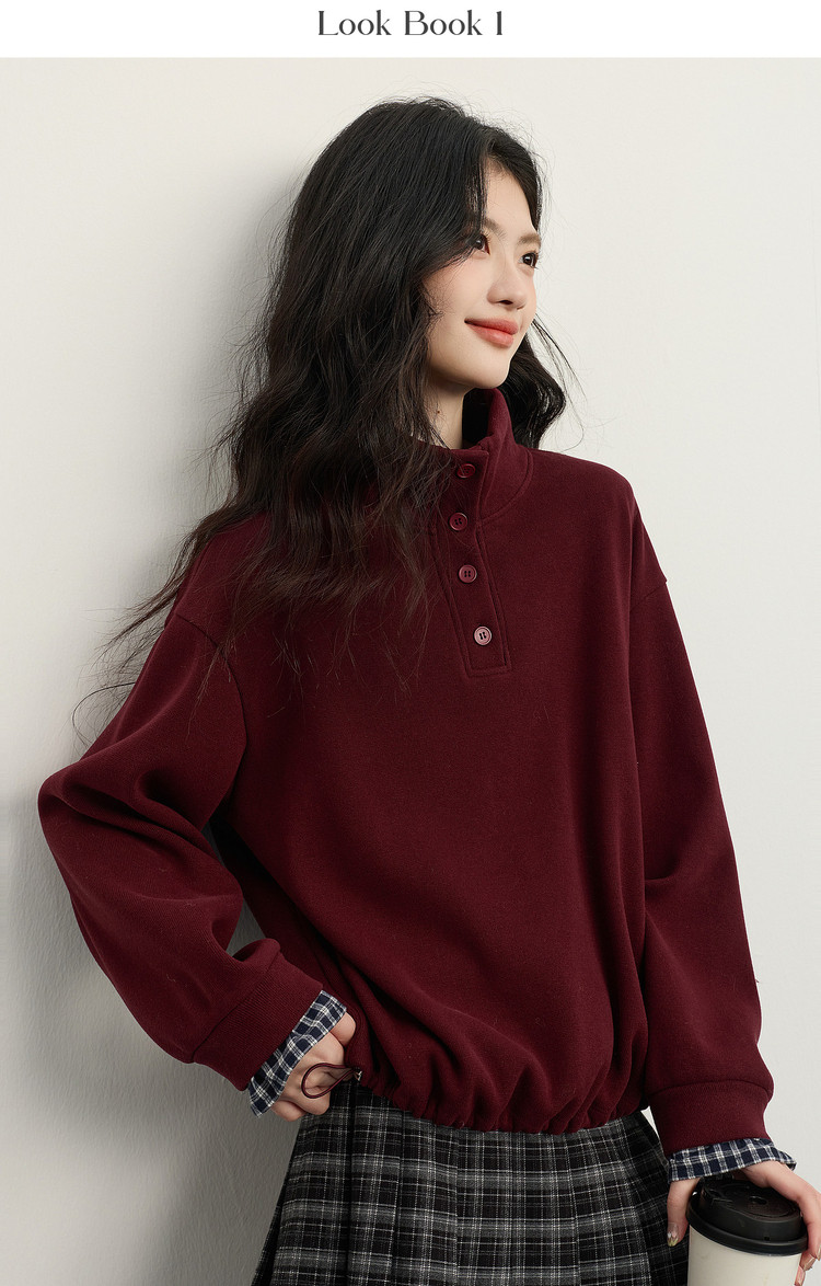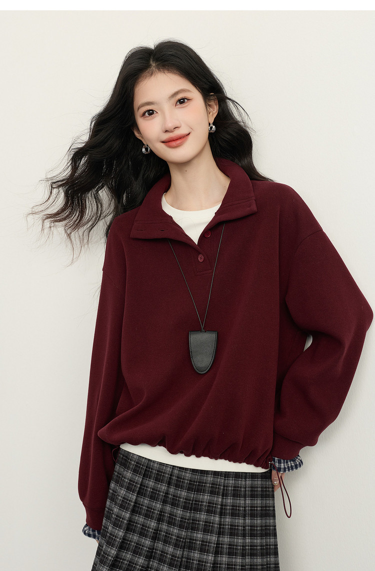 【12/24新品6.5折】熙世界韩里韩气红色加绒卫衣女士秋冬半高领格子拼接长袖宽松上衣
