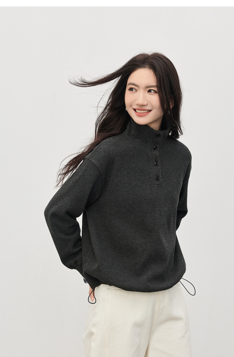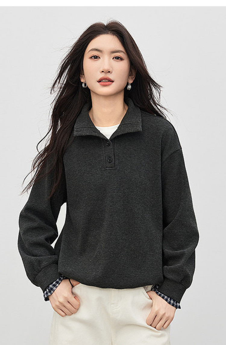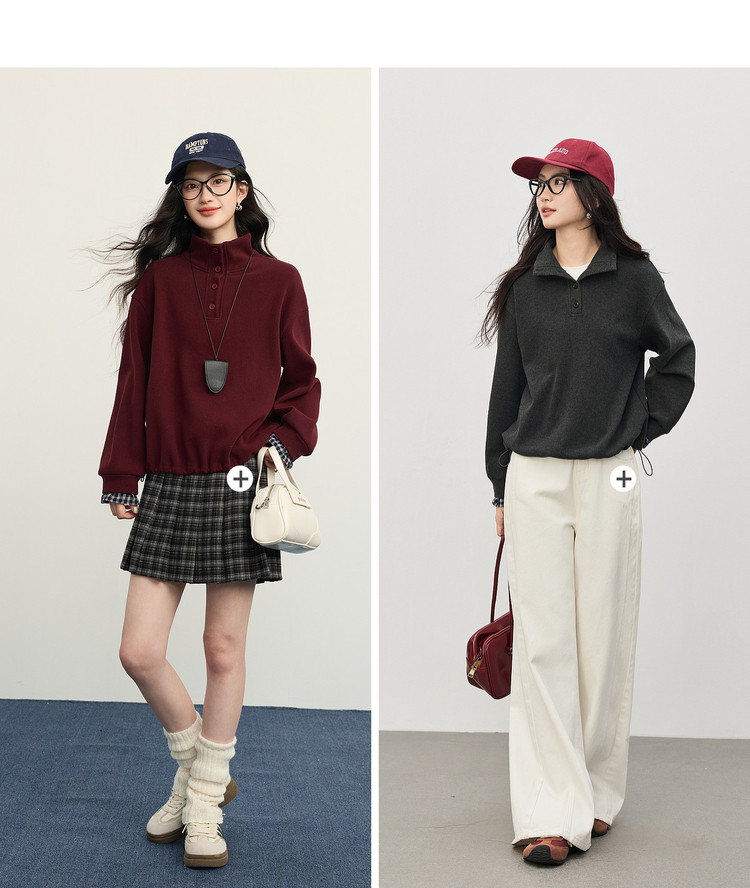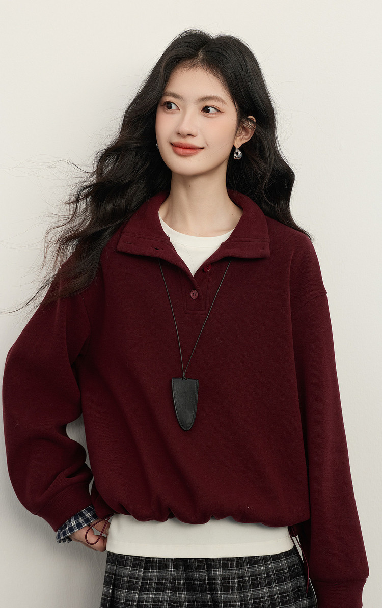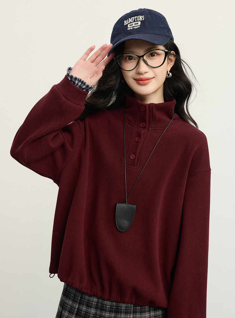 【12/24新品6.5折】熙世界韩里韩气红色加绒卫衣女士秋冬半高领格子拼接长袖宽松上衣