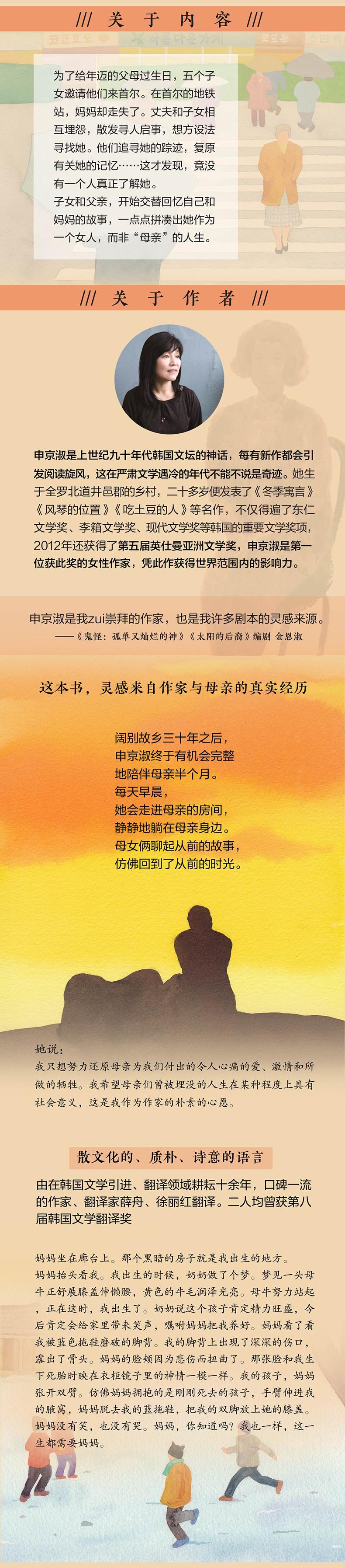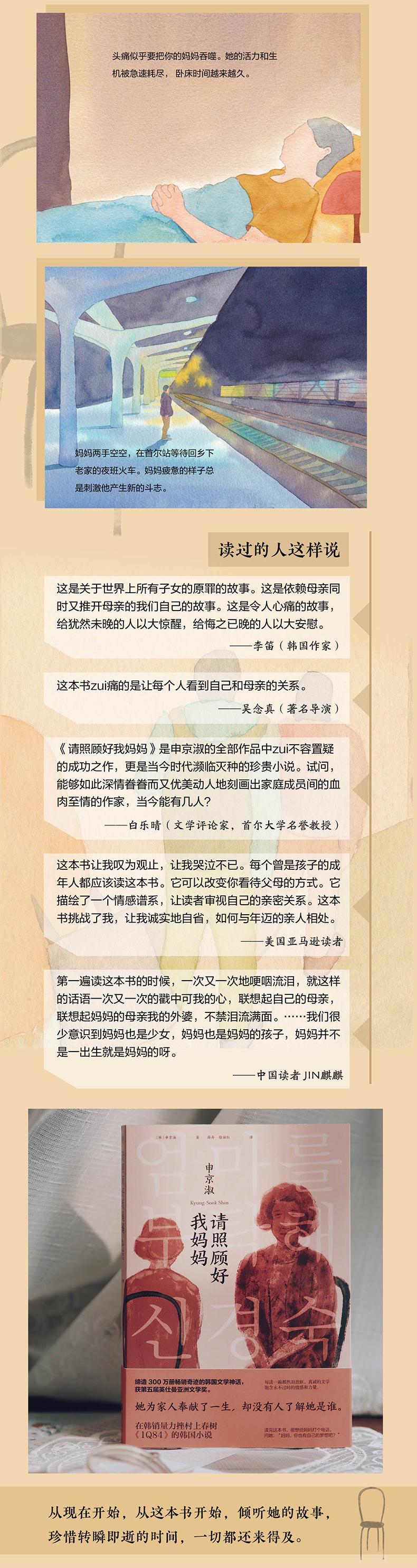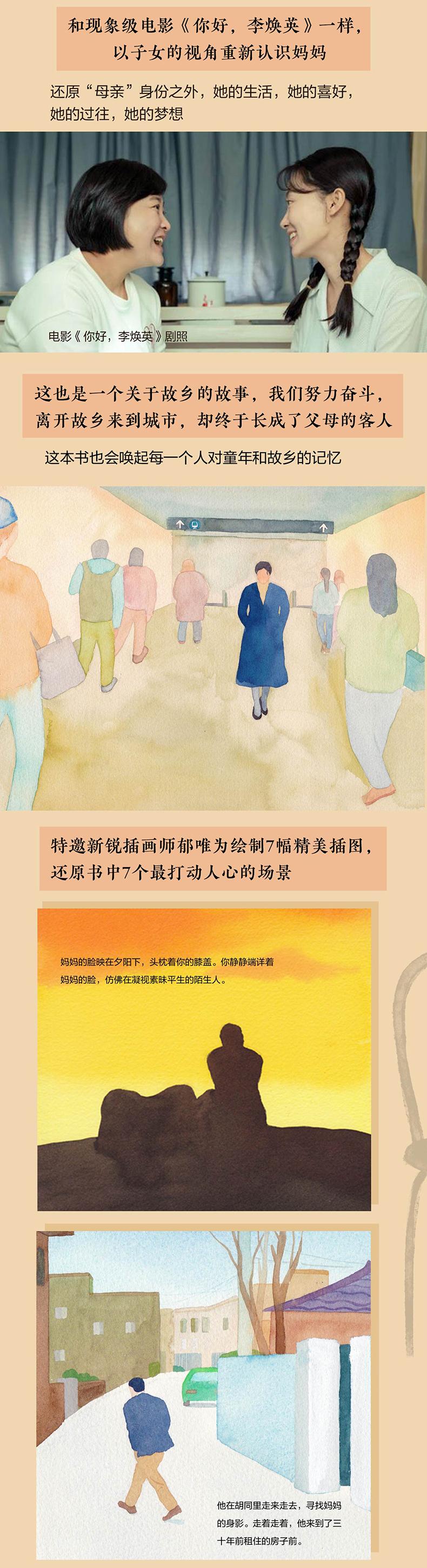 ◆和爆款电影《你好,李焕英》一样,以子女的视角去重新认识母亲,是经典的亲情、女性主义话题作品。简中版特邀新锐插画师创作7幅书中典型场景插画。 ◆总销量突破300万册,销量力挫村上春树《1Q84》的韩国小说