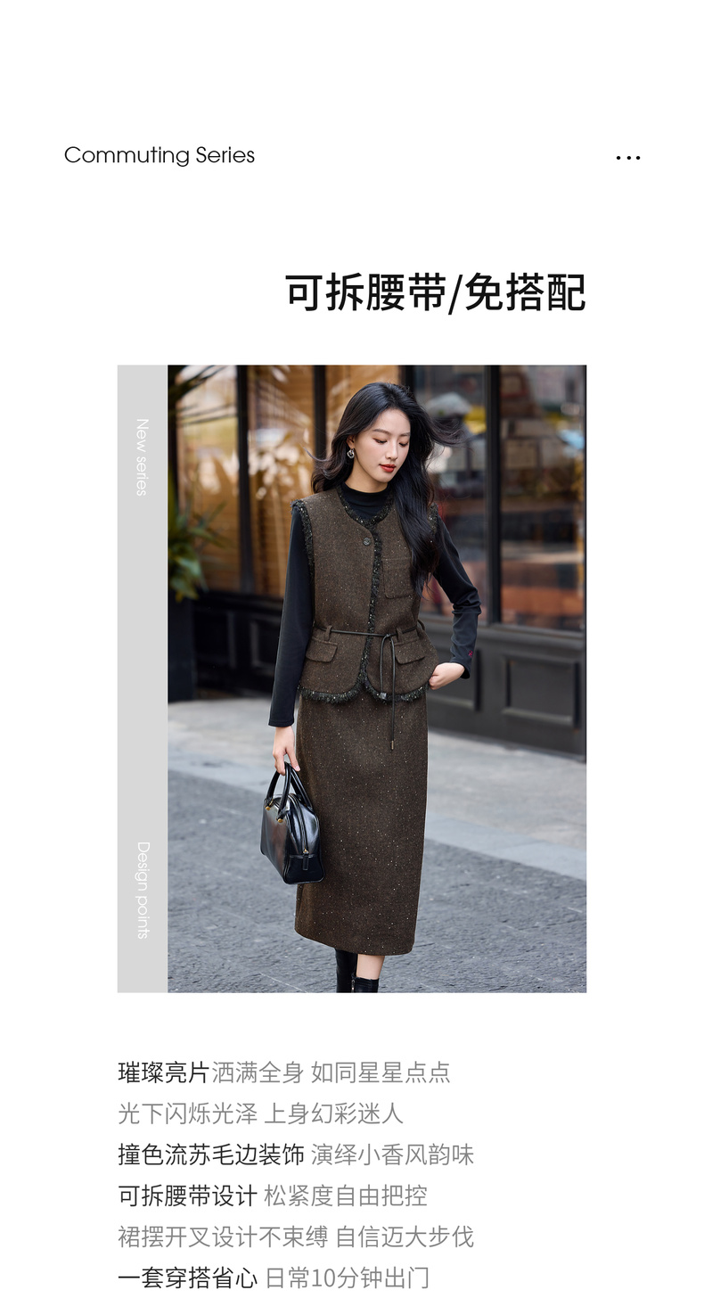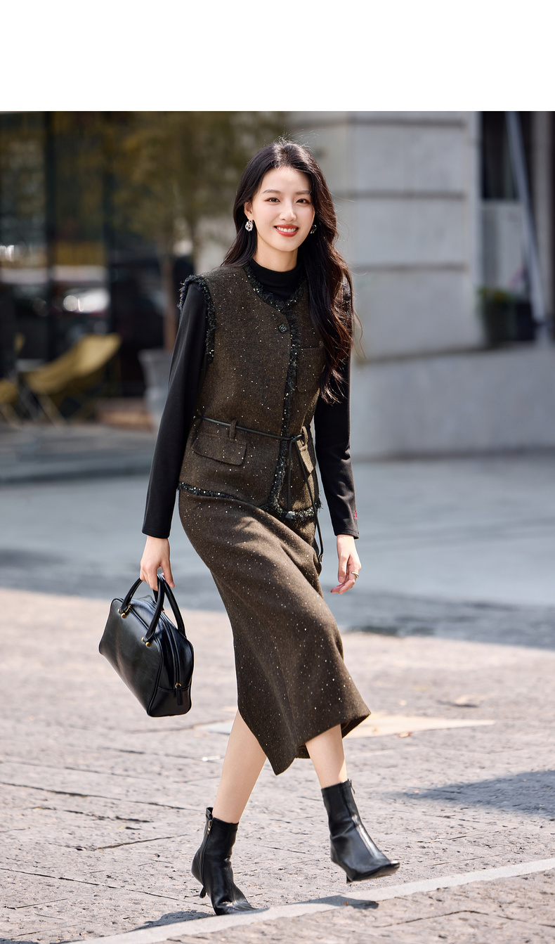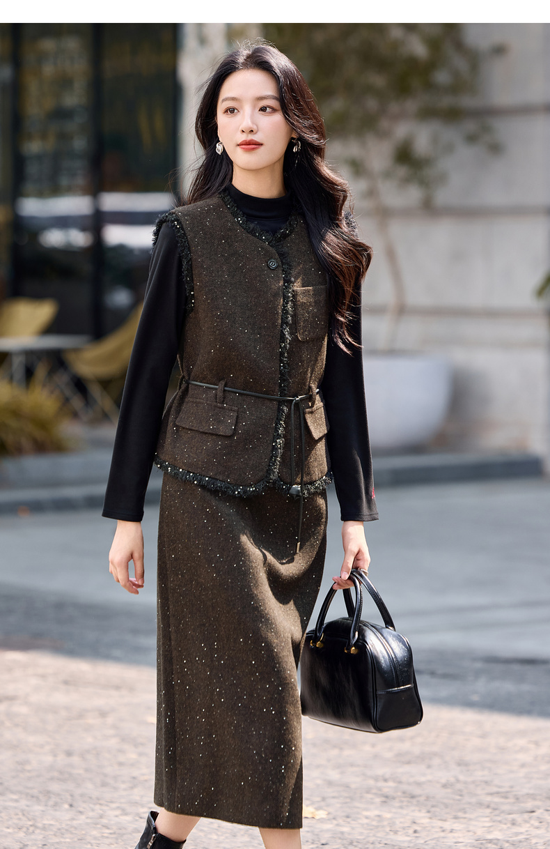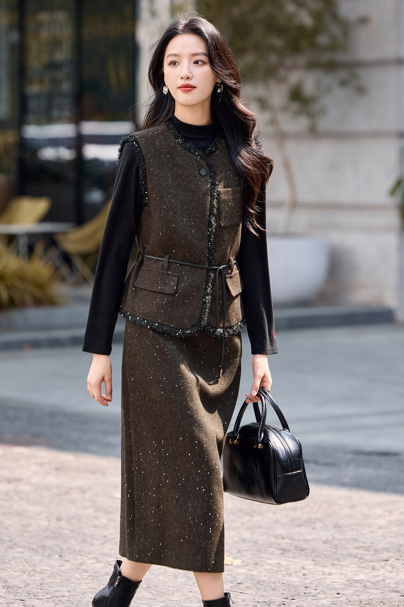 【内购】【免搭配套装】小香风亮片厚保暖可拆腰带马夹&高腰开叉A字半裙-154ZC4888