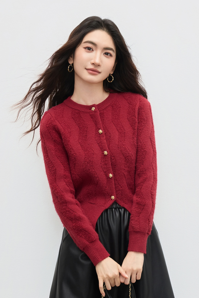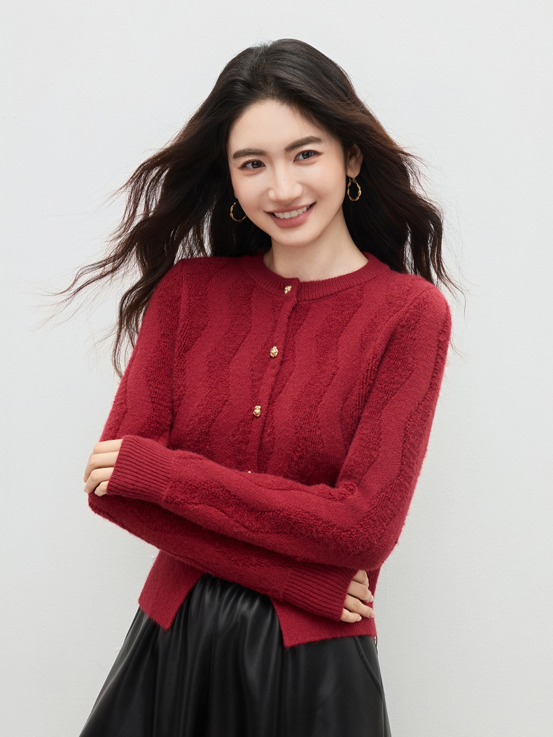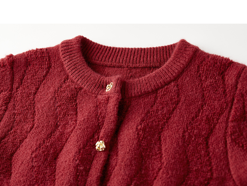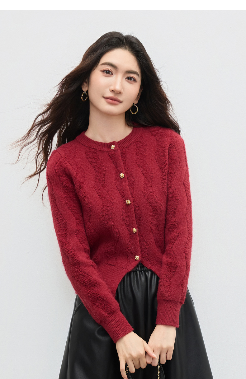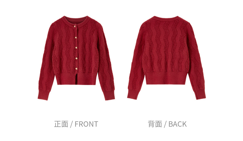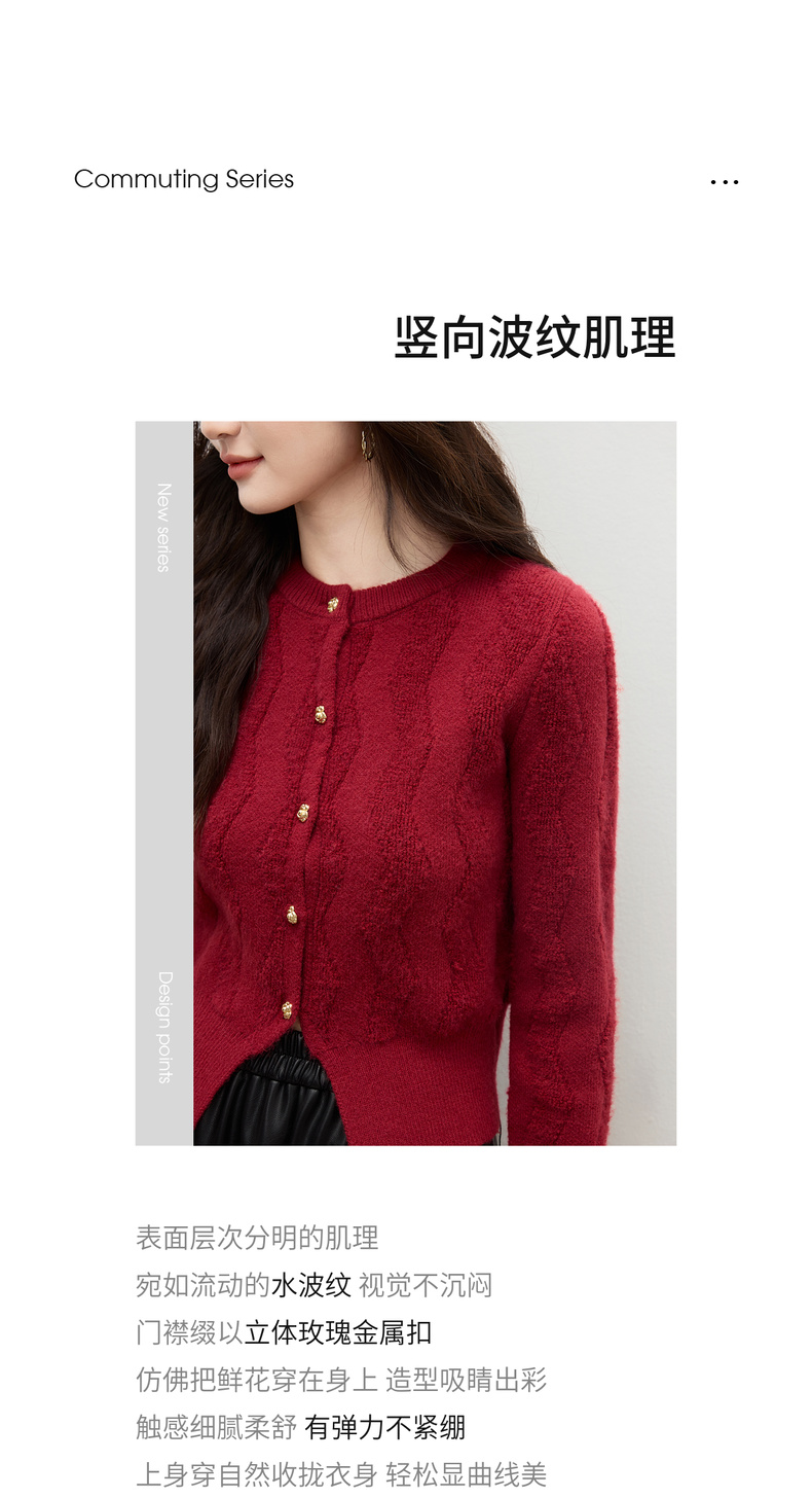 【内购】【波纹美学】优雅通勤氛围感圆领玫瑰金属扣修身弹力厚开衫毛衣-W54EB4145