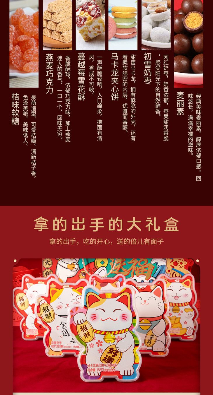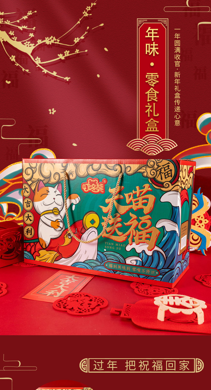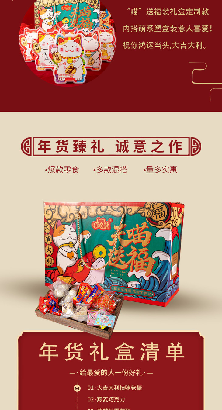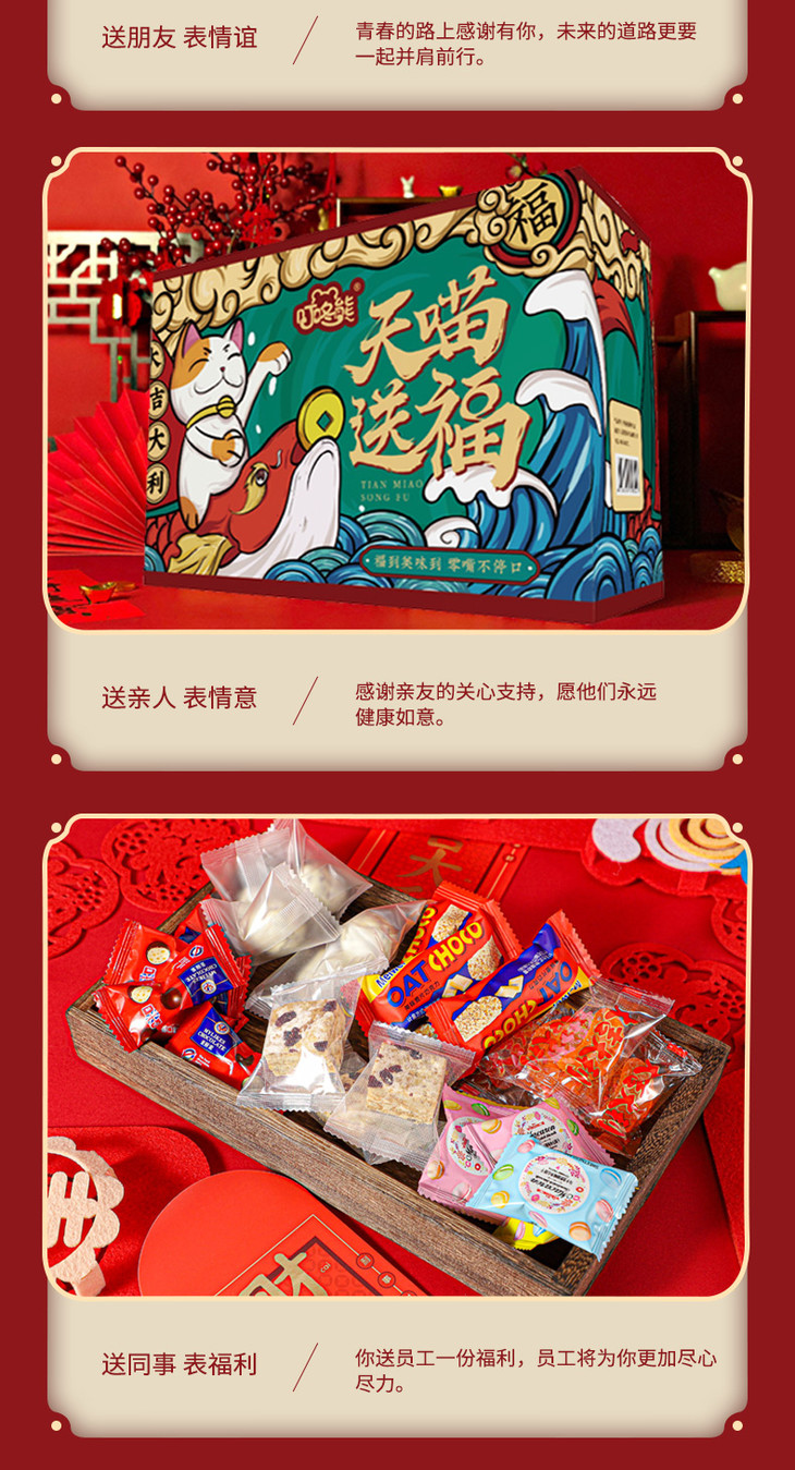 【年货零食大礼包】叮咚熊天喵送福礼包6款爆品零食精美包装送礼倍儿有面儿!桔味软糖/燕麦巧克力/蔓越莓雪花酥/马卡龙夹心饼干/奶枣/麦丽素