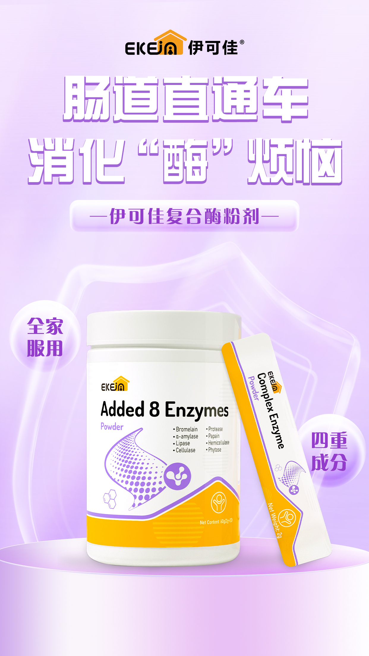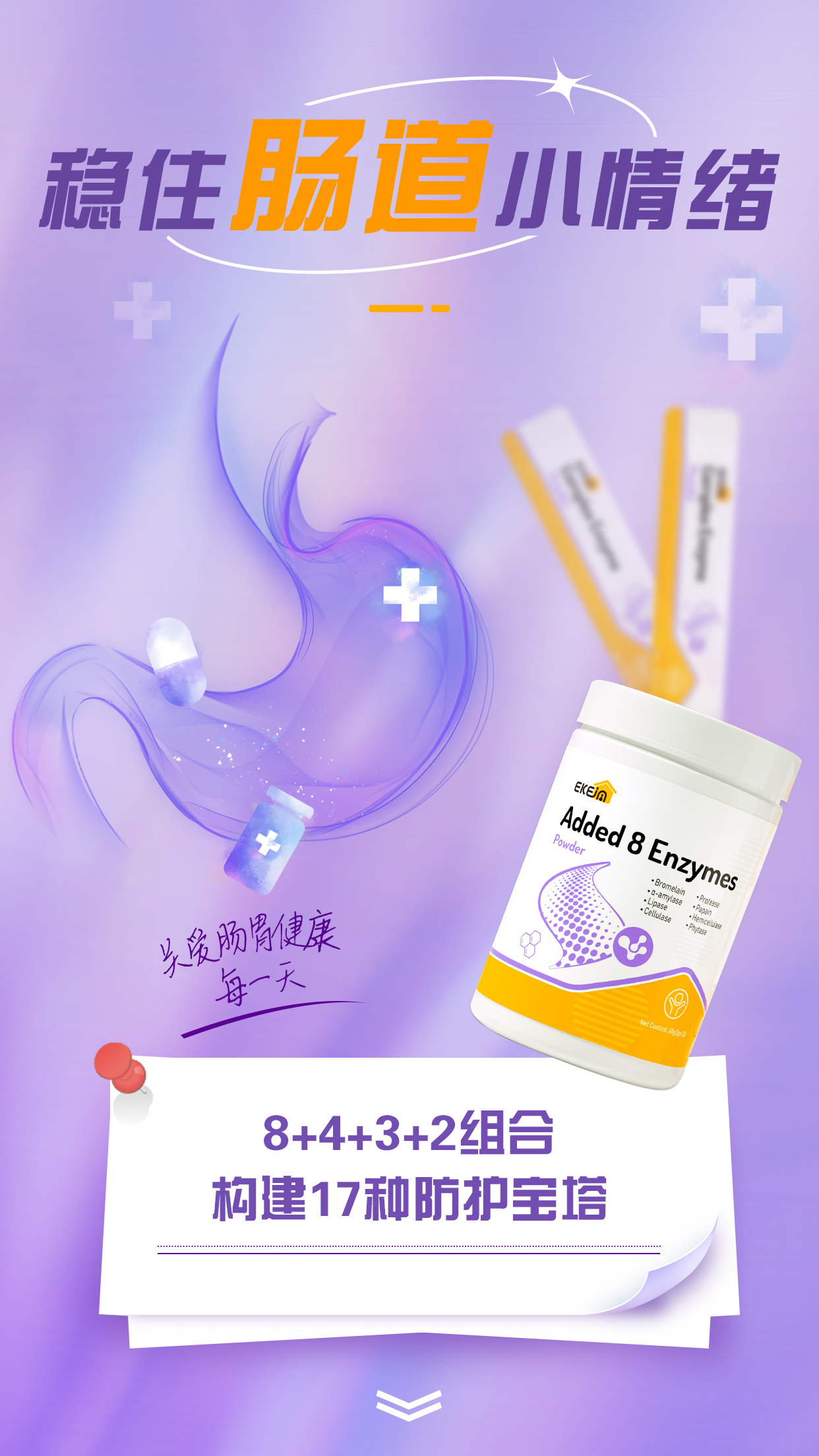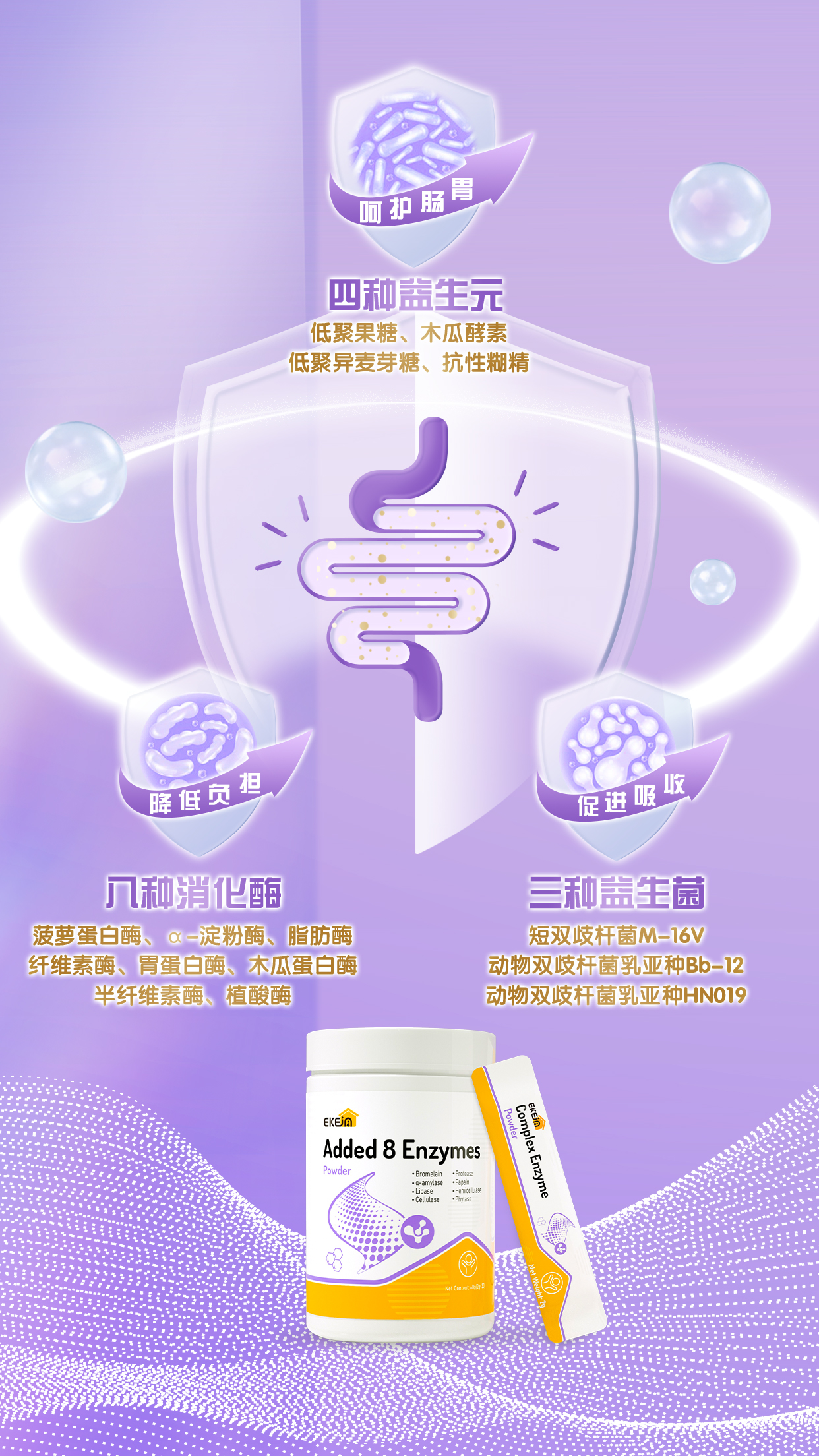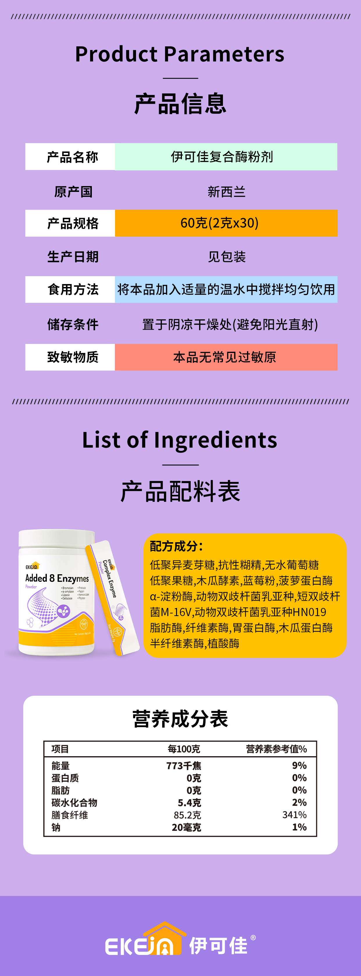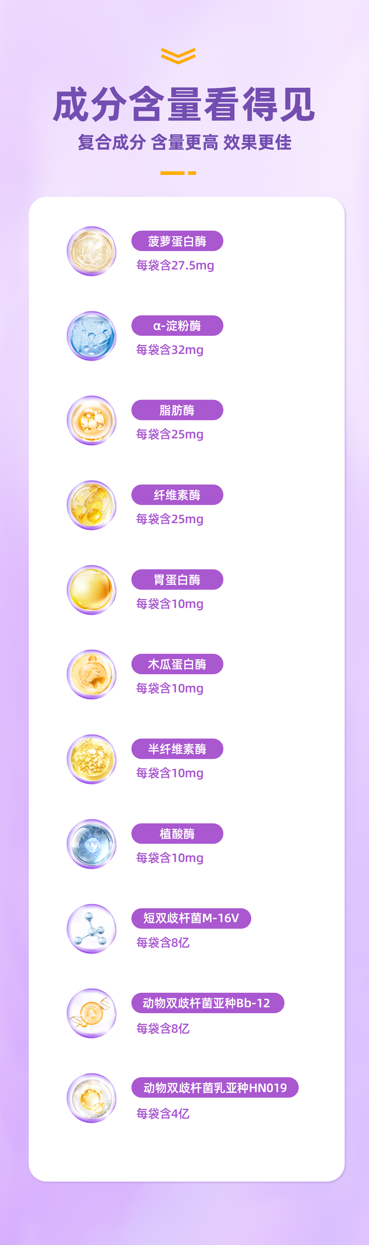 8种消化酶:菠萝蛋白酶27.5毫克、α-淀粉酶32毫克、脂肪酶25毫克、纤维素酶25毫克