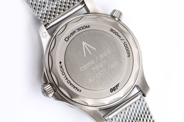 腕表的背面,并没有采用背透的规划,背面的一串数字。“0552”代表英国海军代码,“923 7697”指代潜水腕表,字母“A”表示配备旋入式表冠的腕表,而“007”是詹姆斯·邦德的特工代号。最终,数字“62”旨在问候榜首部007系列电影《007之诺博士》(Dr No)的上映年份。这一串数字,关于007系列的影迷来说,有着别样的情怀。底盖刻字明晰,底盖边际字体不是薄薄的一层填涂,而是一层涂料的刻字非常具有立体感。底盖内部同样有明晰的刻字,VS工厂果然不会偷工减料,细节之处到位。