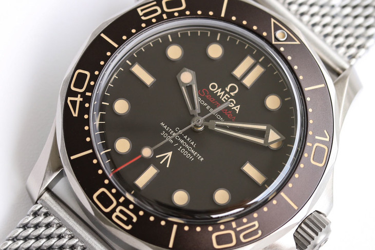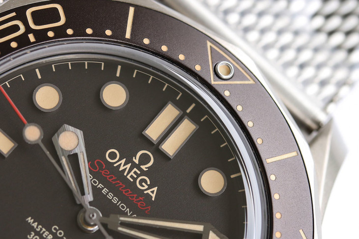 VS厂欧米茄海马系列钛金属材质无暇赴死复刻腕表的外圈是铝合金原料而不是陶瓷制成,同样的盘面也是铝合金原料,整体偏磨砂的作用,外圈刻度深浅有致, 搭配棕色的时标刻度,呈现出复古表款历经年月所展示的“tropical”色彩,在色彩上与原版并无色差,而且外圈刻度对准盘面内时标,细节处到位。