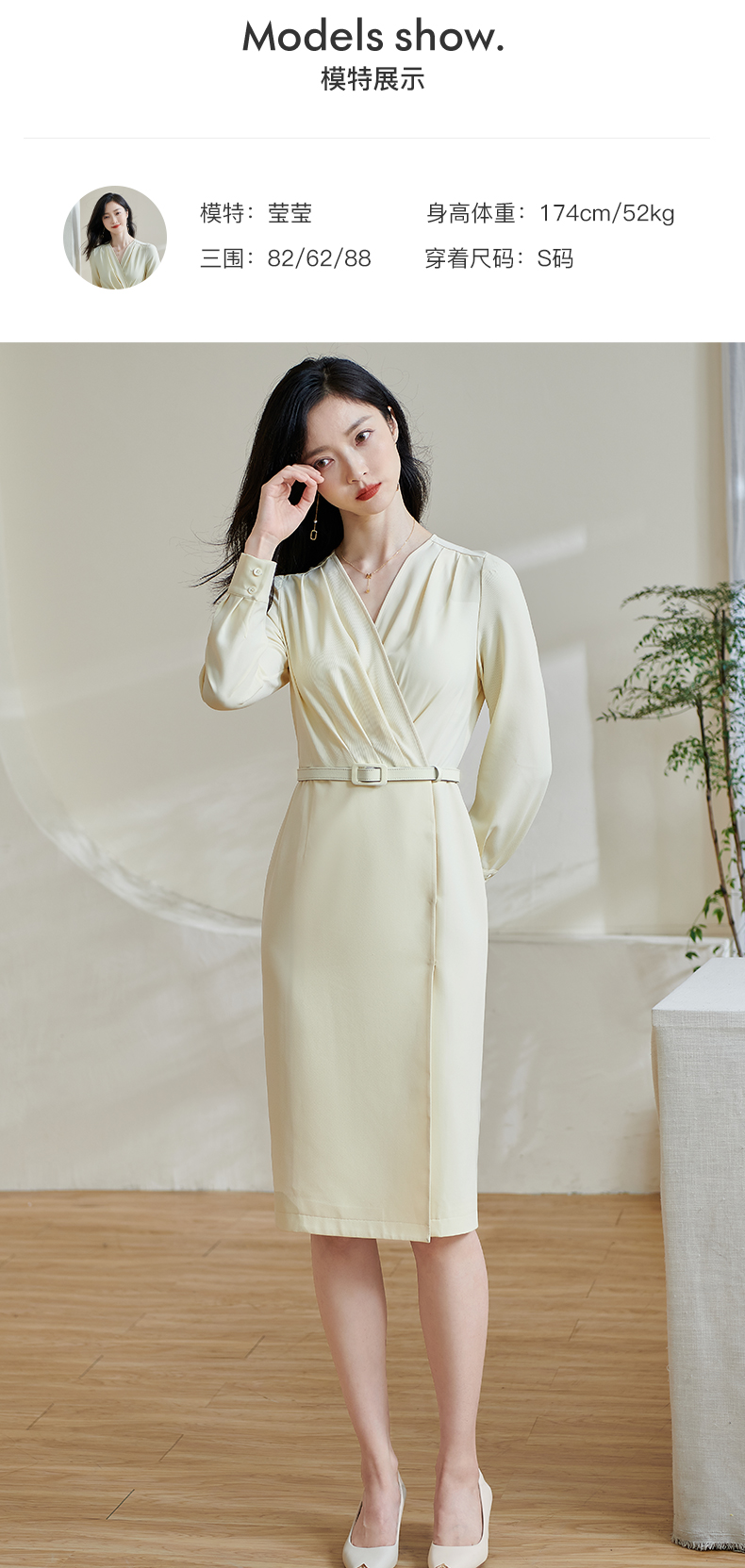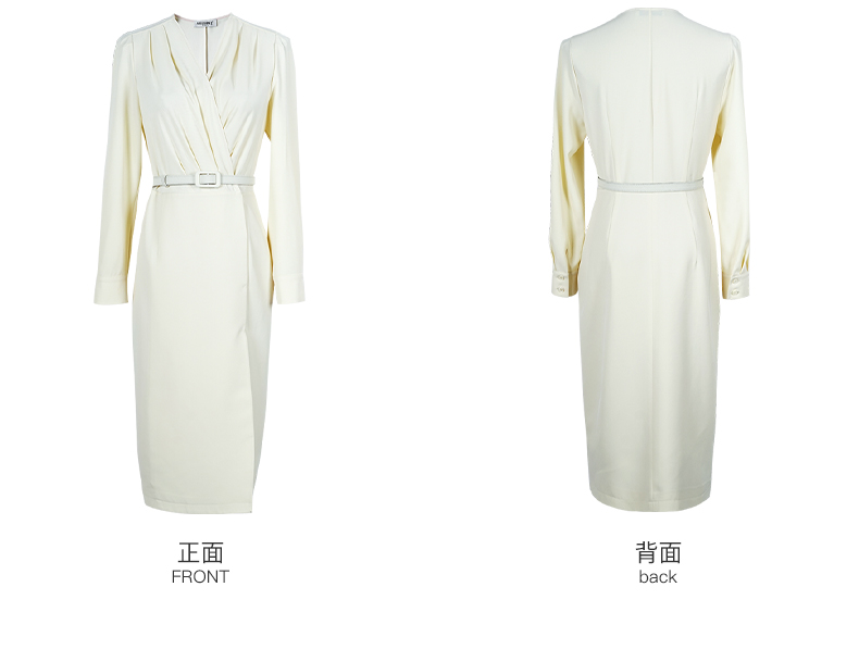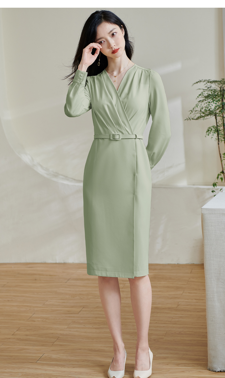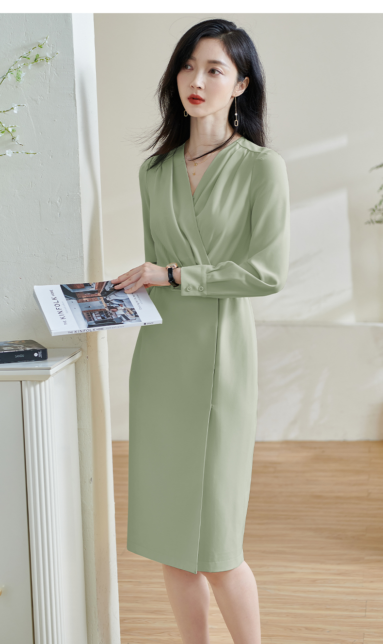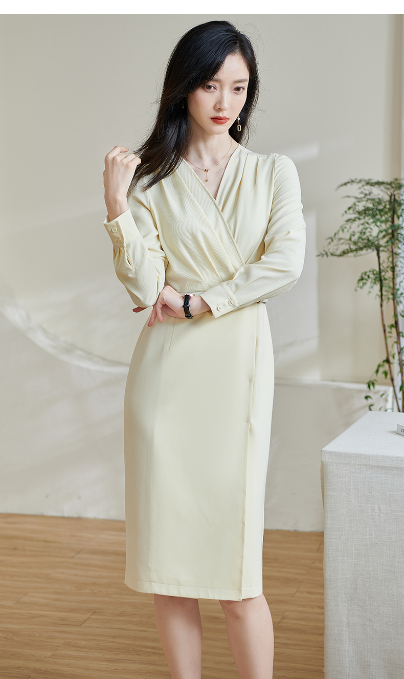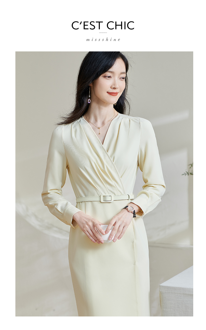 米思阳2026春季新款气质高级感收腰连衣裙v领褶皱修身一步裙0517