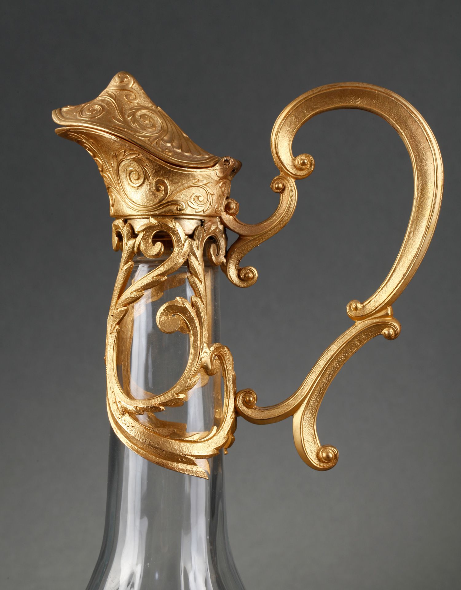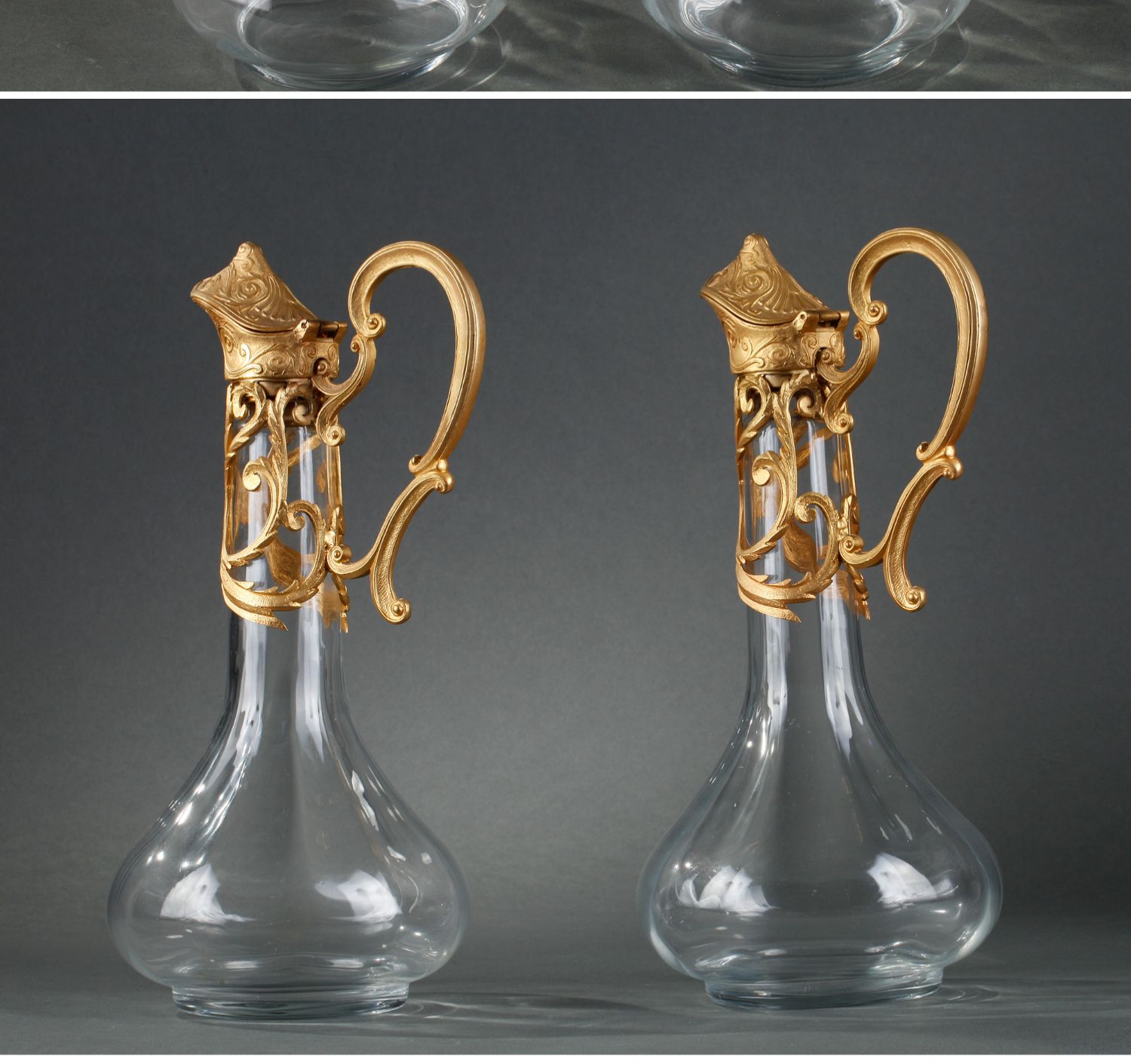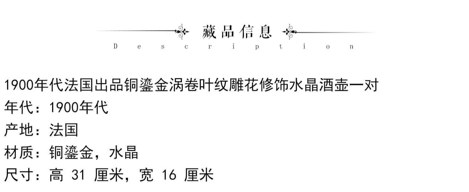 独角鹿西洋古董摆件法国铜鎏金涡卷叶纹雕花水晶酒壶一对