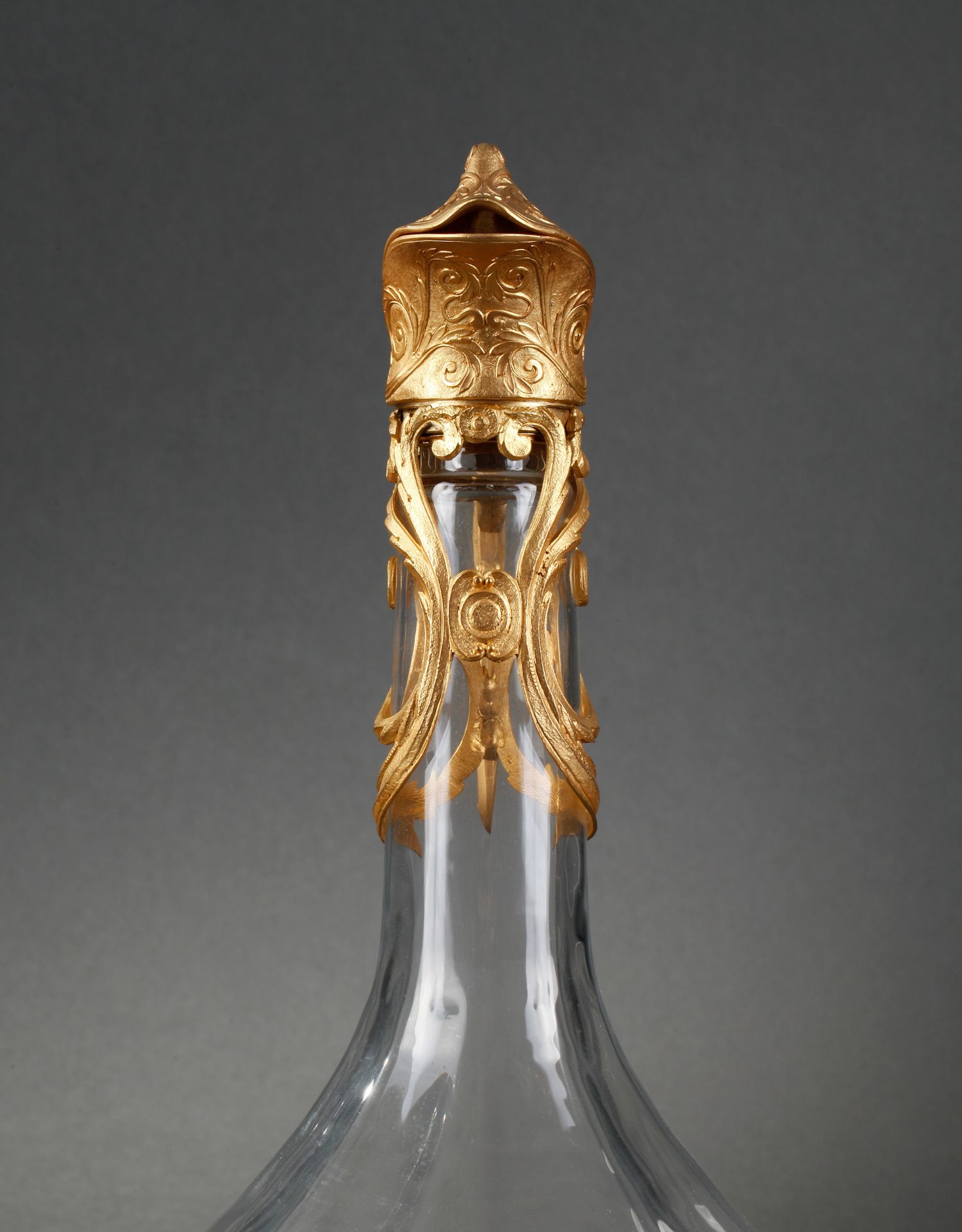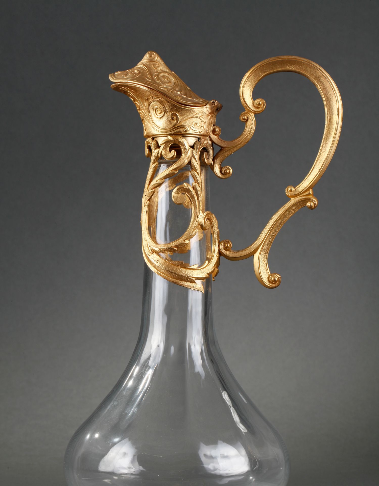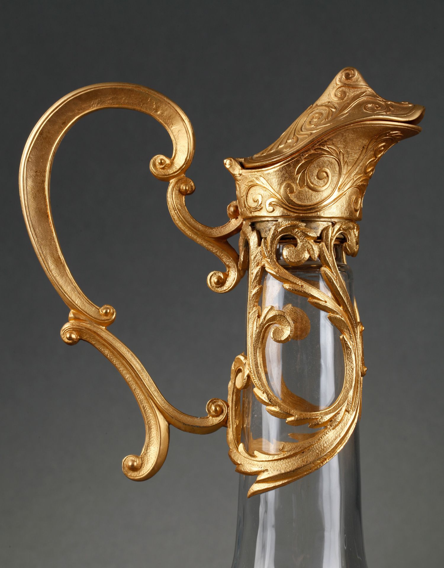 独角鹿西洋古董摆件法国铜鎏金涡卷叶纹雕花水晶酒壶一对