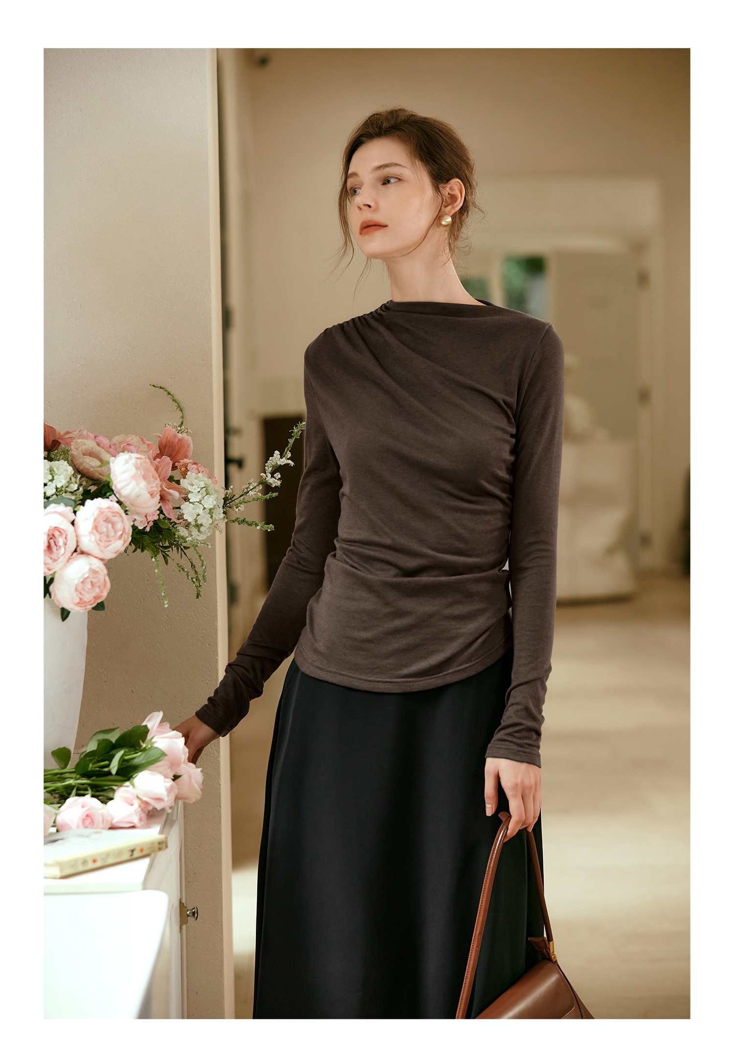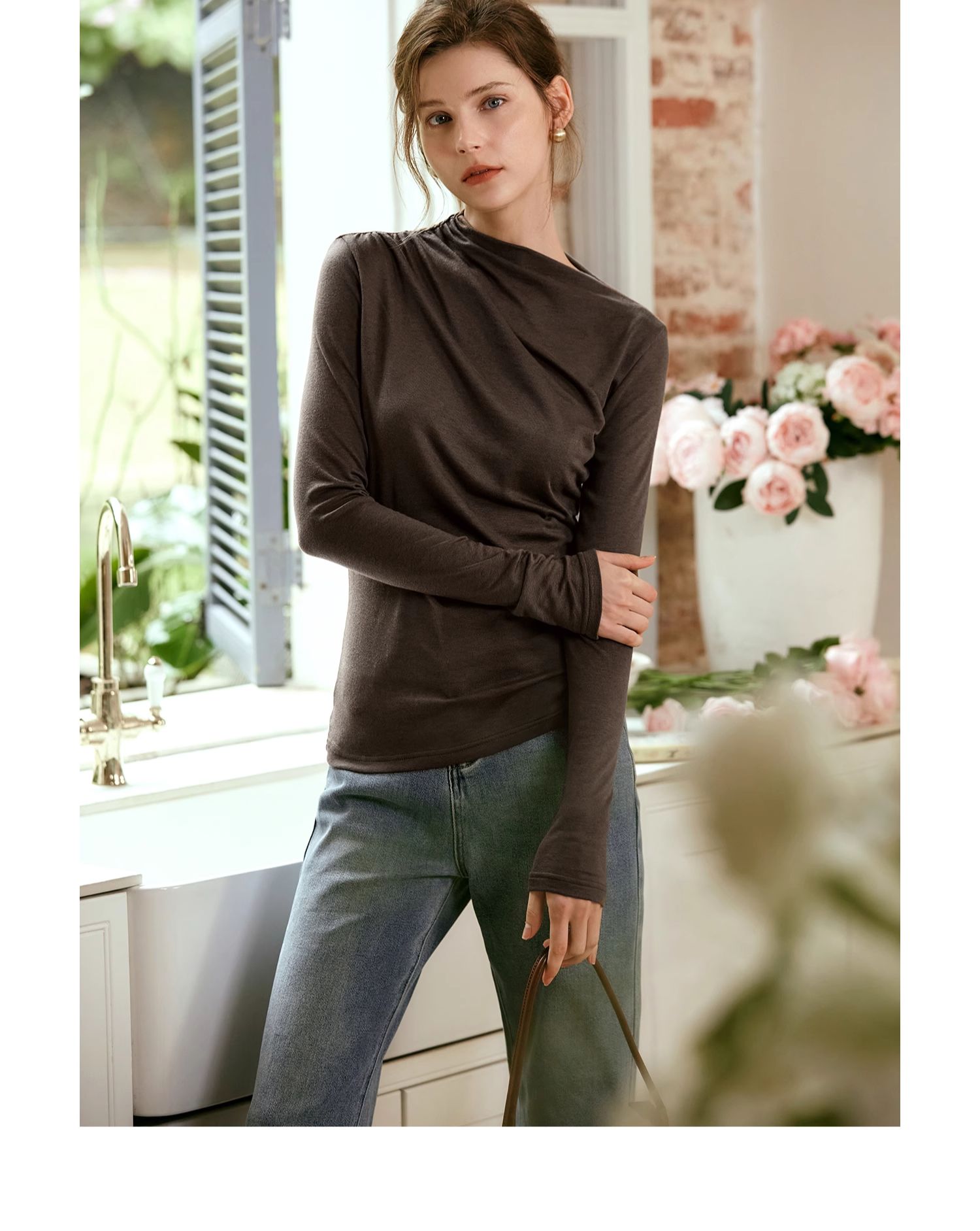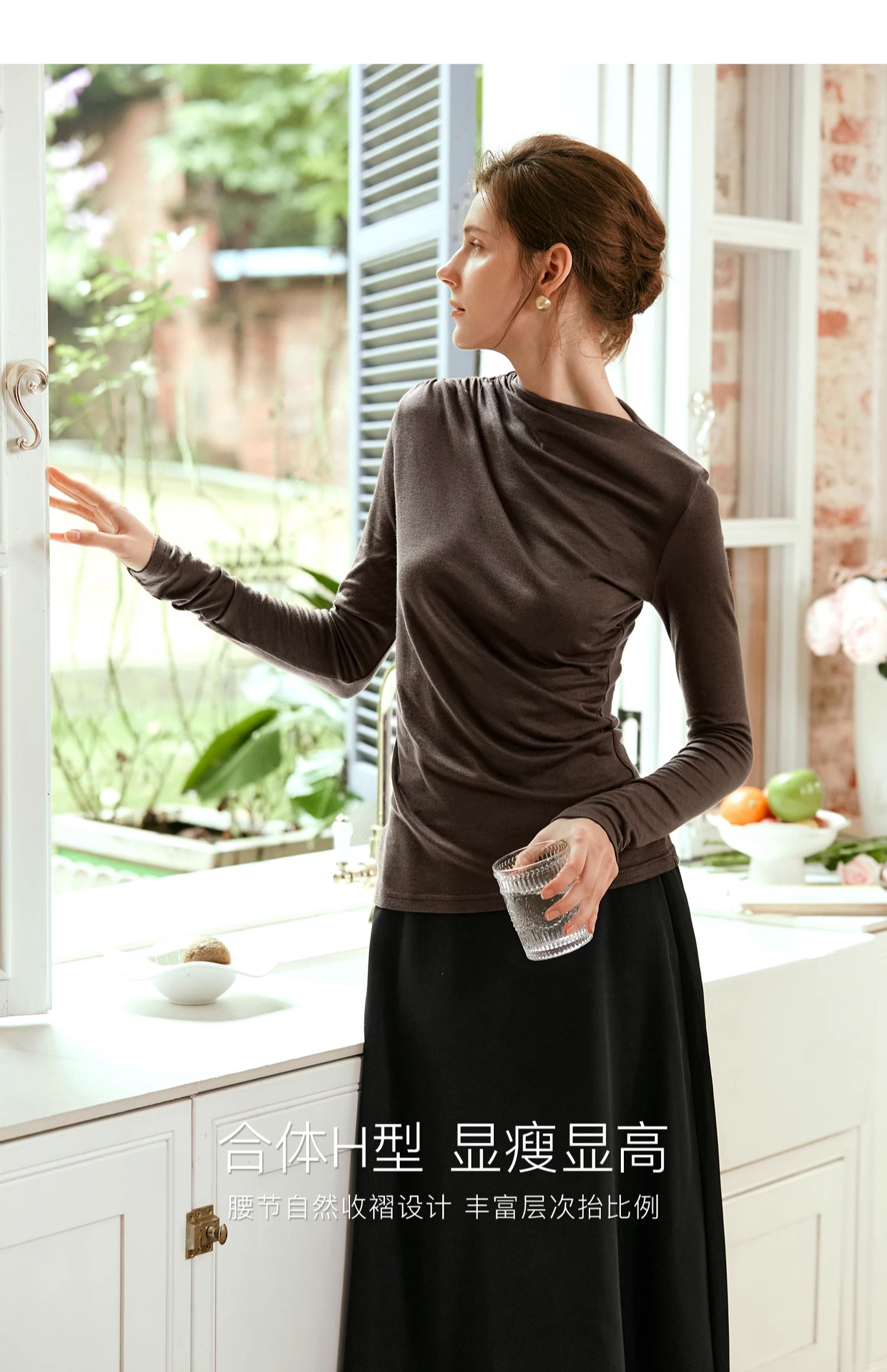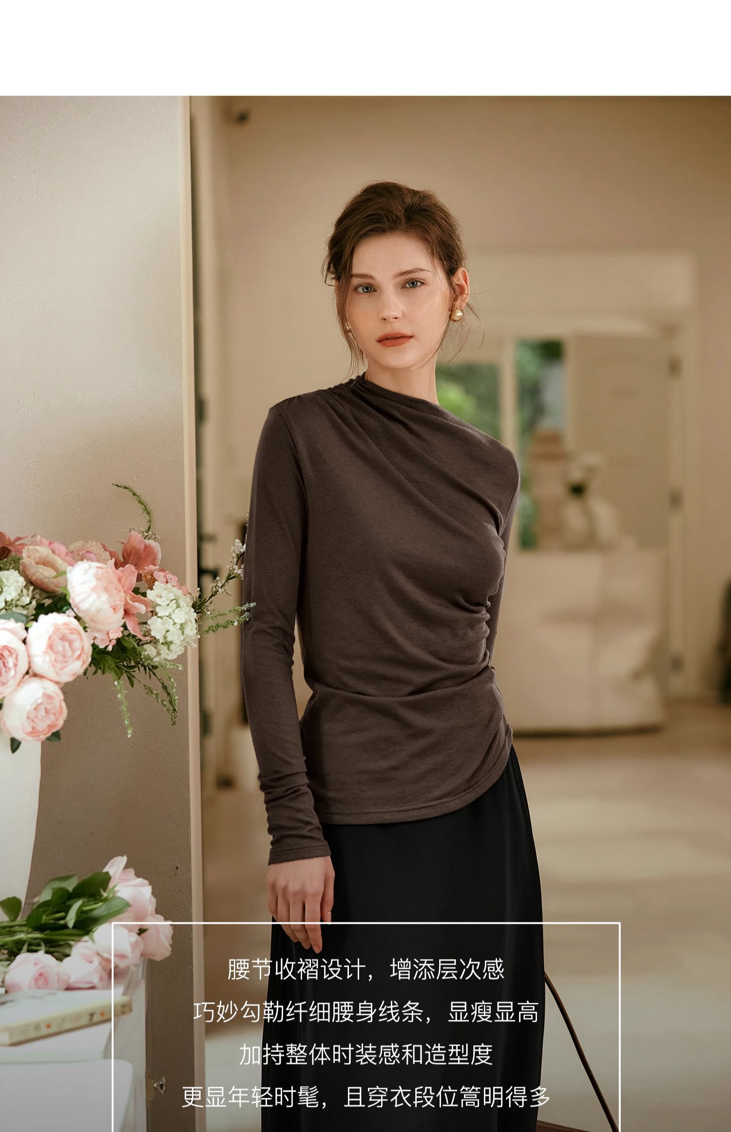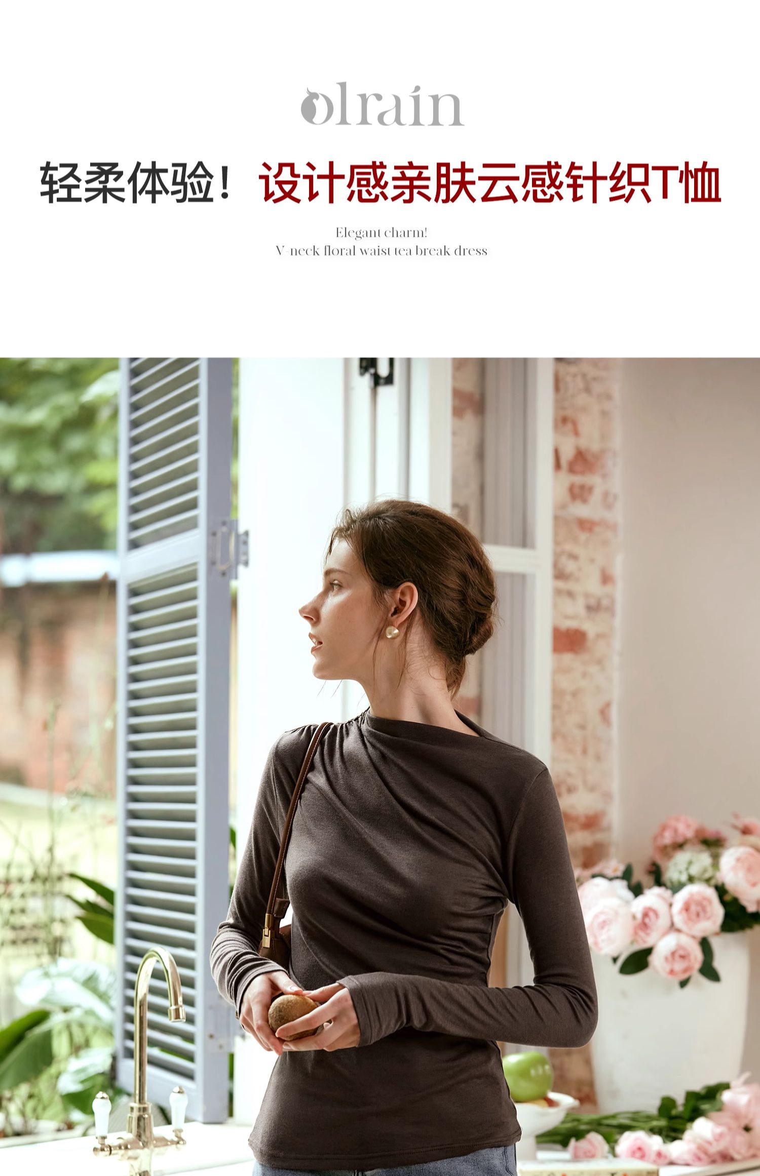 OLrain欧芮儿咖色长袖针织衫女早秋2024年新款褶皱修身打底上衣