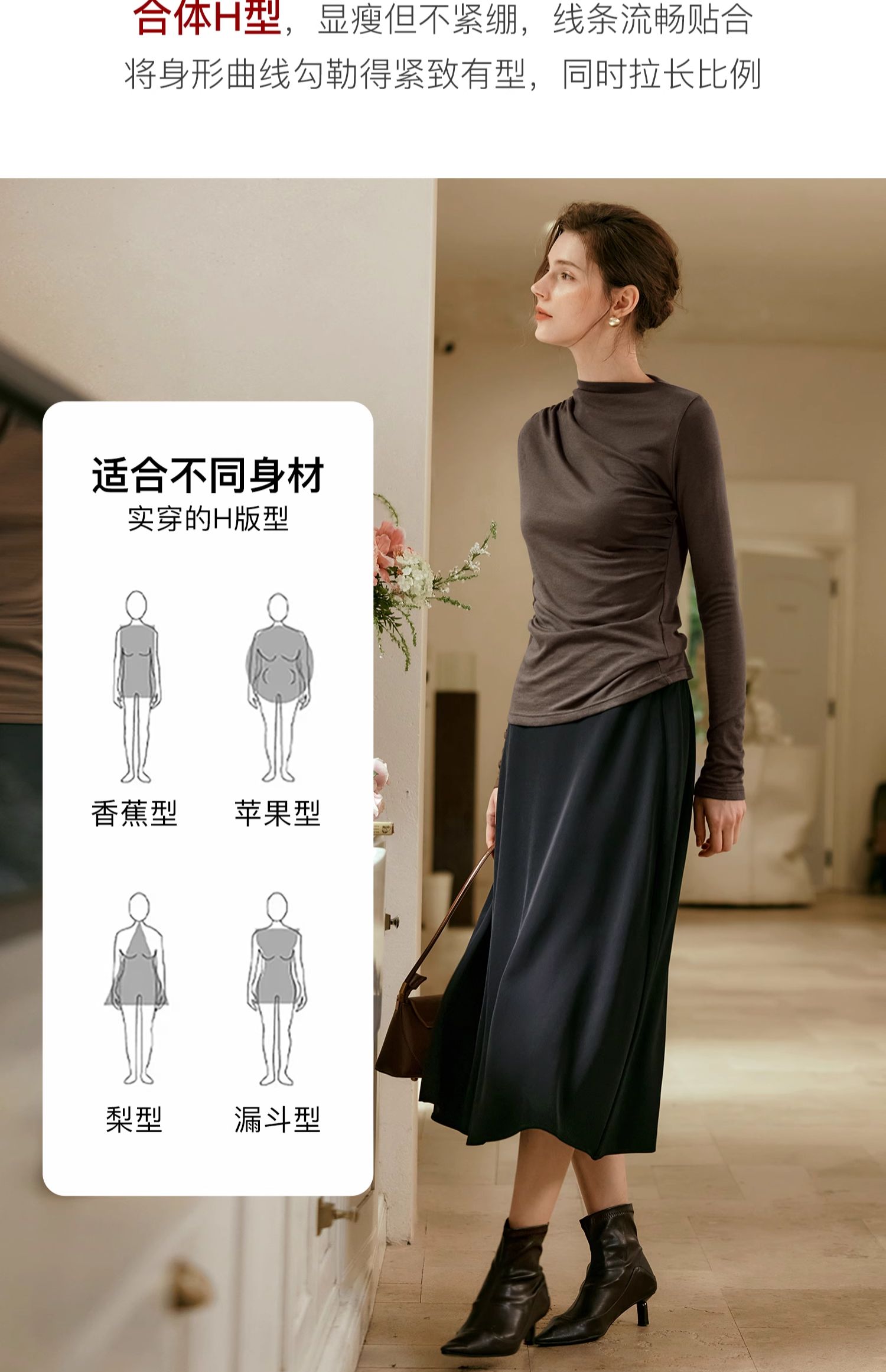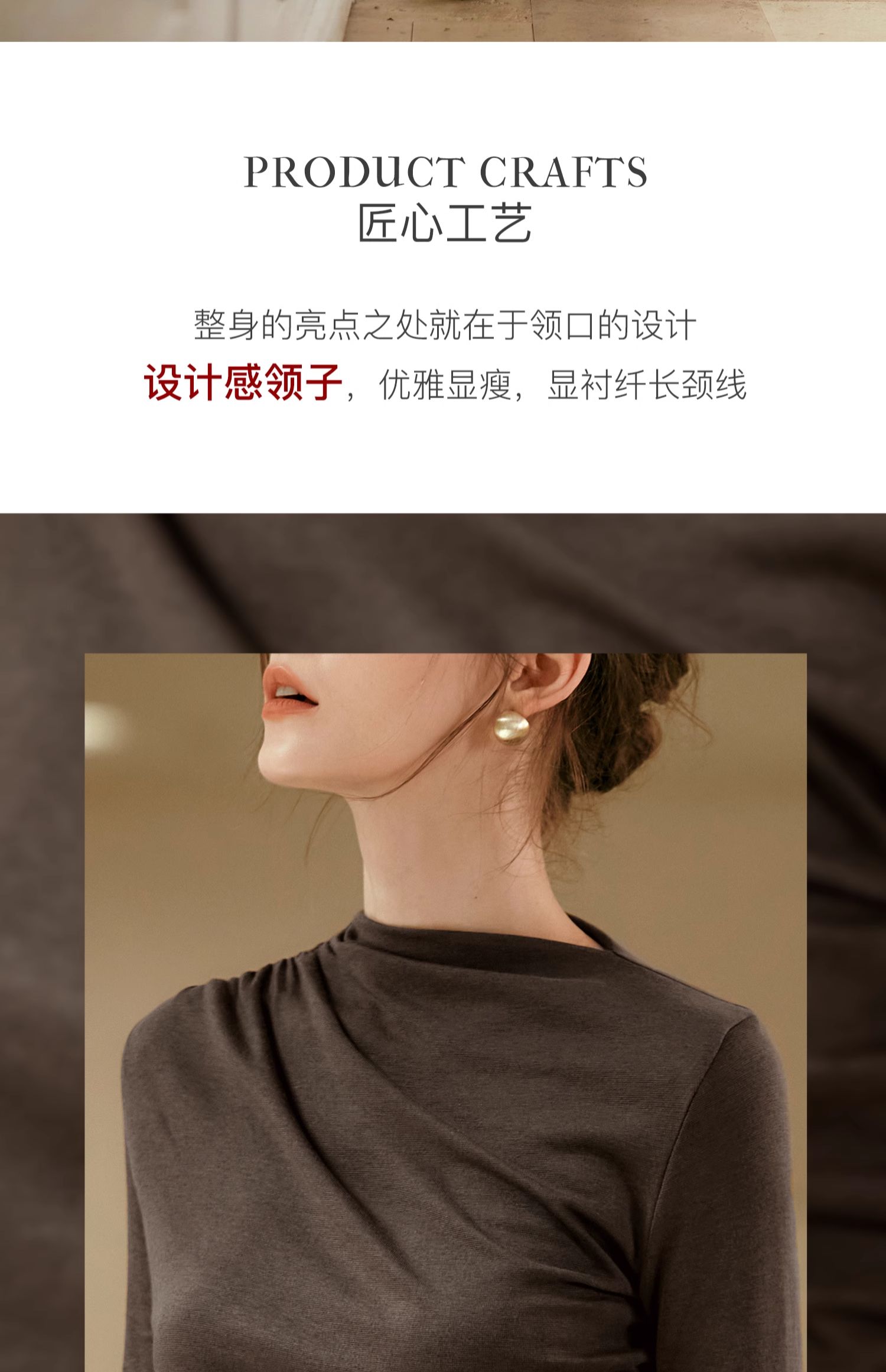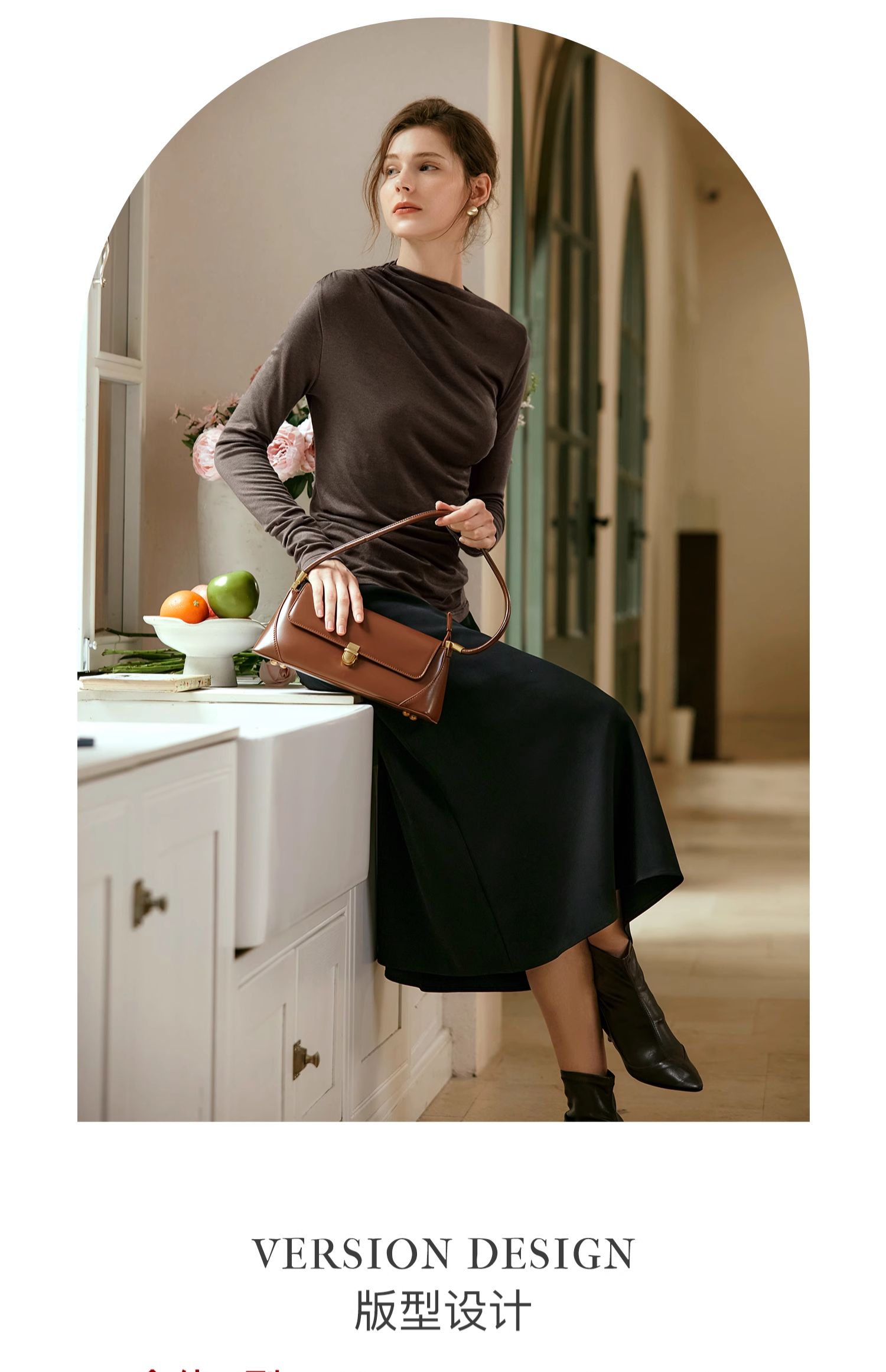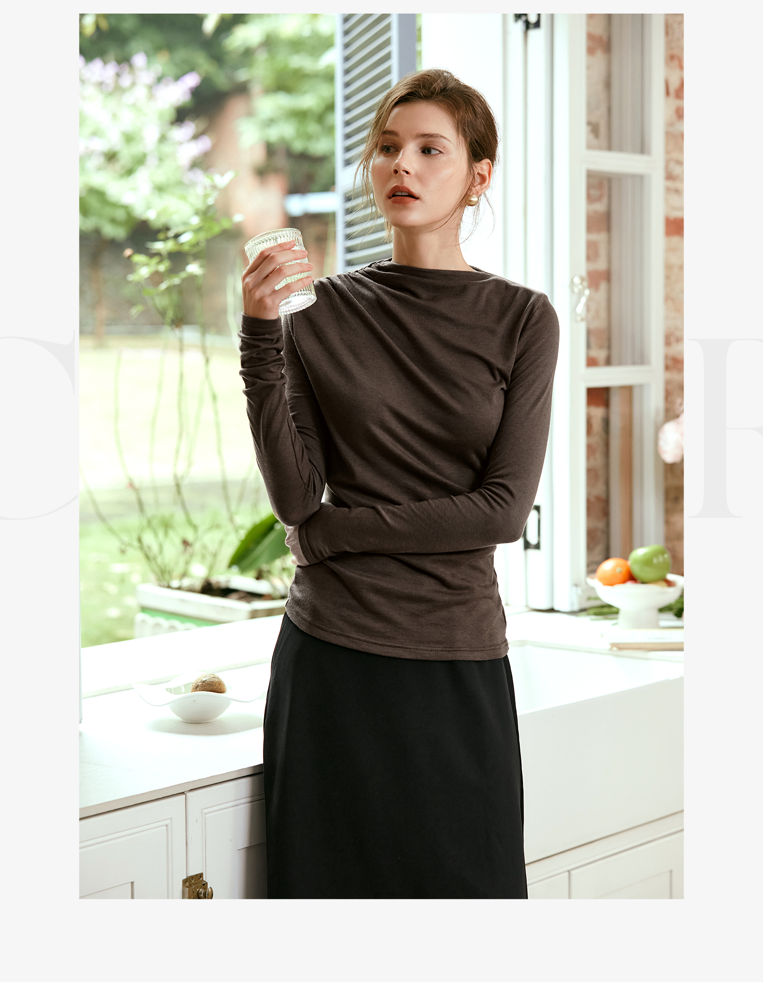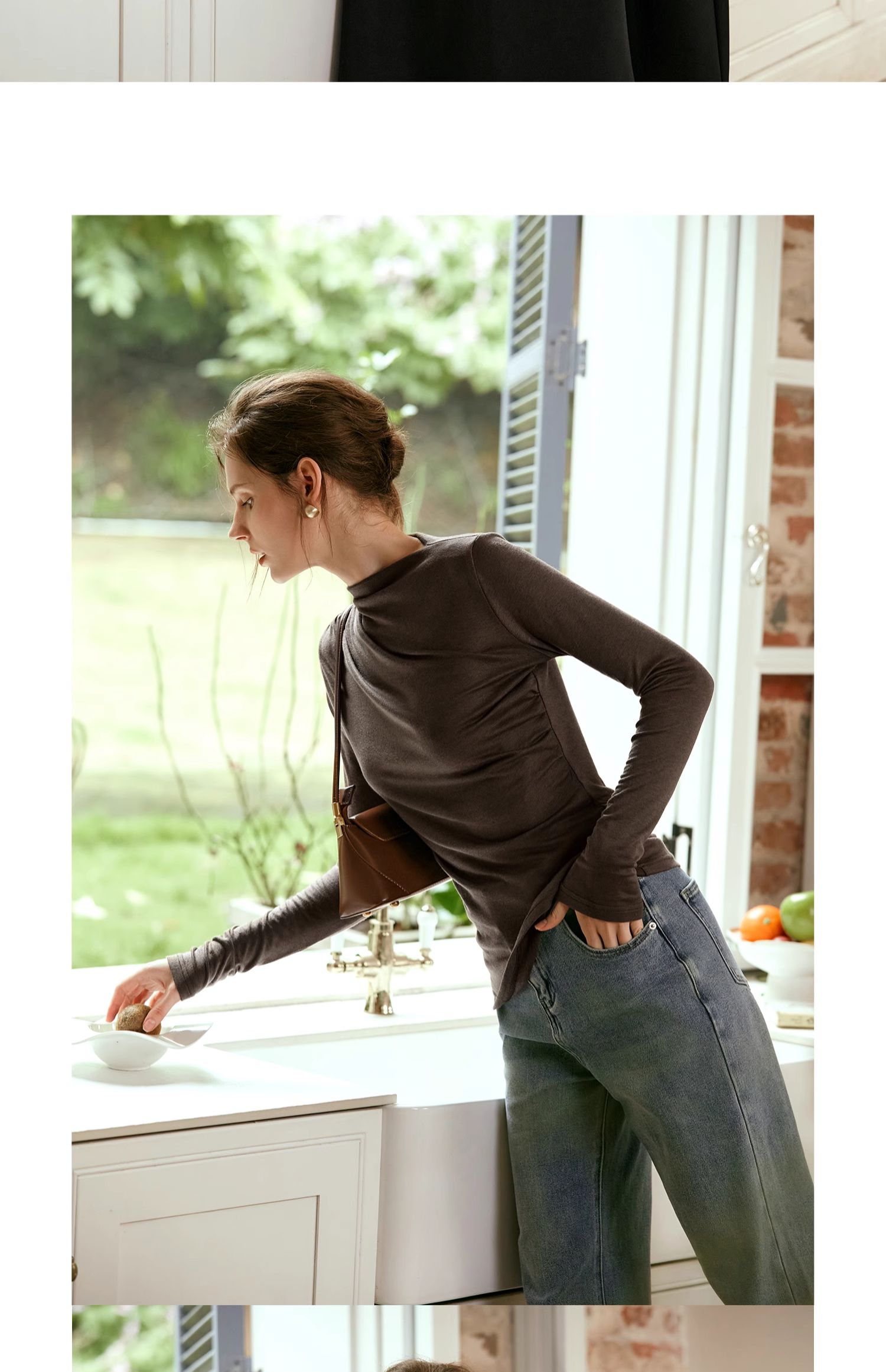 OLrain欧芮儿咖色长袖针织衫女早秋2024年新款褶皱修身打底上衣