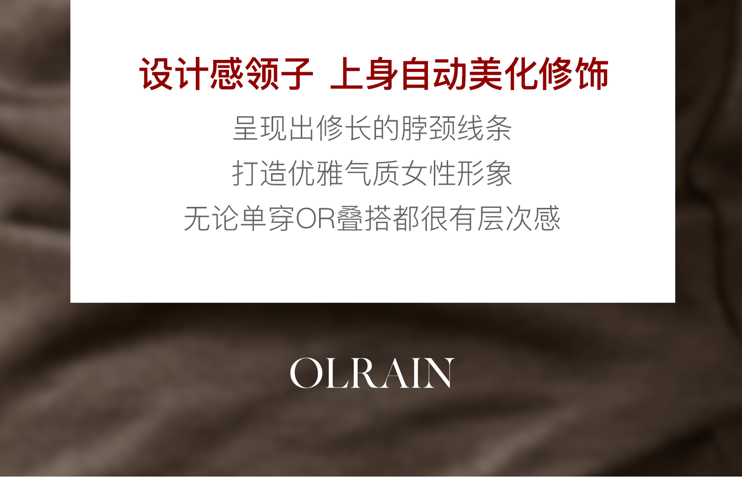 - “精致”是欧芮儿olrain品牌文化的核心,欧芮儿认为,精致的女人,不但要外在动人,更要内在迷人,内外兼修,有魅力、有气质、有内涵,自信而不自傲,优雅而不矫揉,自有万种风情而不轻浮,更不故作矜持。