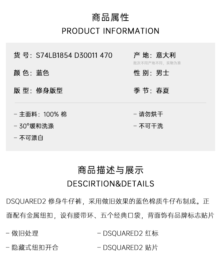 DSQUARED2 男士字母徽标贴片做旧休闲牛仔裤 蓝色 S74LB1854 D30011 470