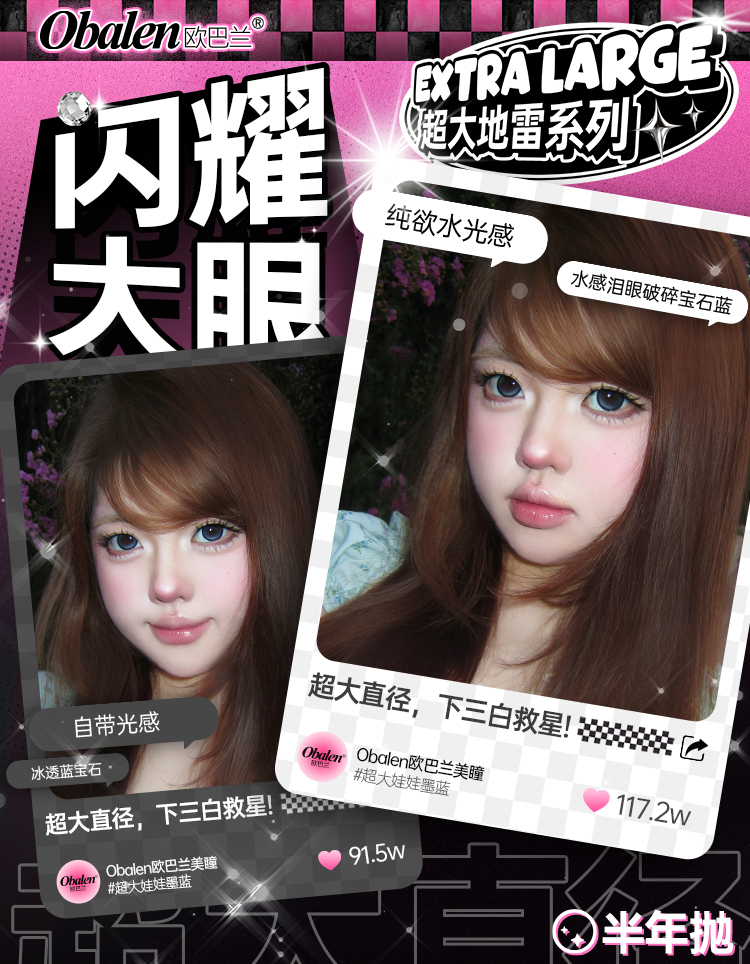 新品【超大地雷方盒系列】超大娃娃墨蓝14.5【买即送护理液】Obalen欧巴兰无感扩瞳漫画大眼半年抛2片装