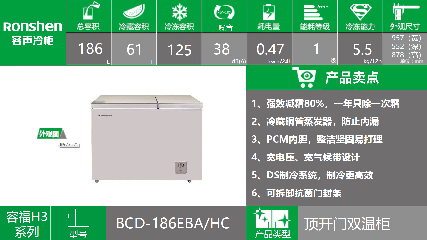 容声 冰柜 BCD-186EBA/HC 186升 金色玻璃 DS制冷系统 双温双控 冷藏可单独关闭