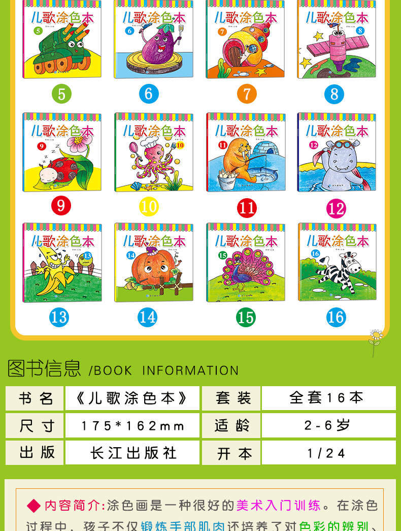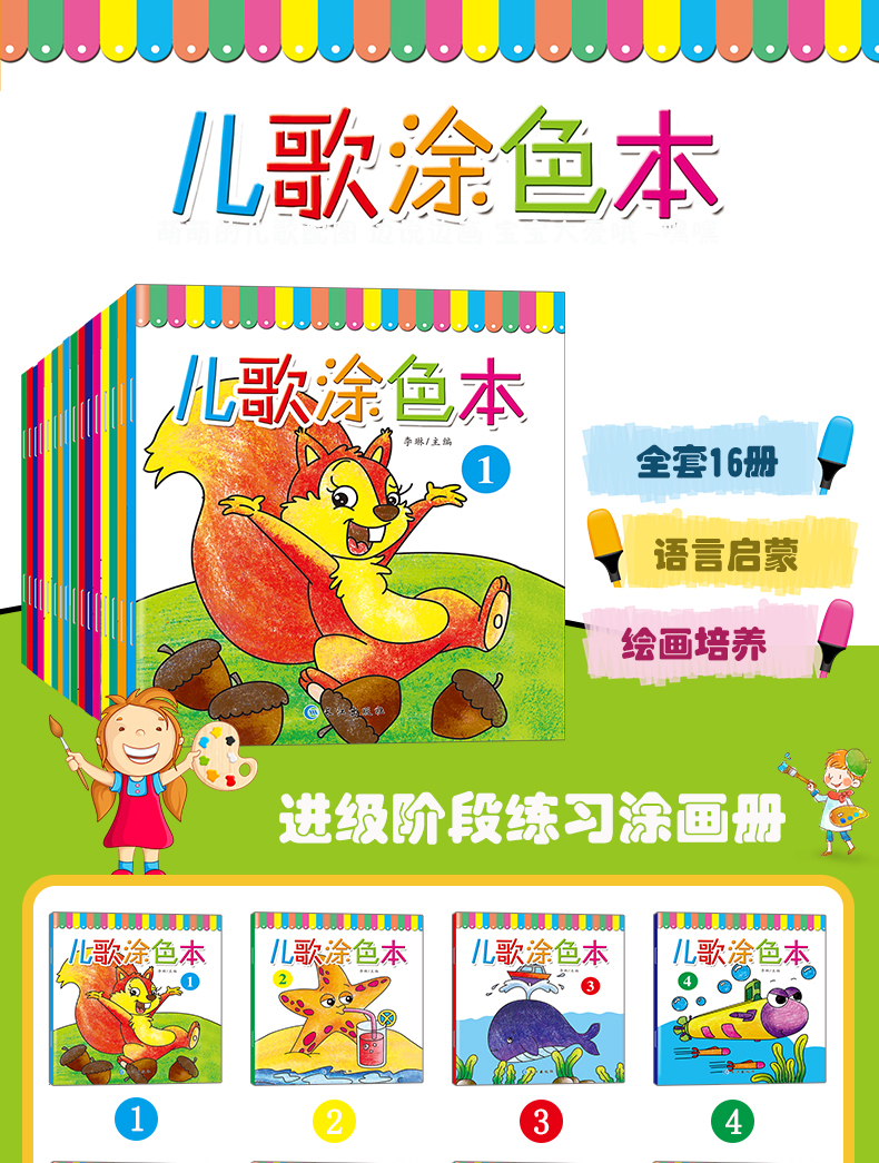 【全十六册】儿歌涂色本绘画培养艺术色彩认知精美彩图趣味儿童文学绘本幼儿早教语言启蒙家庭亲子教育绘本排行畅销书正版