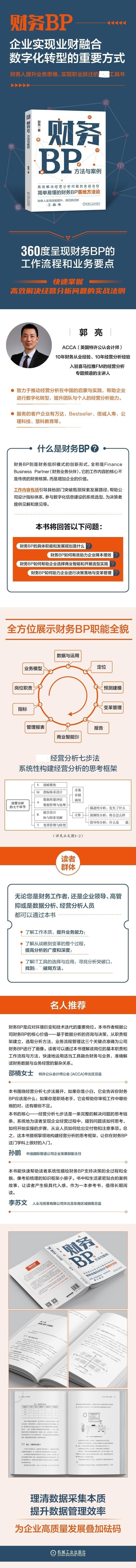 全面涵盖财务BP不可不知的十个方面:定位、岗位职责、业务模型、指标、数据与运用、管理报表、商业智能BI、报告、变革管理、预测建模。360度呈现财务BP的工作流程和步骤,涉及对职业定位、岗位内容和工作方法的全方位剖析和讲解。丰富的案例精华汇集。提供了大量的实战案例,读者可以从中获得启发,找到属于自己的一套全新的业财融合工作方法。