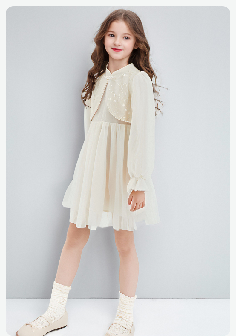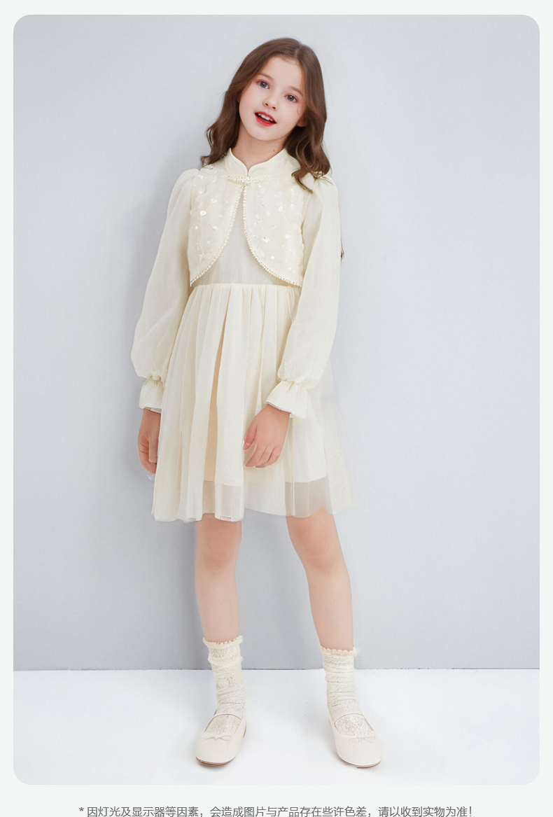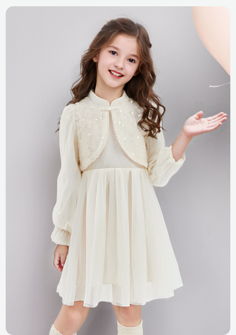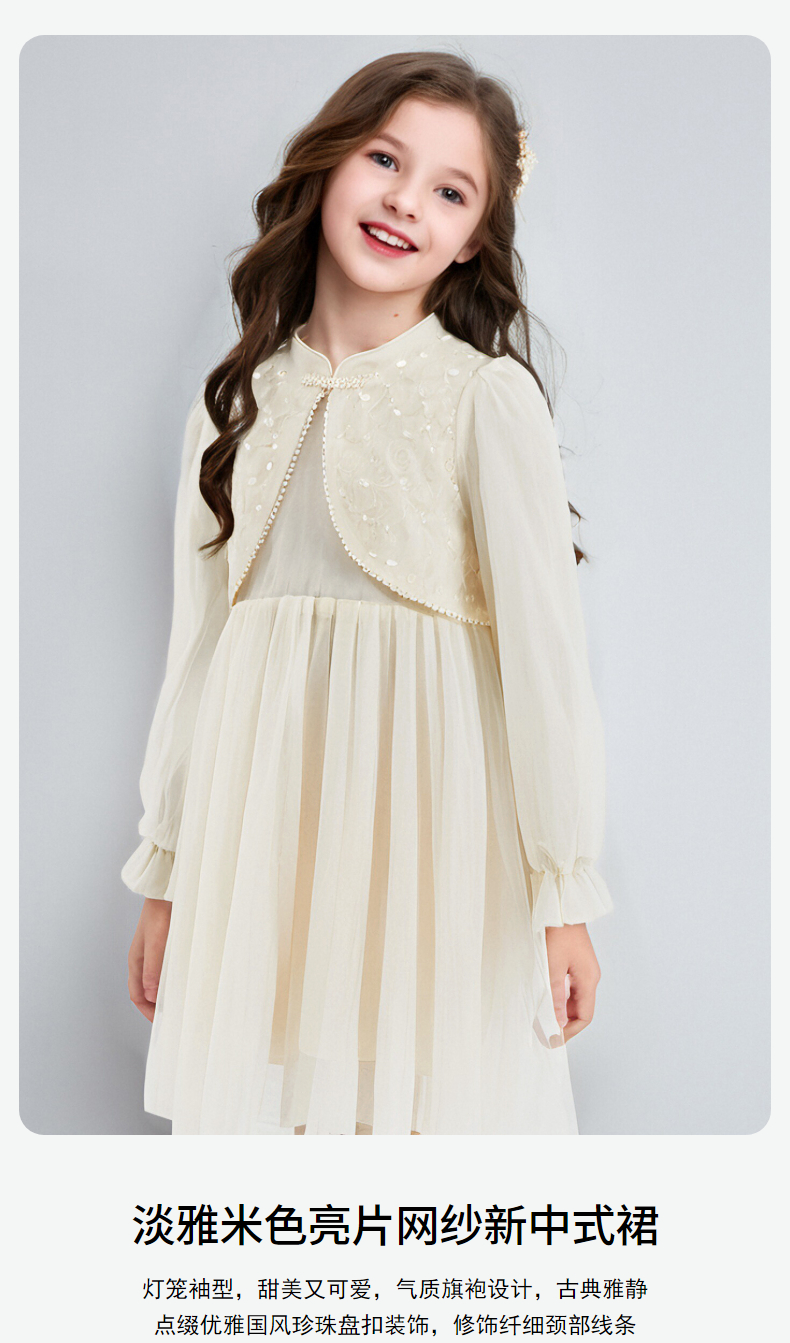 笛莎Deesha 连衣裙2024秋季新款中童淡雅米色亮片网纱新中式裙