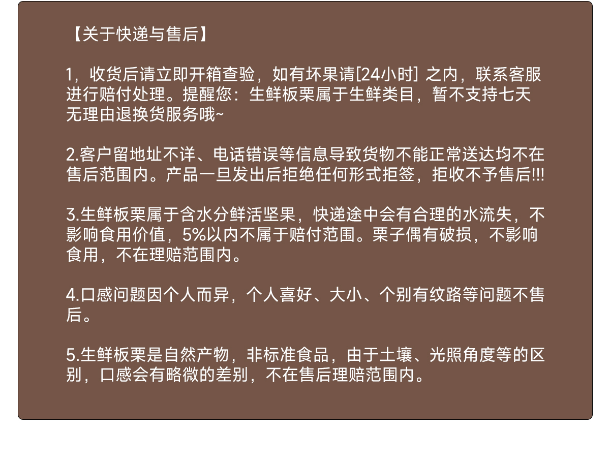 7、板栗是自然产物,非标准食品,由于土壤、光照角度等的区别,口感会有略微的差别,不作为售后理由。