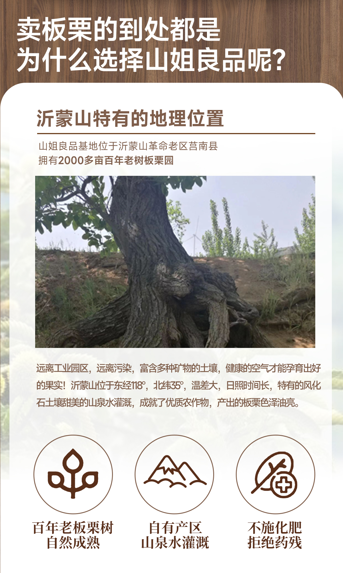 1、来自沂蒙山百年老树板栗,自有基地5000亩百年老树板栗园,板栗树不打药不施肥不浇水,是纯天然绿色生长、正宗野生的石生山栗子;