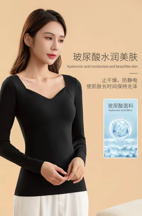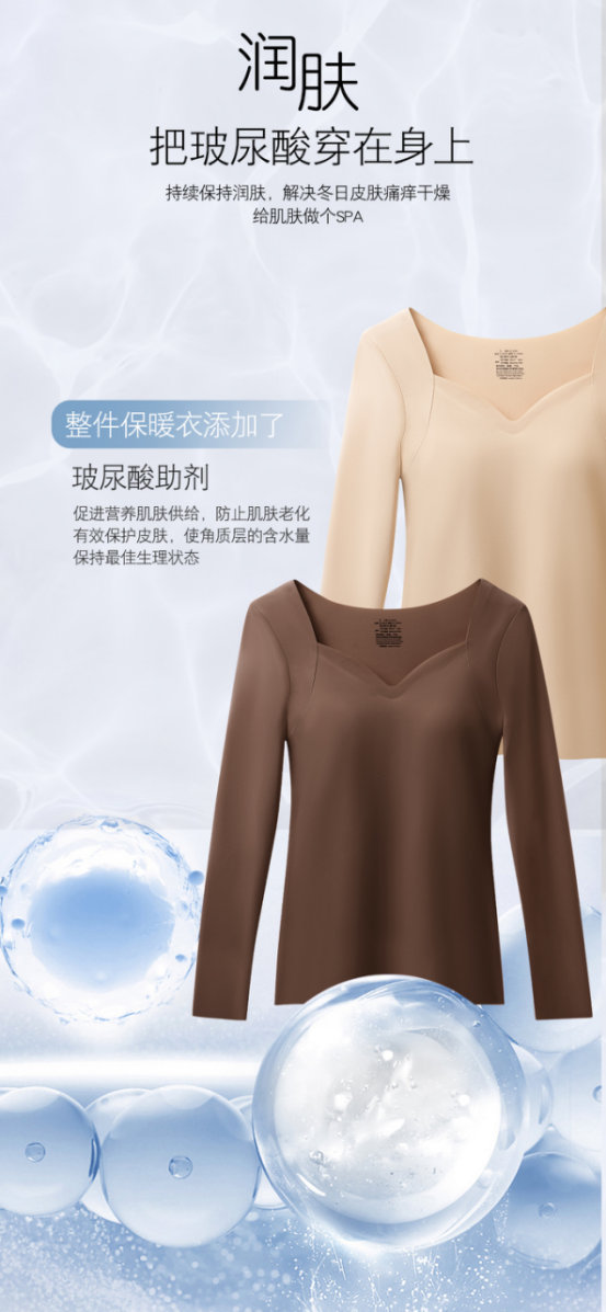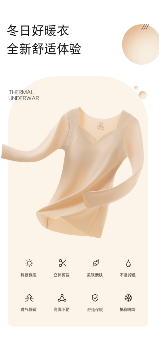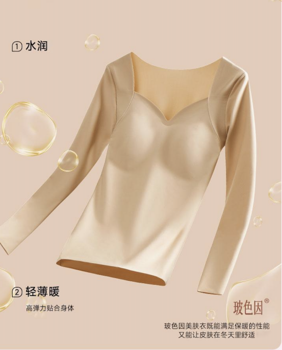 和普通保暖上衣有什么区别? 👍 它是轻薄款,没有传统保暖衣的厚重、松垮、显胖: 面料选用的是亲肤度拉满的锦纶+氨纶的黄金比例。 👍上手软乎乎但不失扎实细腻的触感真的好像少女软嫩的大腿肉! 而且摸久了还带有丝丝暖意!已经迫不及待想让它包裹我们的每一寸肌肤了~