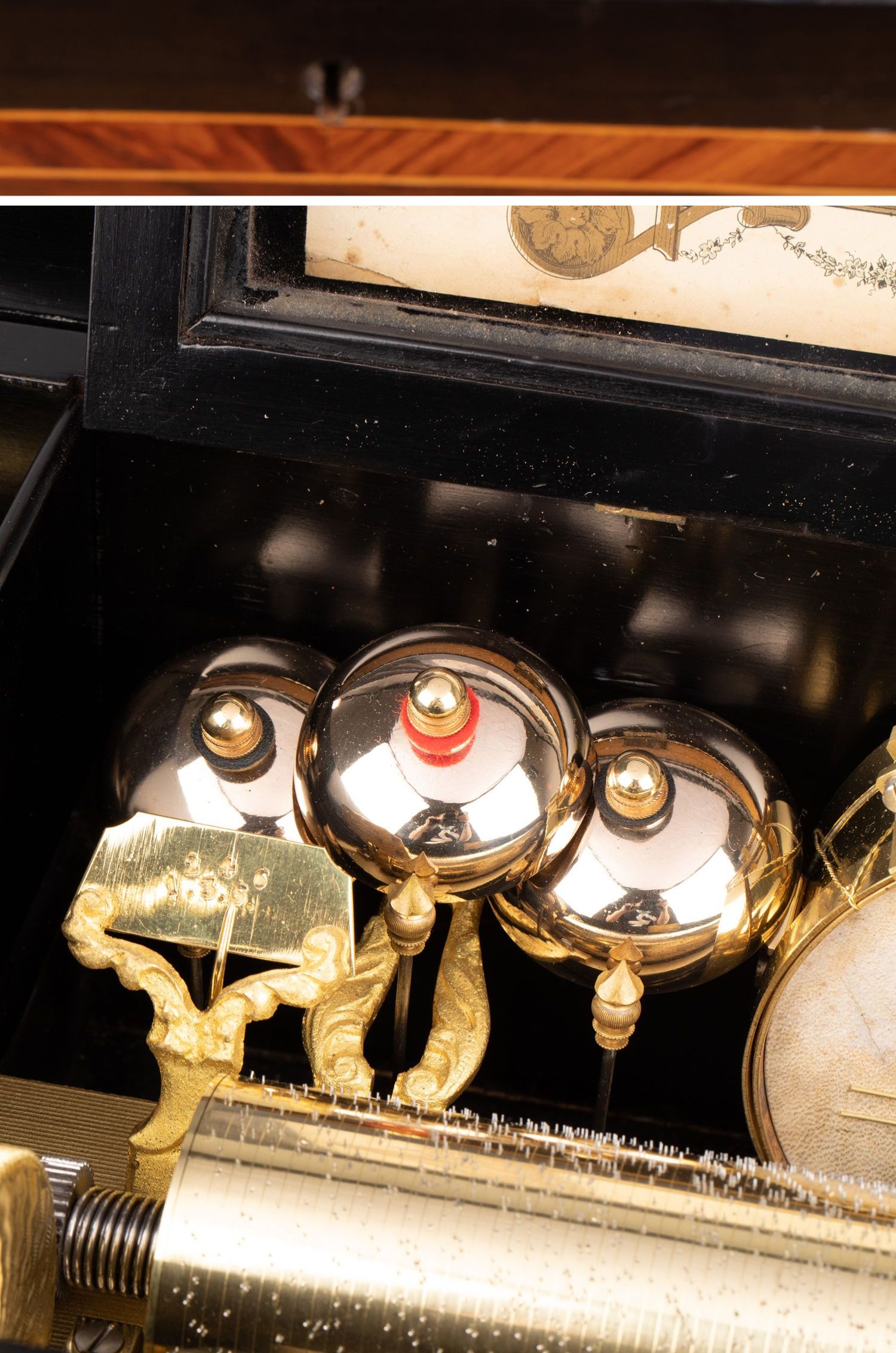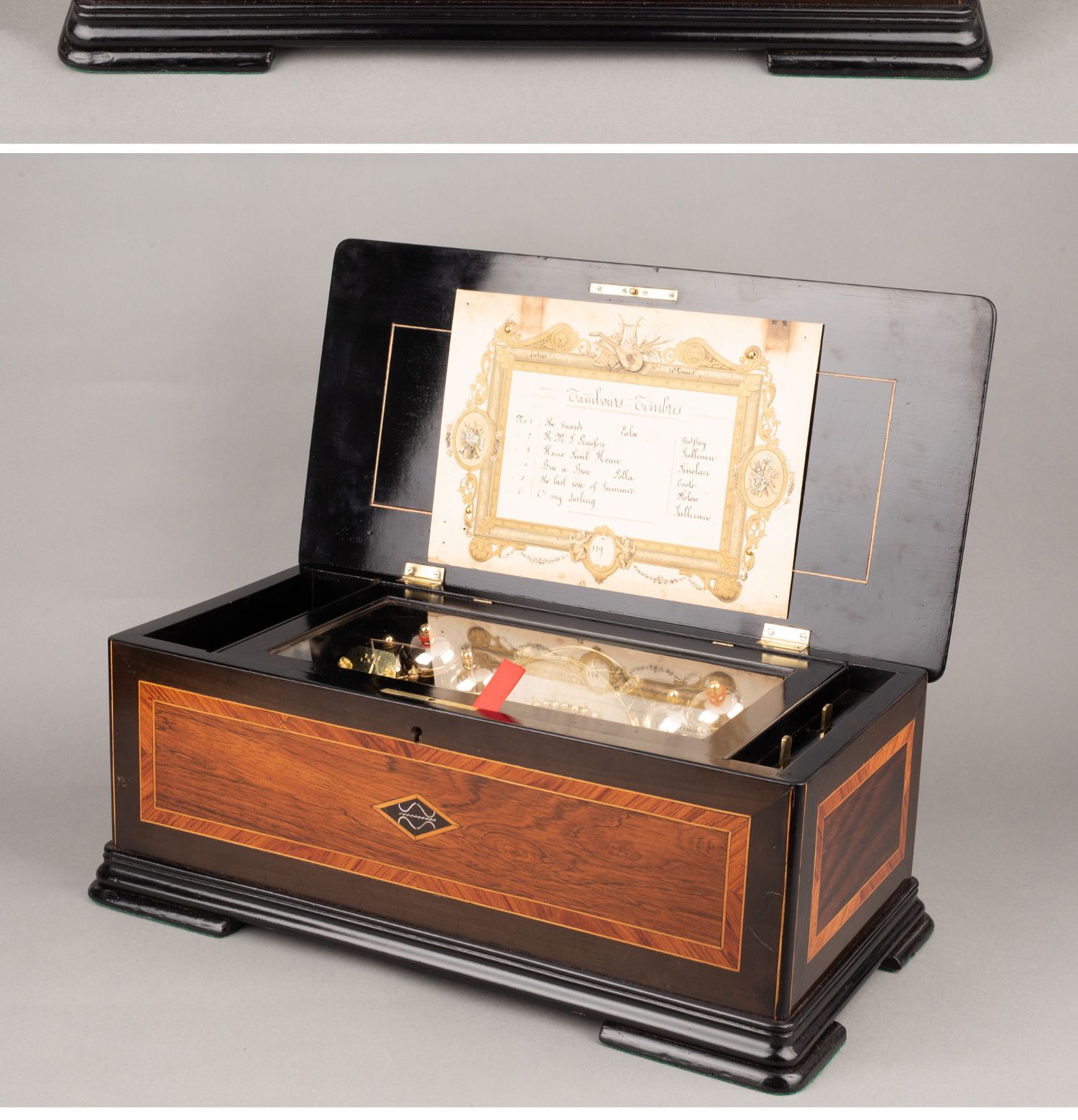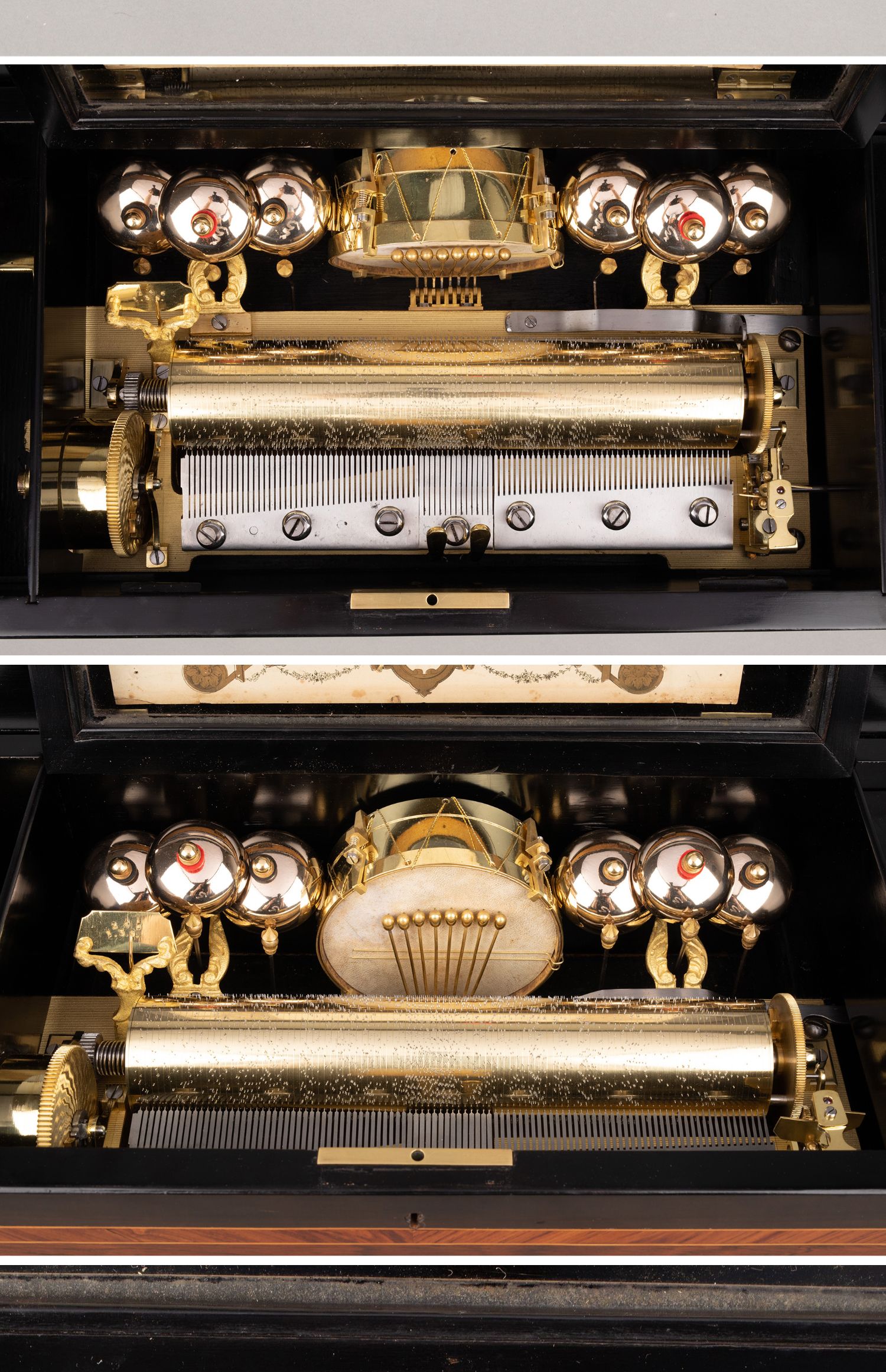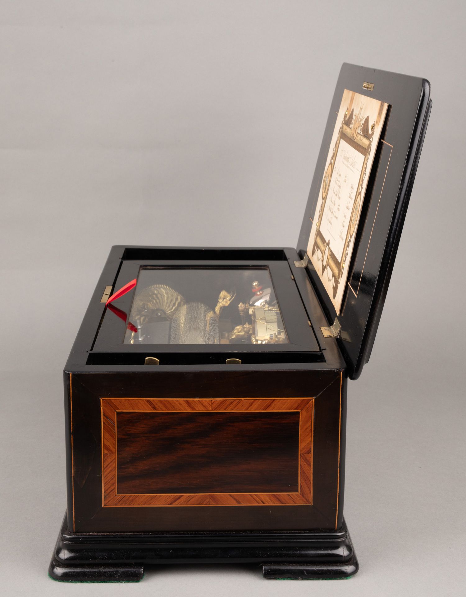 独角鹿西洋古董Paillard工坊细木镶嵌外箱配铃铛响鼓滚轴音乐盒