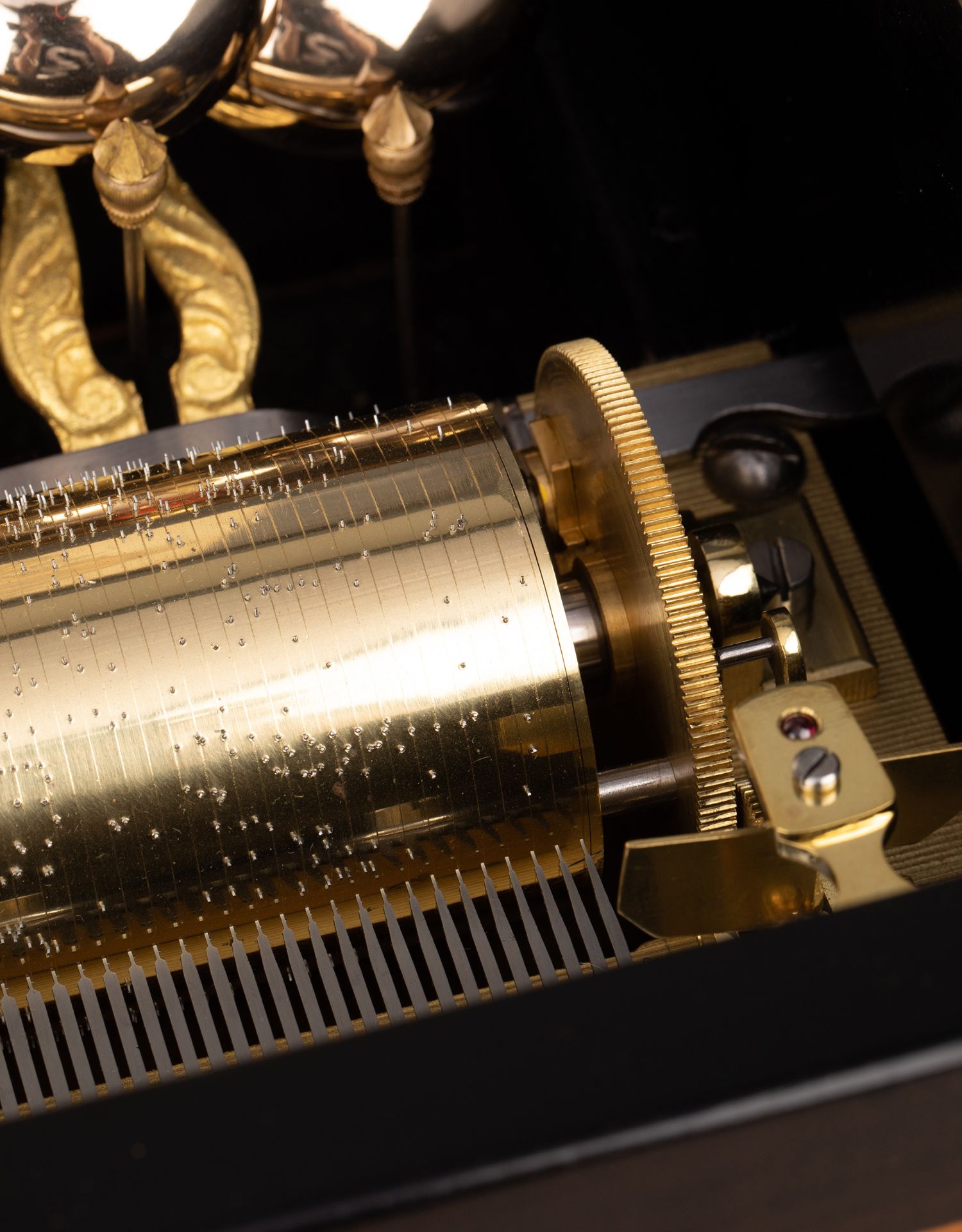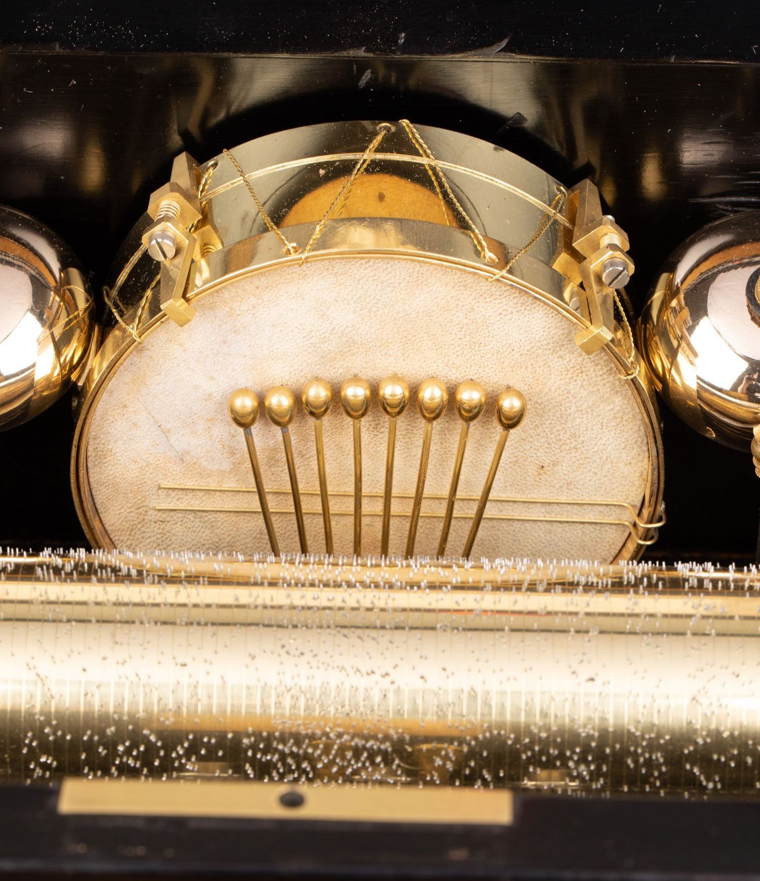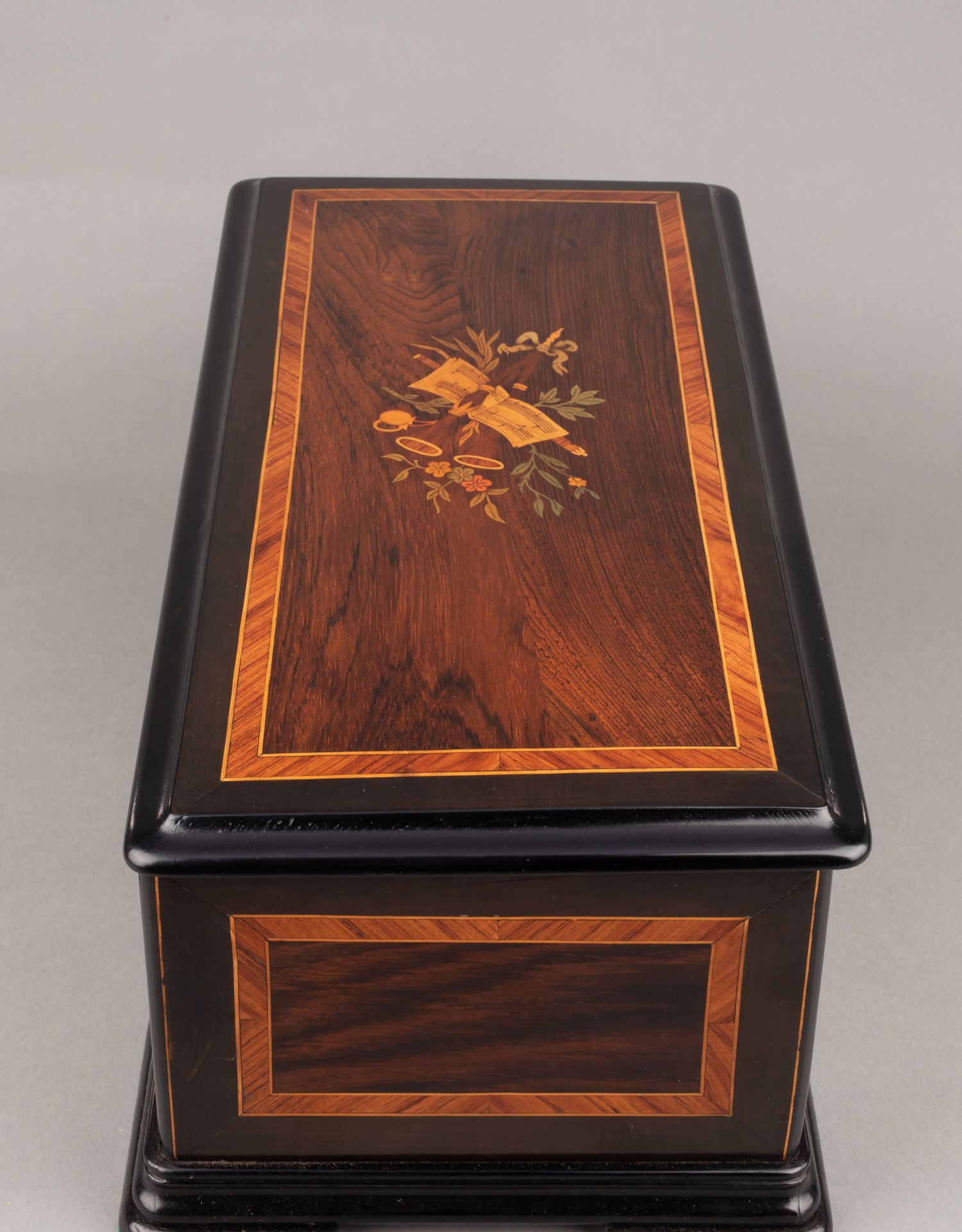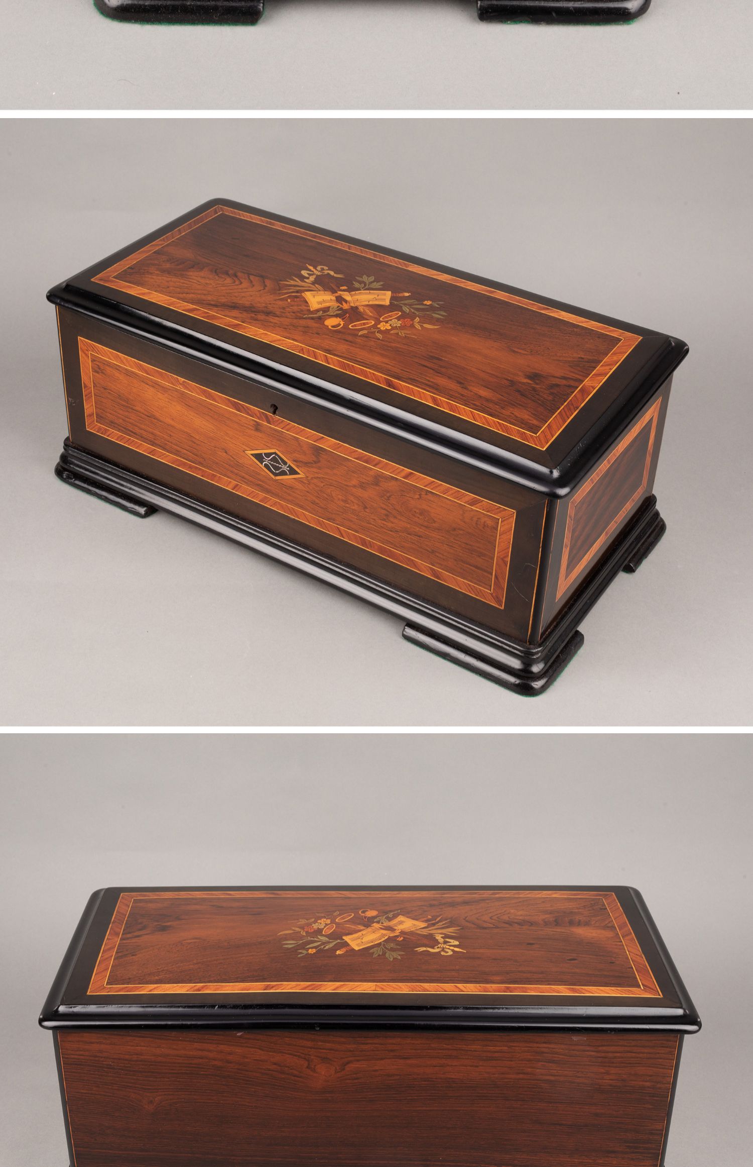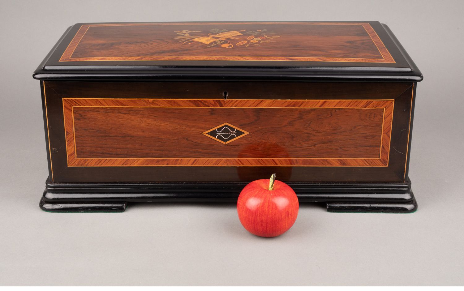 独角鹿西洋古董Paillard工坊细木镶嵌外箱配铃铛响鼓滚轴音乐盒