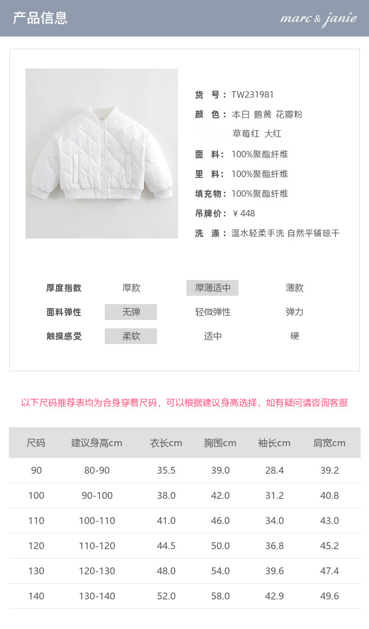 马克珍妮秋装新款 男女童超轻保暖羽绒服 儿童羽绒内胆221062