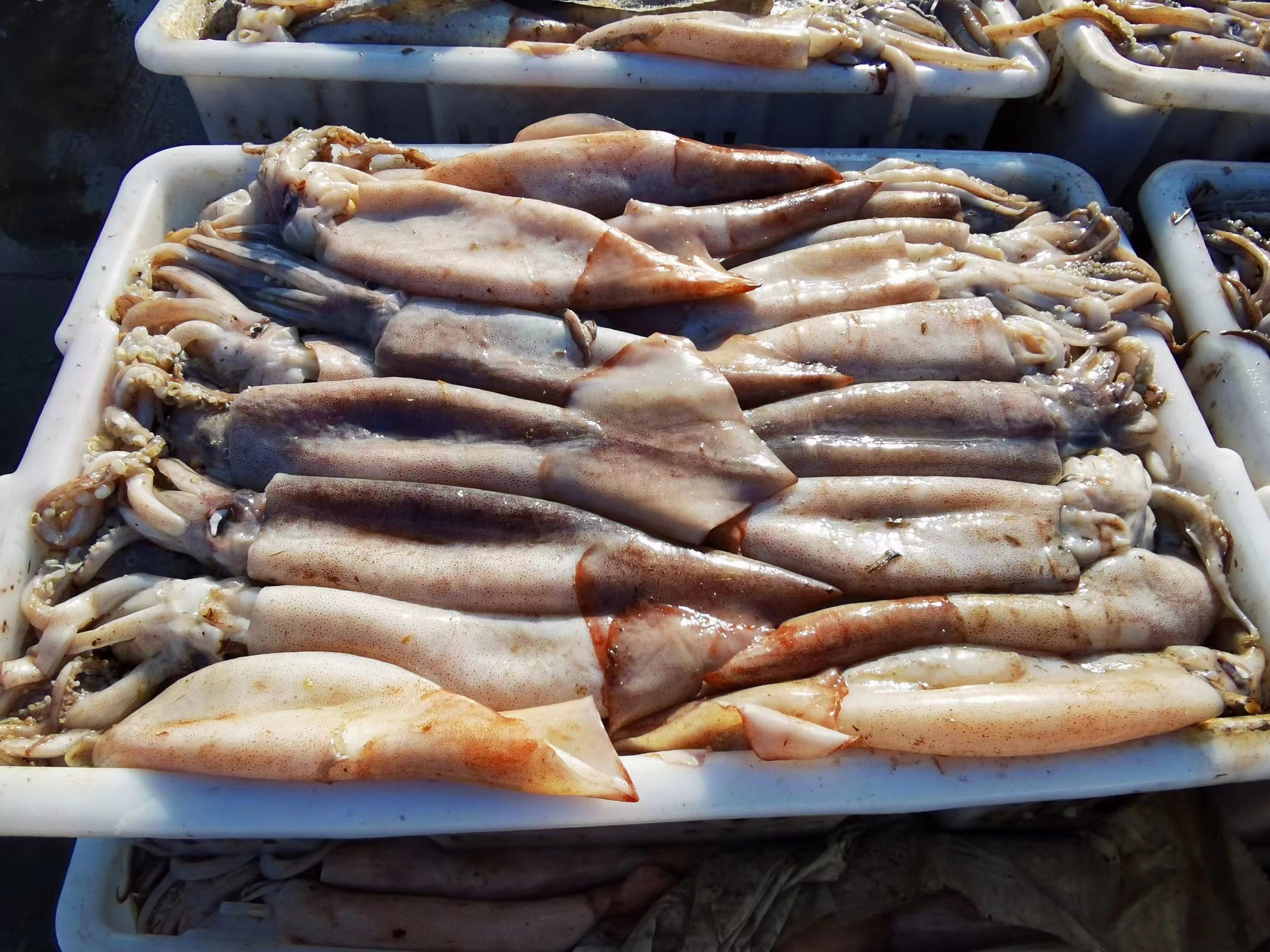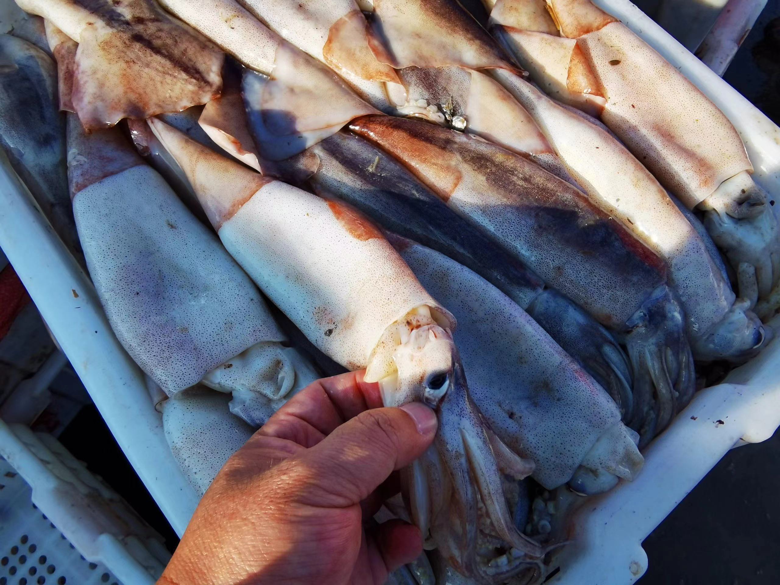 我手拿的就是码头刚上岸的新鲜鱿鱼,都是本地品种 - 中国尾枪乌贼。从码头直接用塑料袋拎回家,便宜的不会让人吃起来肉疼,和你买回家吃完全不是一种心理感受。可是没办法,不是谁都能码头直接拎回家的。