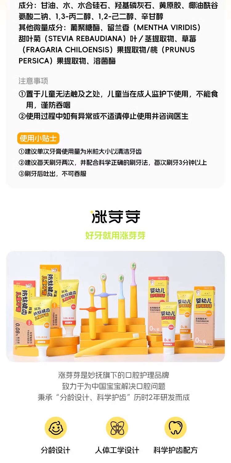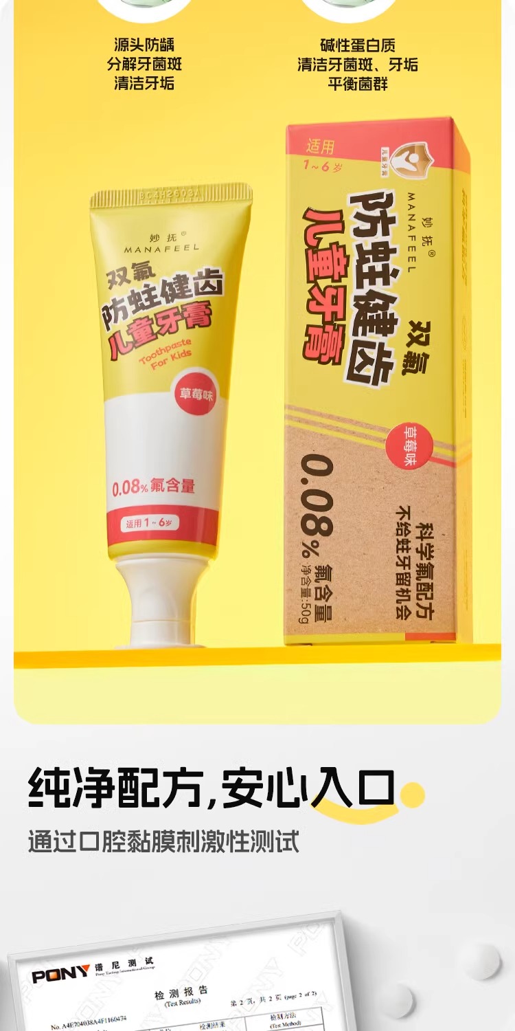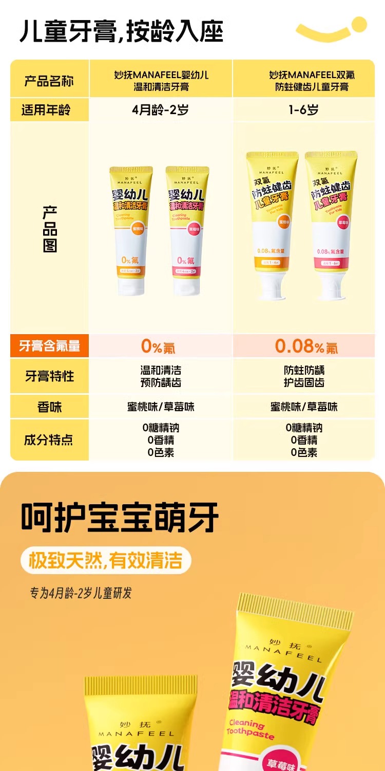 妙抚双氟防蛀健齿儿童牙膏1-6岁草莓味/蜜桃味/MF-ZYY9936/MF-ZYY9905