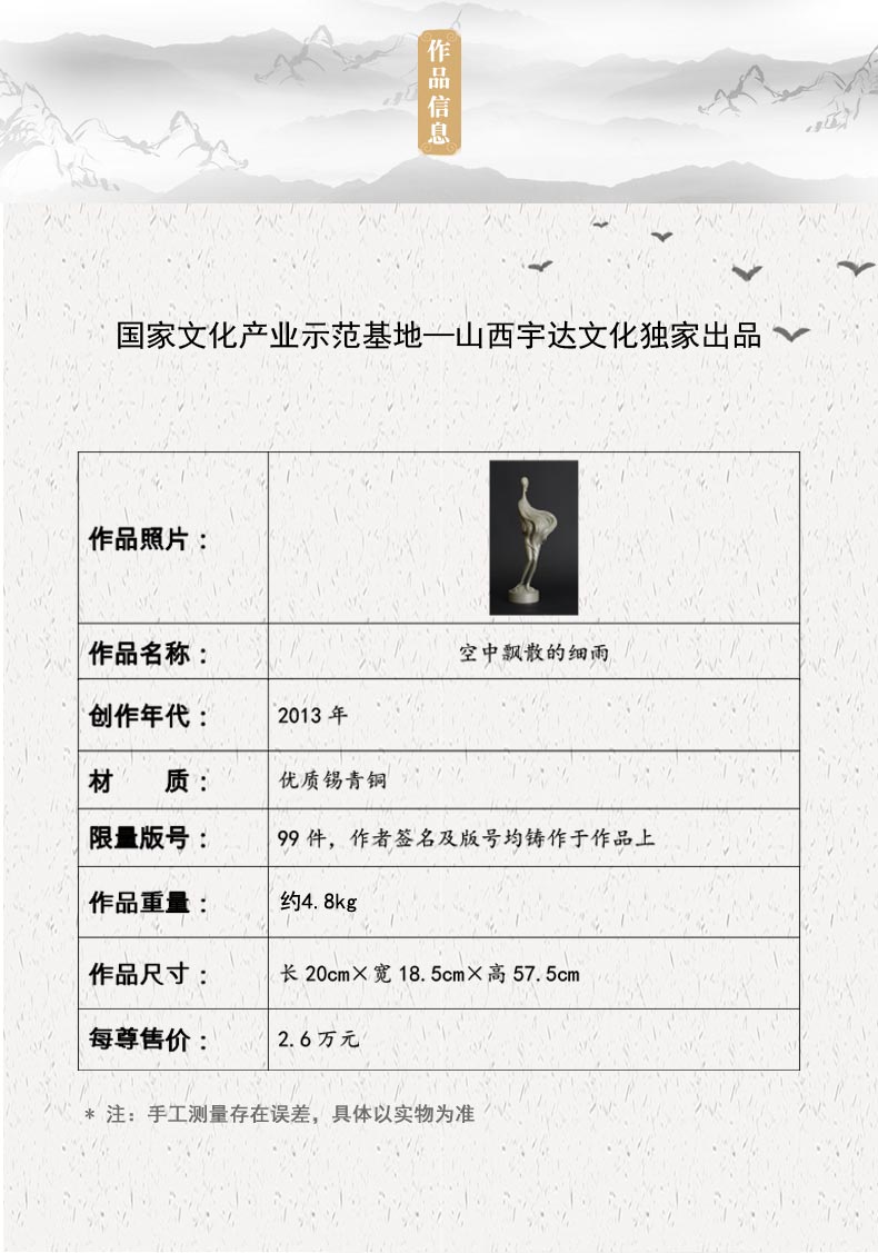 宇达青铜摆件 限量99件 杨学军作品 《空中飘散的细雨》艺术摆件 高57.5cm
