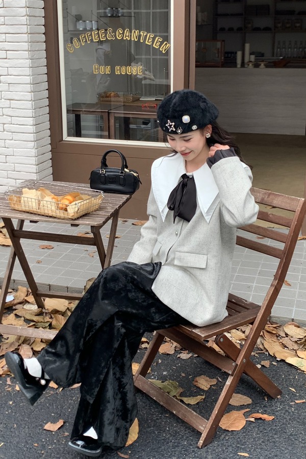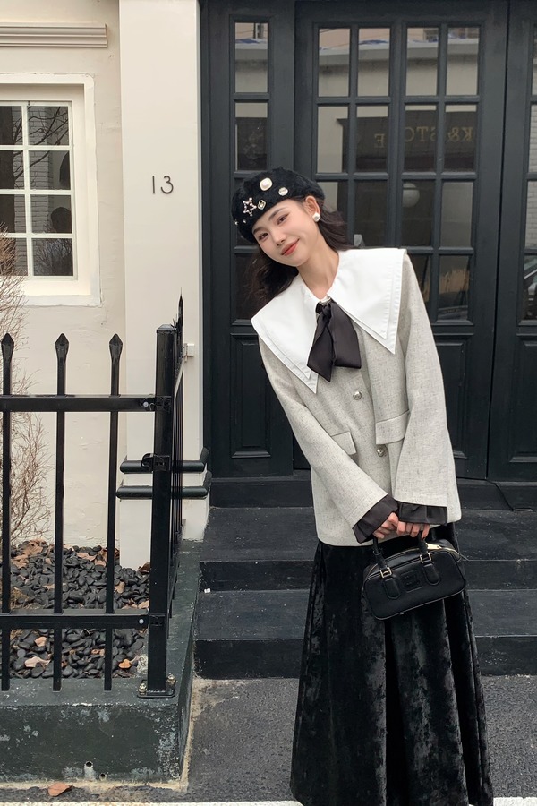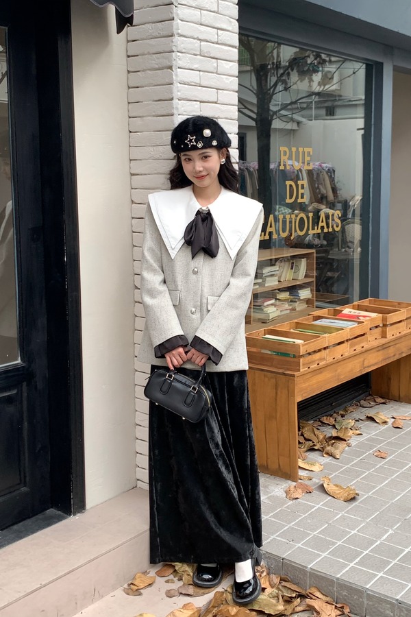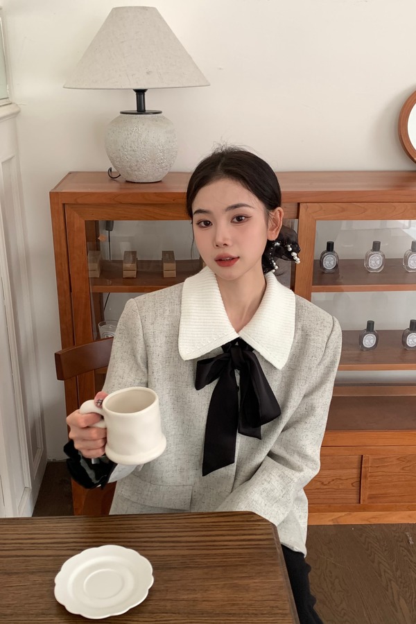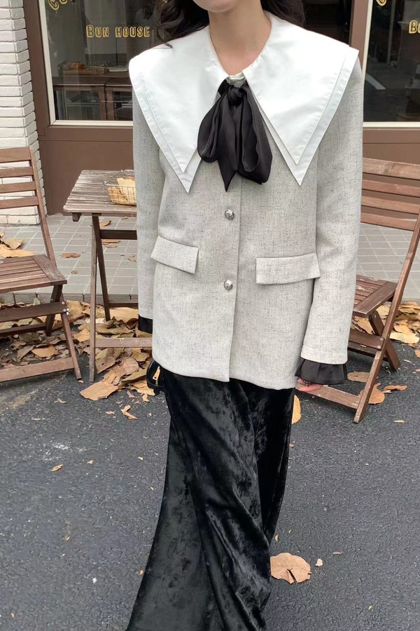 Le Malene 银色无领时髦小香风缎面飘带西装外套 19251