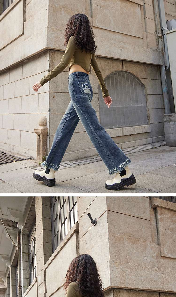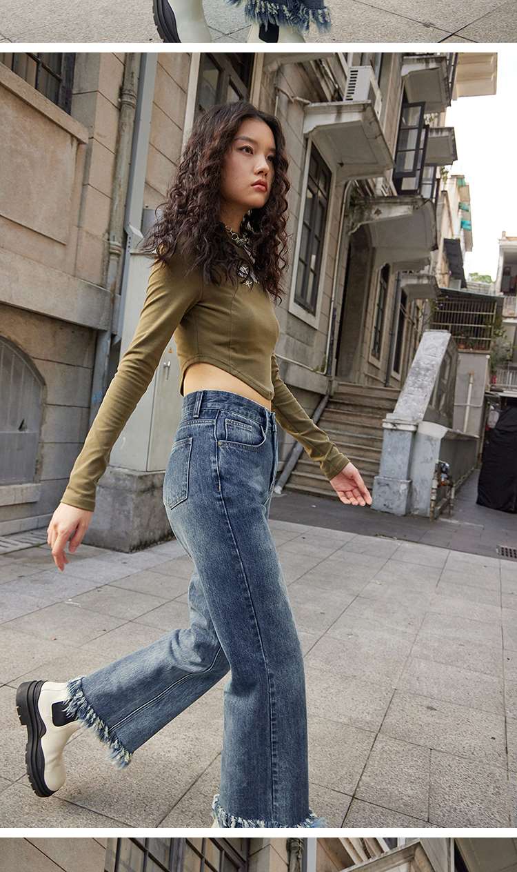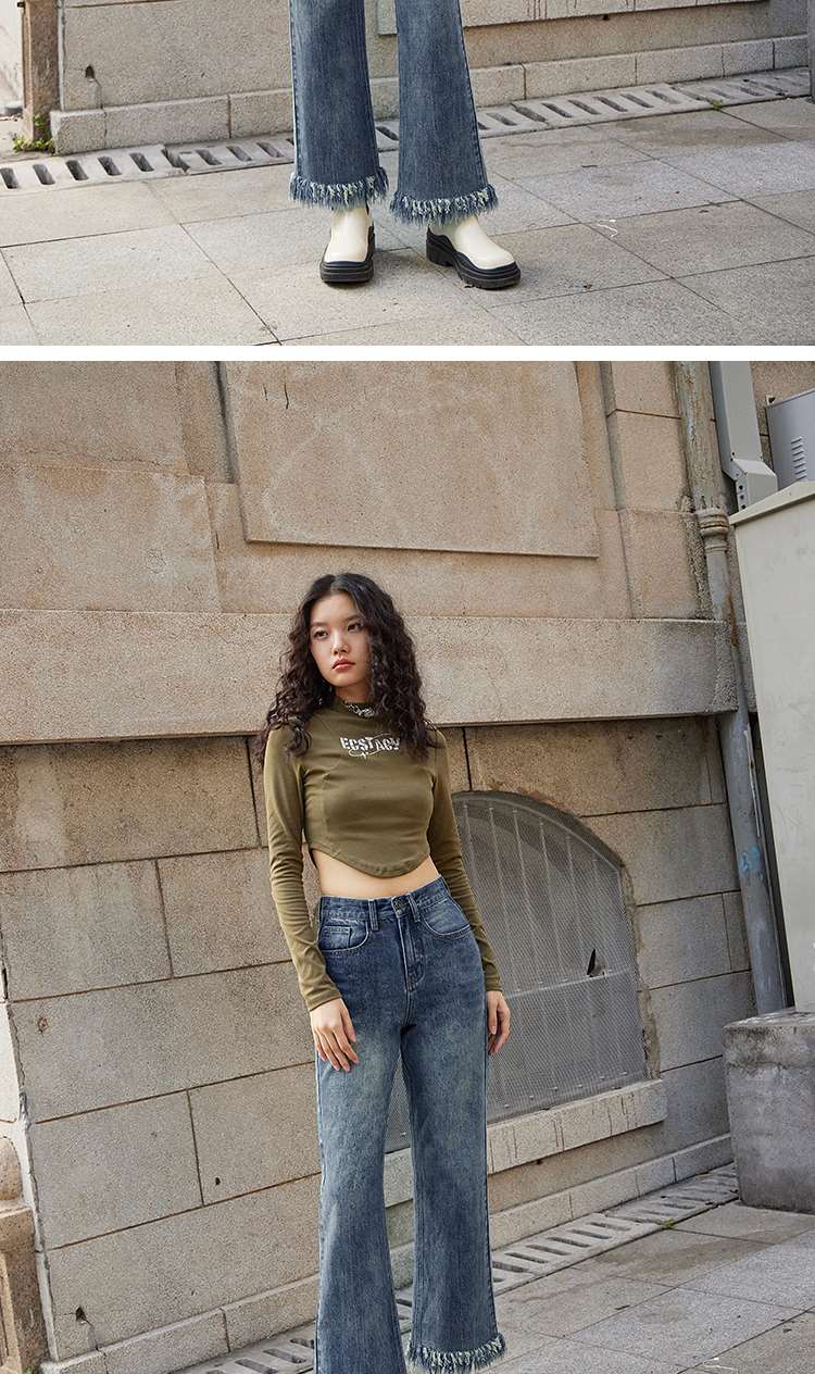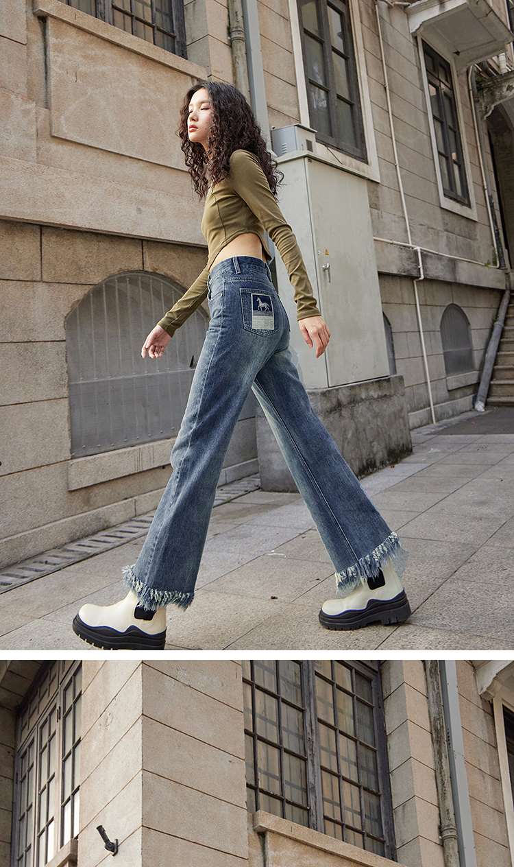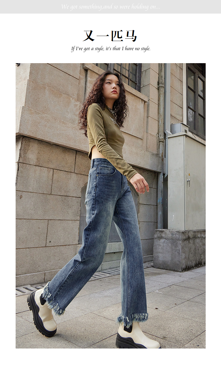 两三事又一匹马 2022冬季新款时尚抽绳装饰流苏裤脚直筒牛仔裤女