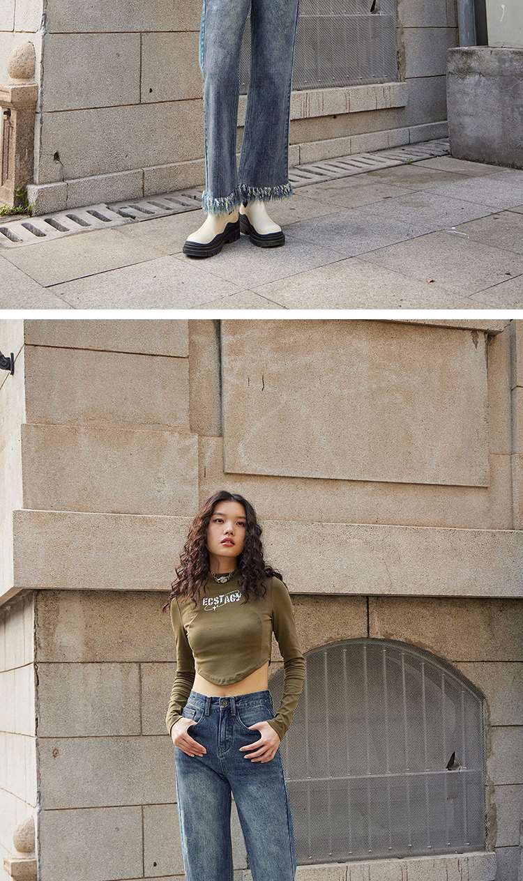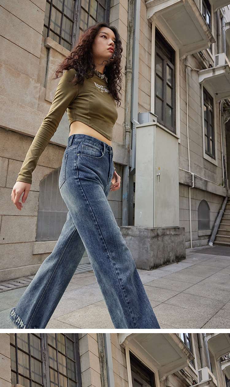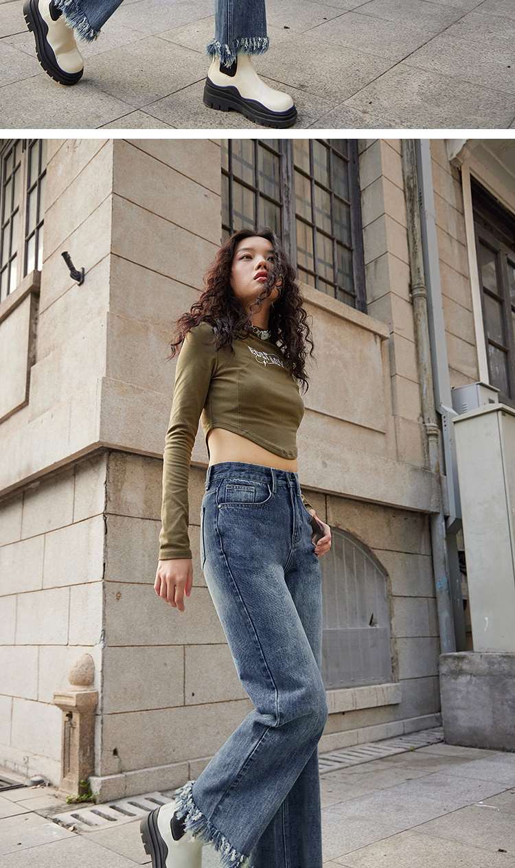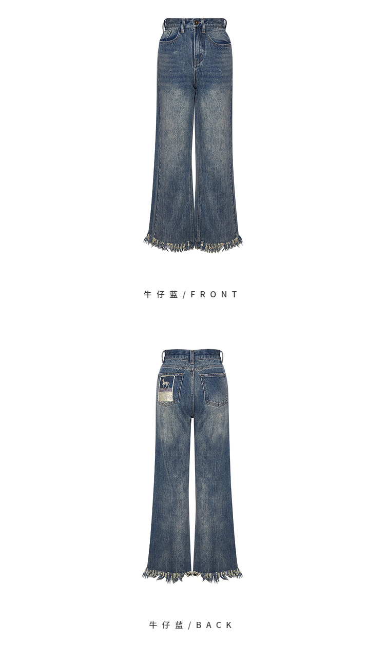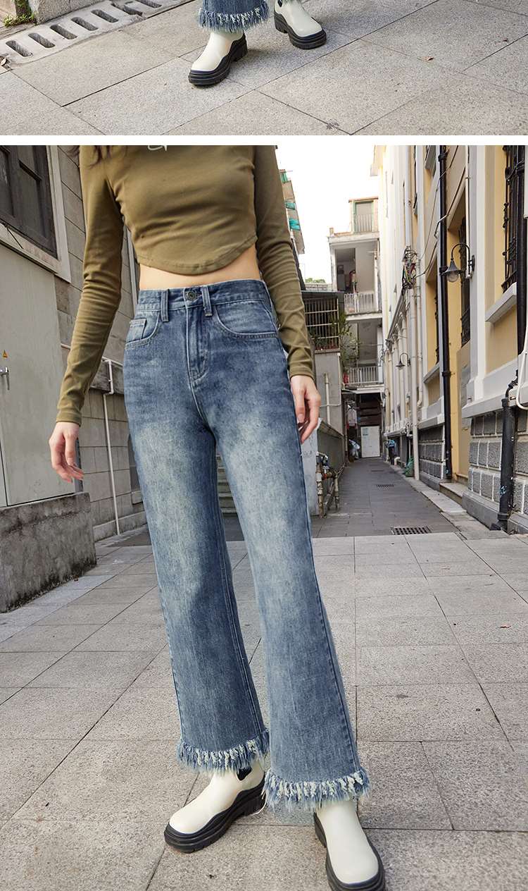 两三事又一匹马 2022冬季新款时尚抽绳装饰流苏裤脚直筒牛仔裤女