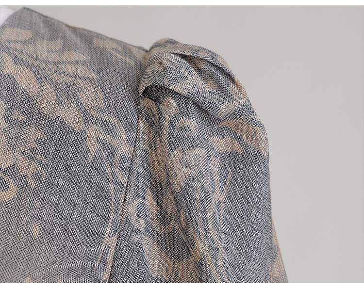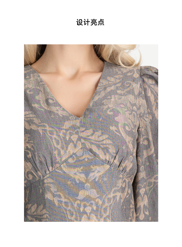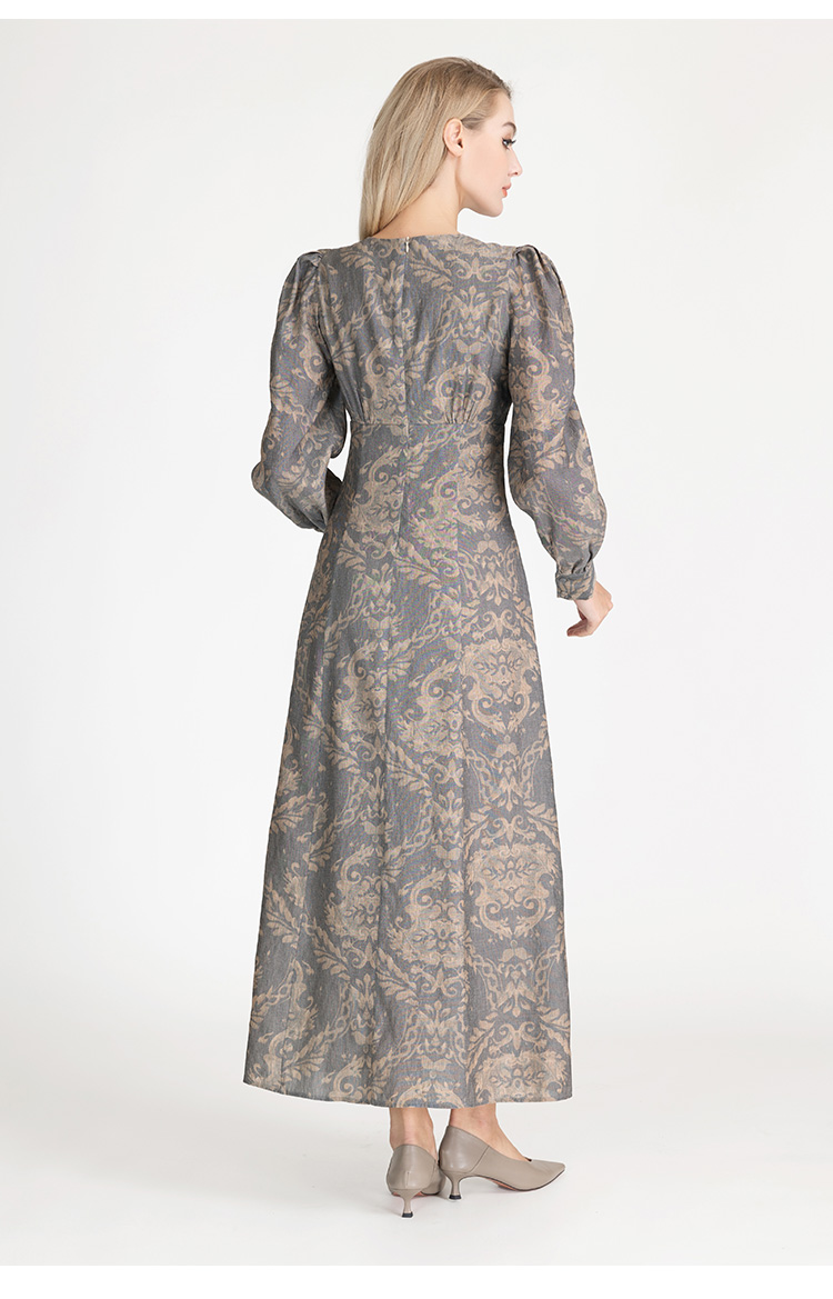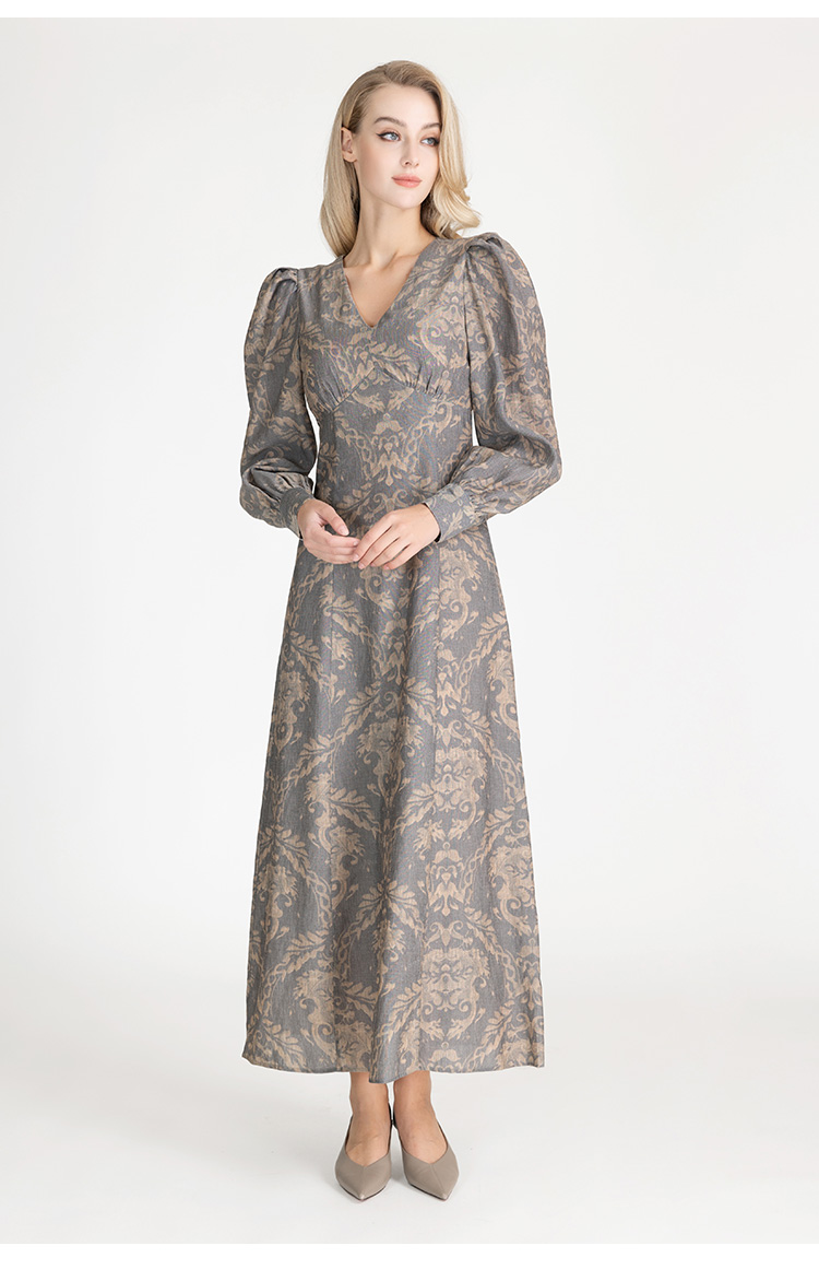 LIZZY早秋古典雅致宫廷风V领印花长款气质连衣裙