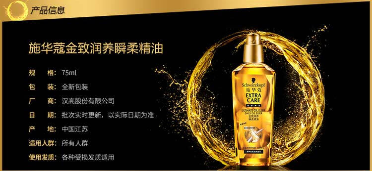 ![]() | 品牌:施华蔻 品 牌:施华蔻<br> 产品名称:2014施华蔻金致润养瞬柔精油75ml<br> 产 地:江苏<br> 规 格:75ml<br> 有 效 期:39个月(以实物为准)<br> 使用方法:使用时,在手中滴一滴,从秀发中部涂抹至发梢,放置阴凉处,避免阳光直射<br> 成 分:液态金粹、奢养树仁精油、液态智慧修护因子 |