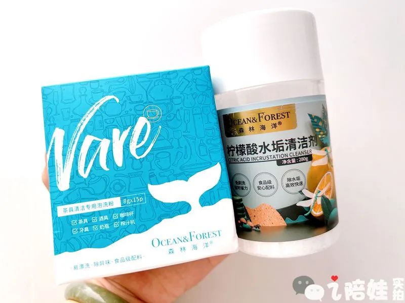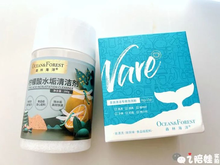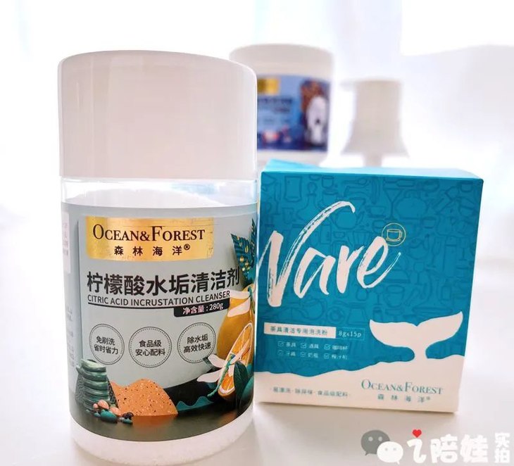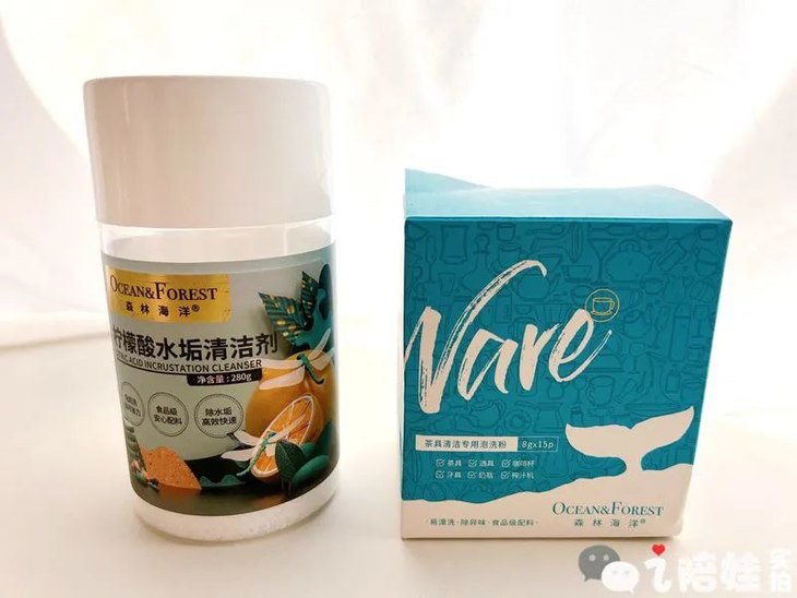它就是森林海洋水垢清洁剂和茶具清洁泡洗粉,柠檬酸水垢清洁剂一瓶280g,茶具泡洗粉一盒120g