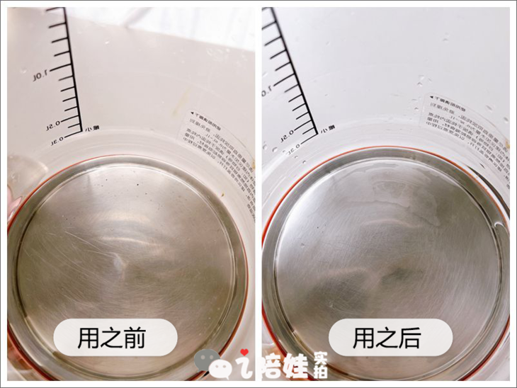 能这么好用,得说它这个柠檬酸成分,其实就相当于和碱性的水垢中和。但相比于醋和小苏打这些调料来了说,它的成分更纯粹有针对性,甚至能直接看到它和水垢发生反应↓
