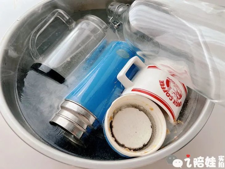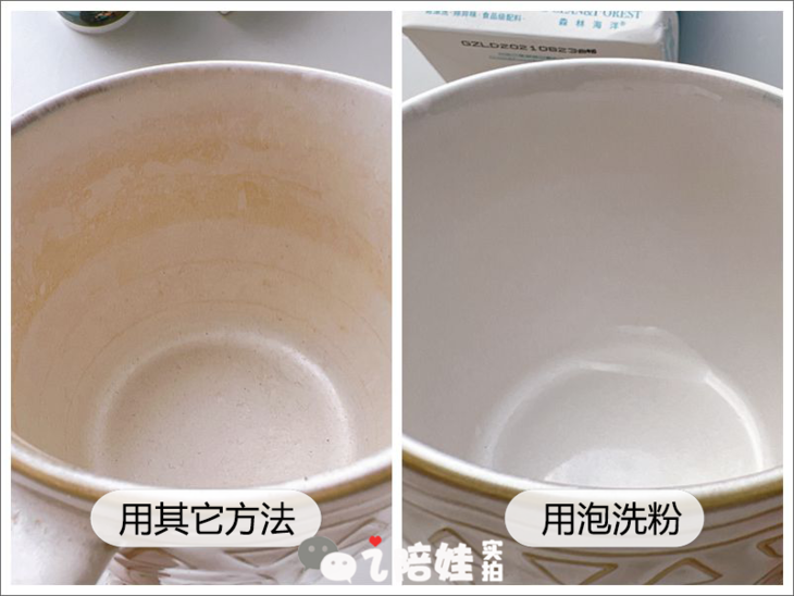 最后还得是用这个泡洗粉,热水一泡咕嘟咕嘟就有很多小泡沫,放个一刻钟用水冲干净再看,就跟换了个杯子似的,一点黄渍都没有了