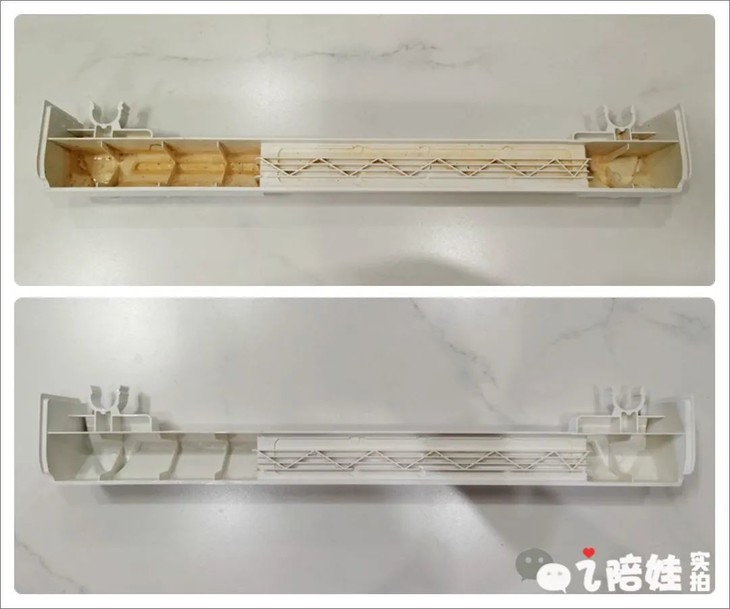 但用这个水垢清洁剂来泡就能把死角都顾及到,泡完之后,所有小格子的边角都挺干净,死角的地方也没落下,是我这种强迫症的福利了