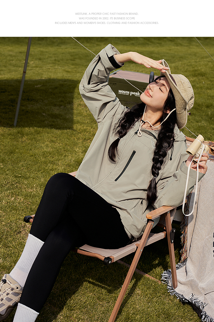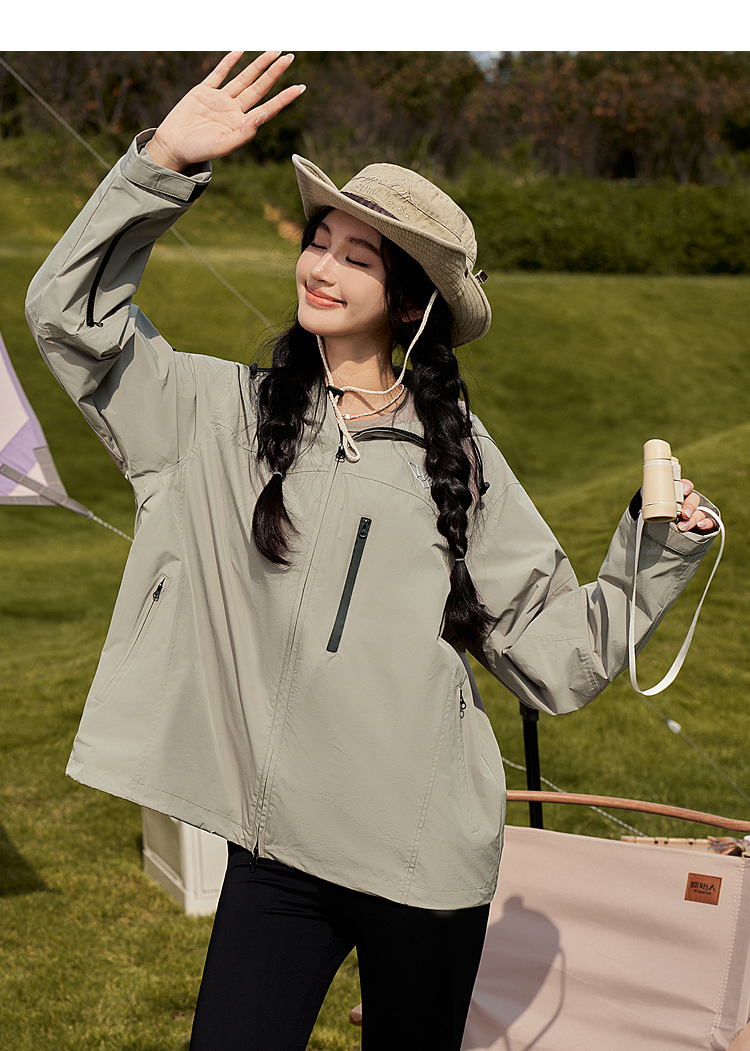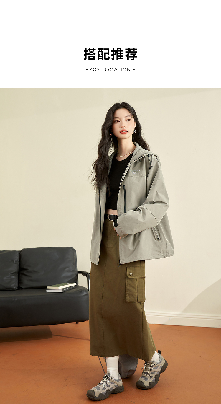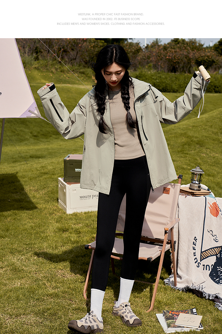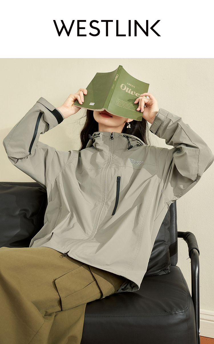 西遇立领冲锋衣女新款连帽宽松防风绿色户外梭织外套11838156