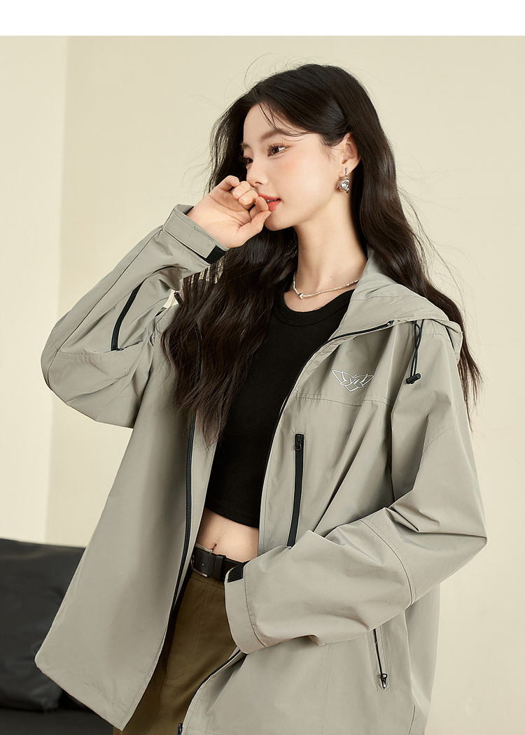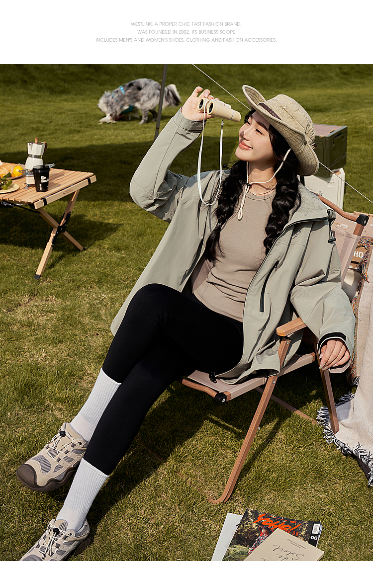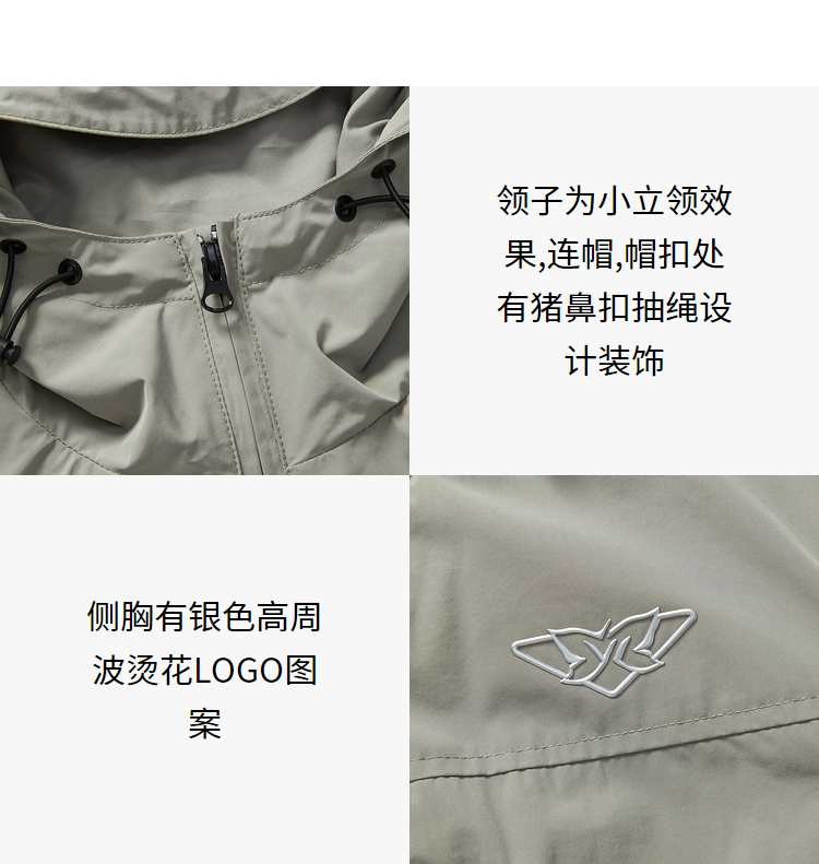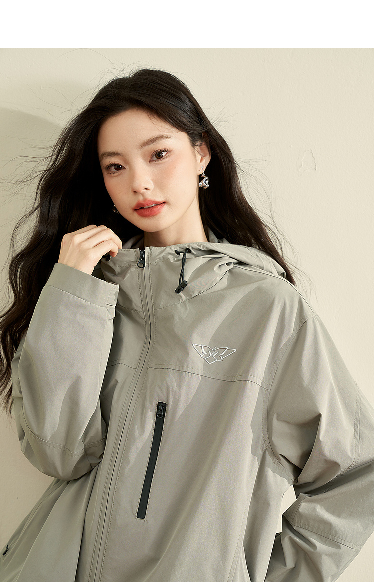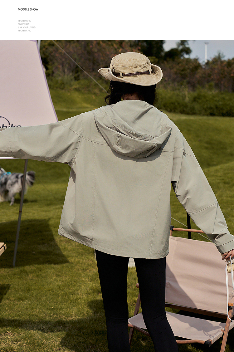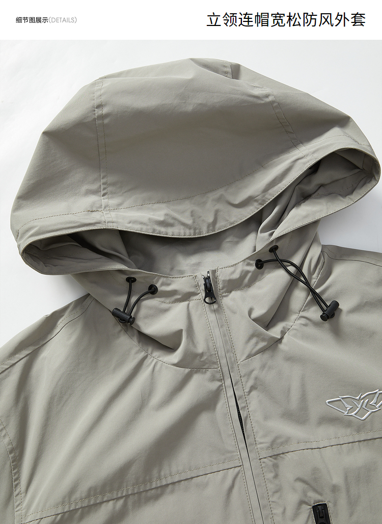 西遇立领冲锋衣女新款连帽宽松防风绿色户外梭织外套11838156