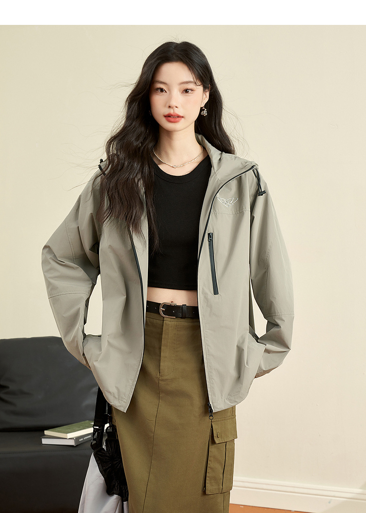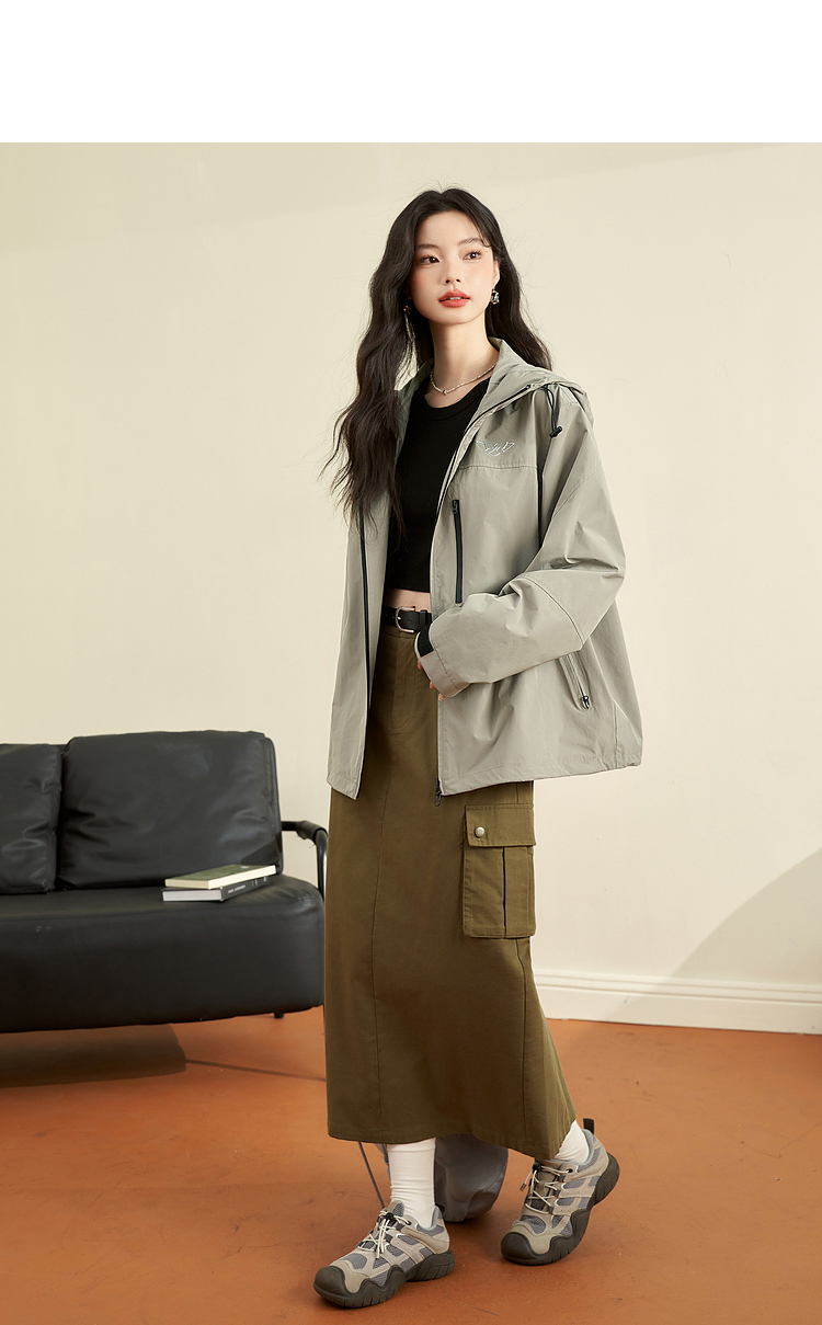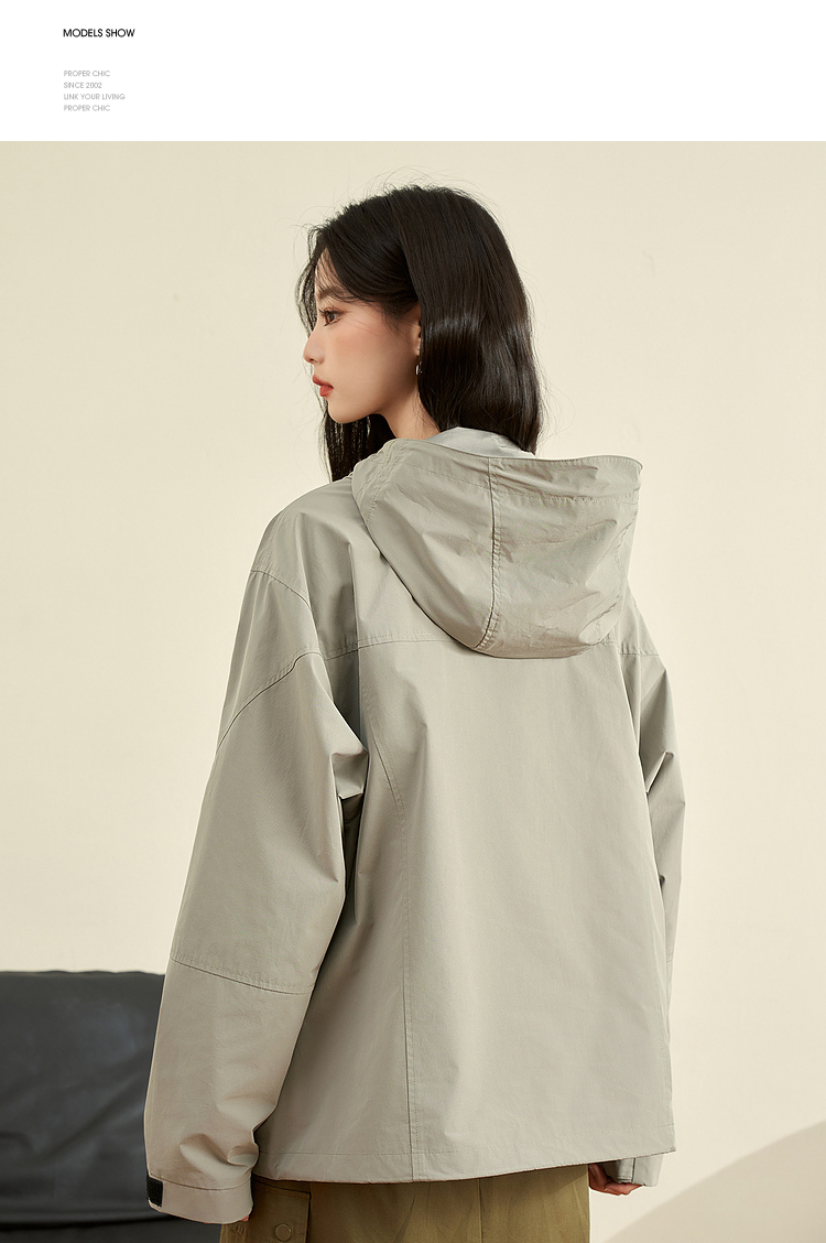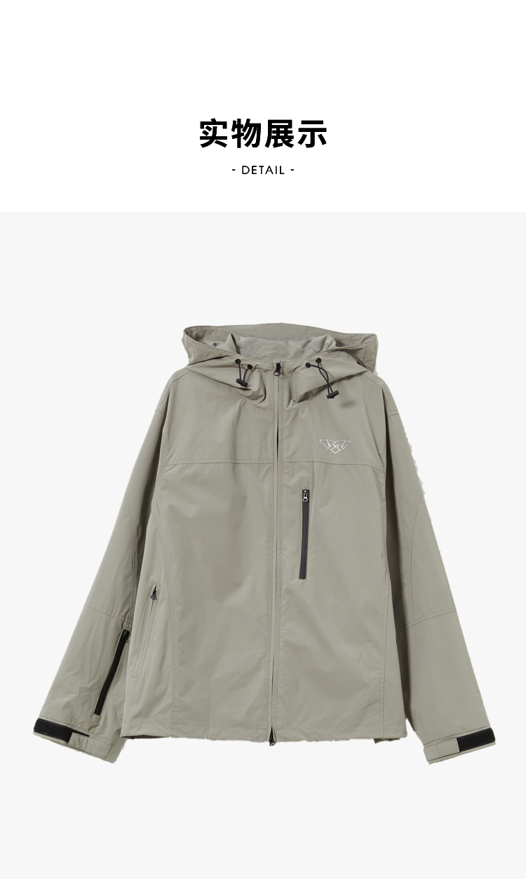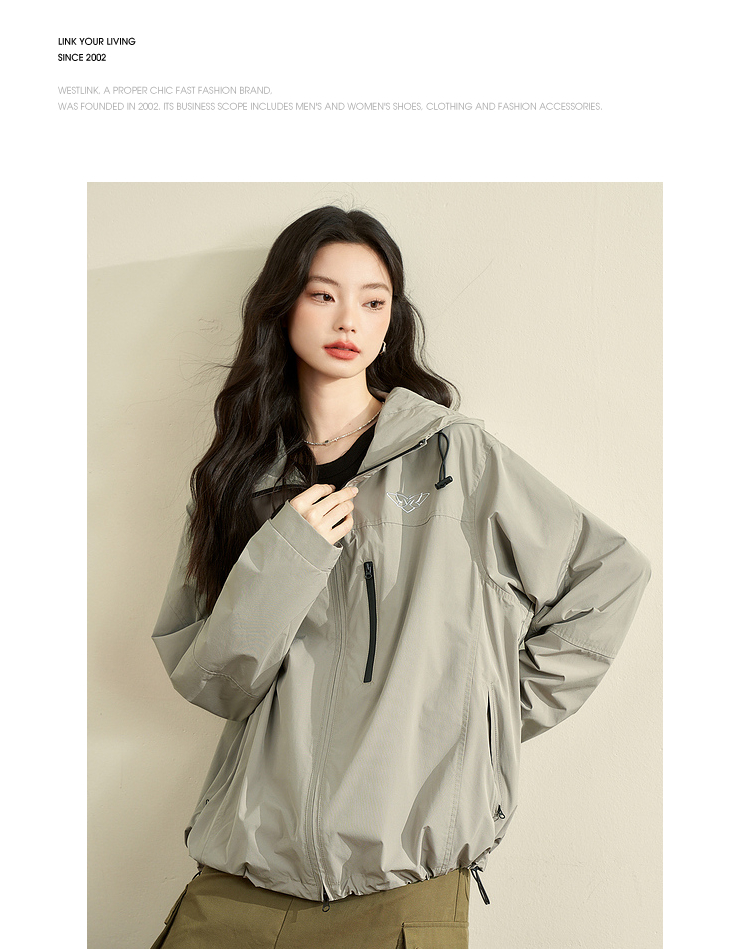 西遇立领冲锋衣女新款连帽宽松防风绿色户外梭织外套11838156