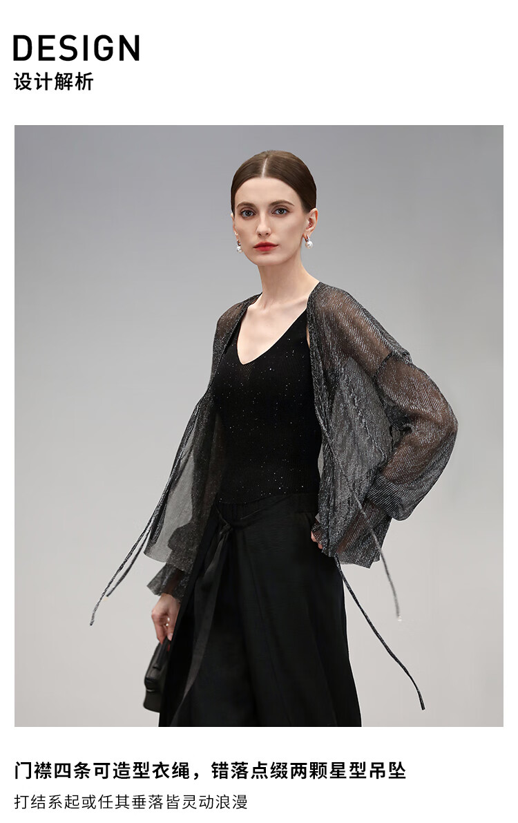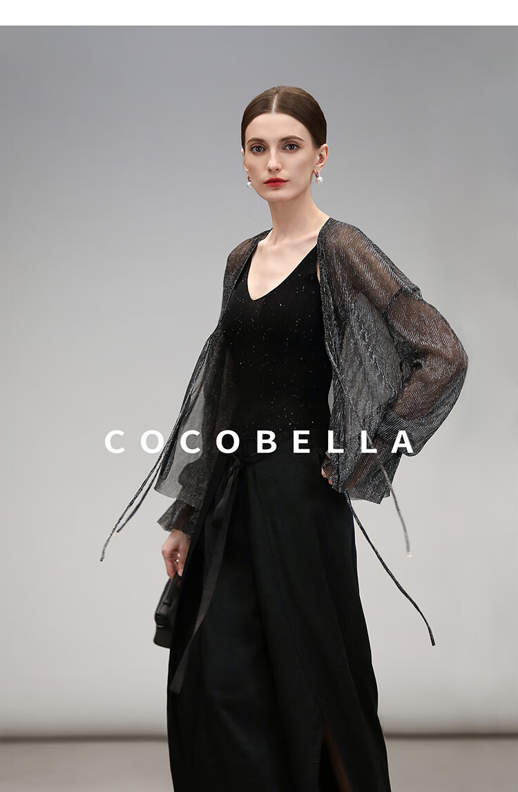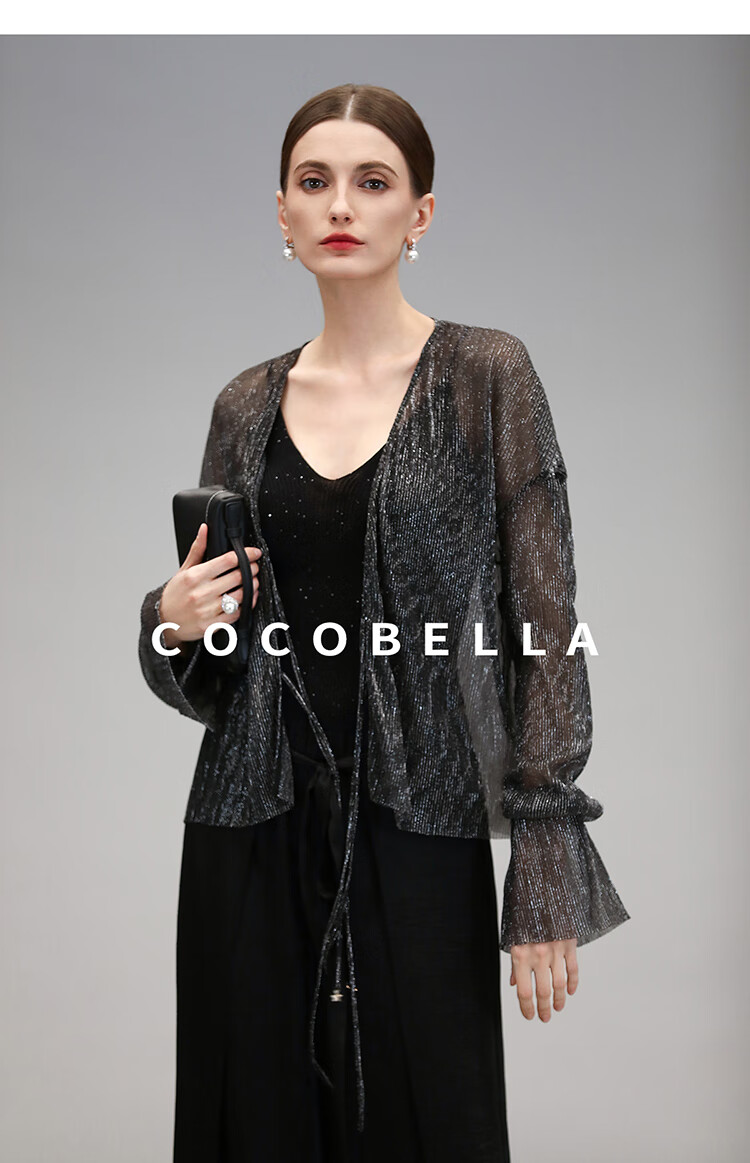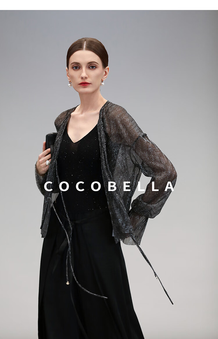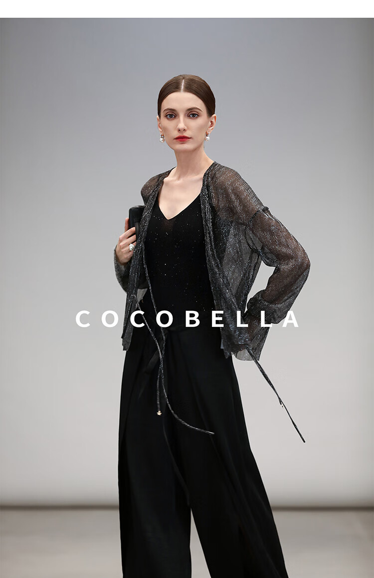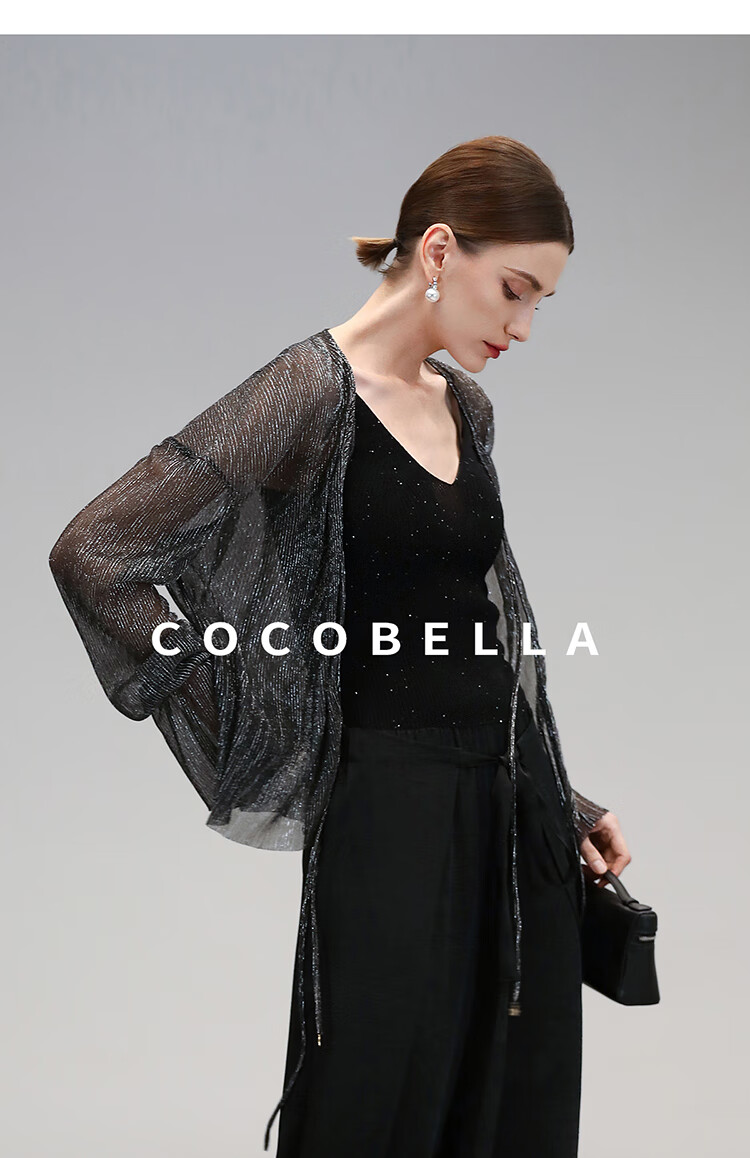 COCOBELLA银葱亮丝镂空微透视遮阳衫女通勤黑色小开衫LC606-2