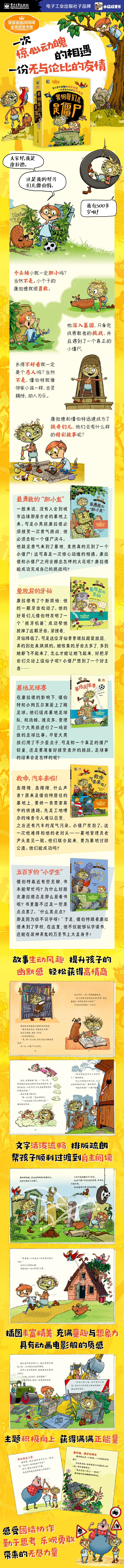 本书是一套儿童文学书籍。讲述了小男孩康拉德和他的僵尸好朋友的故事。个子高大就一定勇敢吗?长得不好看就一定是个恶人吗?当然不是。小个子的康拉德就很勇敢,而他在机缘巧合下结识的朋友,生活在墓地的小僵尸——僵伯特则是个善良、有趣、好学的好伙伴。僵伯特就像一个邻家的小孩一样,他精灵古怪、善解人意、助人为乐,不仅不会让人害怕,反而会让人喜欢上他。小小僵尸渴望朋友,爱搞恶作剧,但是在紧要关头又会挺身而出,伸张正义。他热爱足球,学习读书,保护环境,康拉德和他的朋友一起,经历了许多有趣的事情。