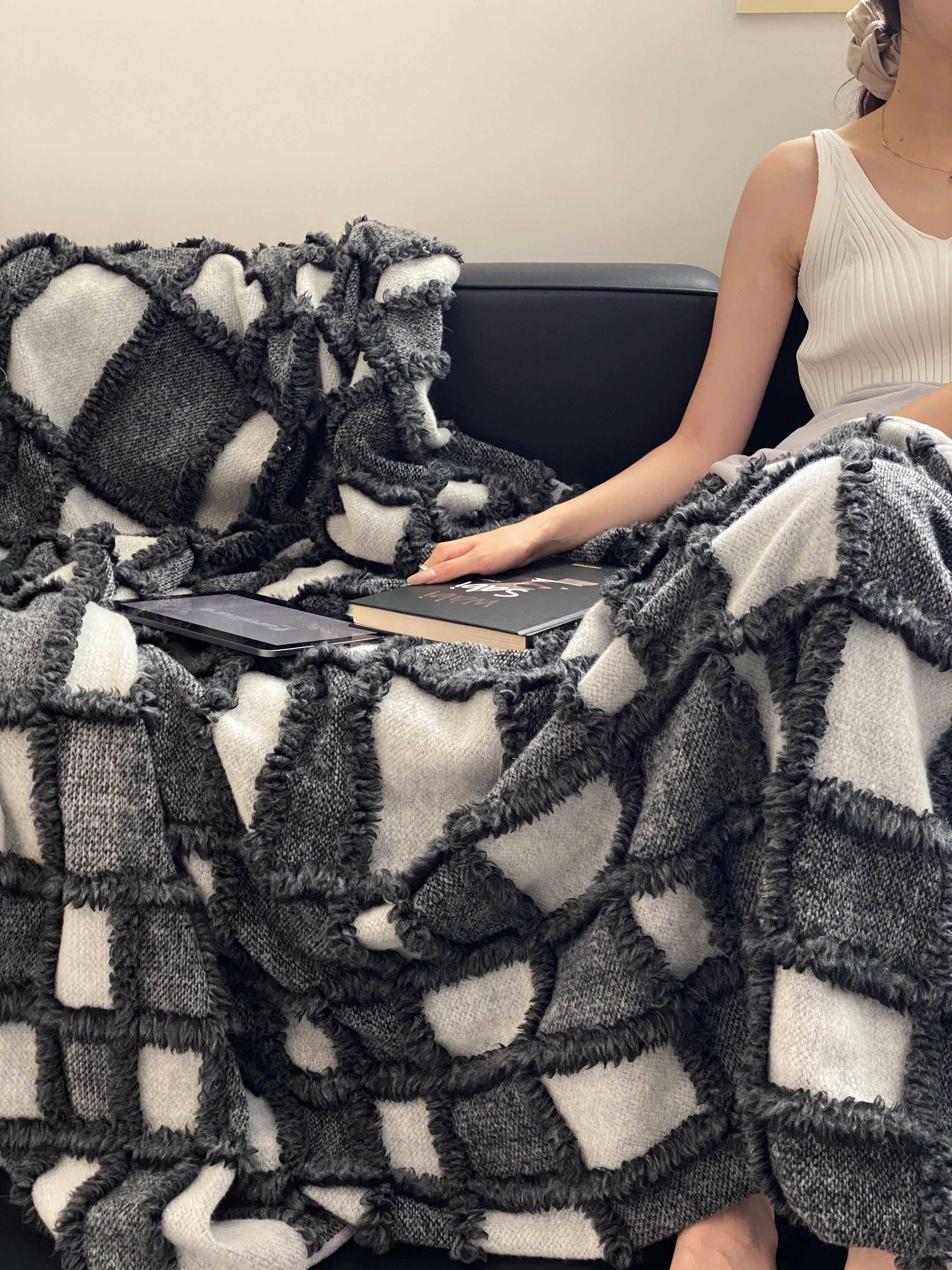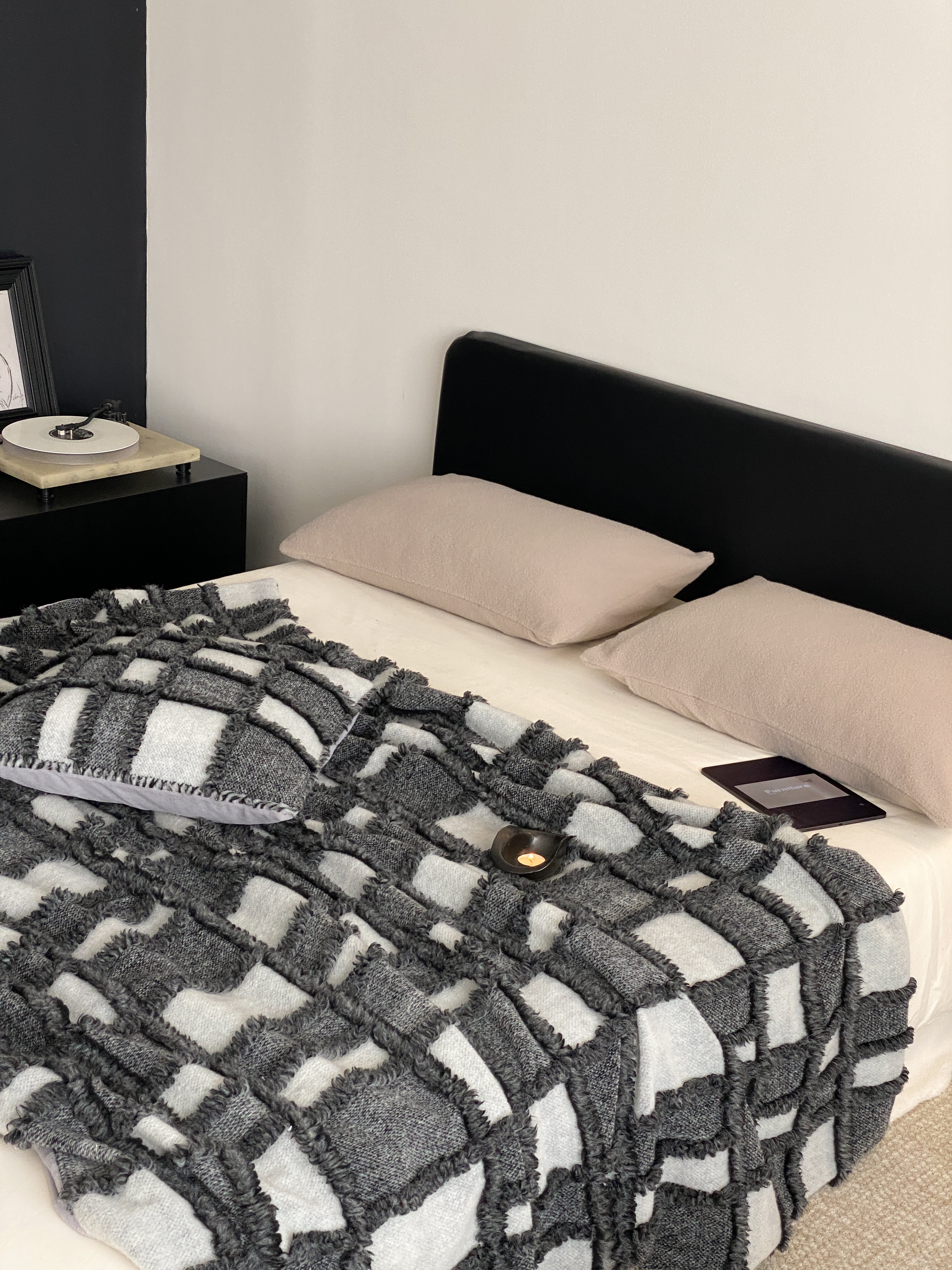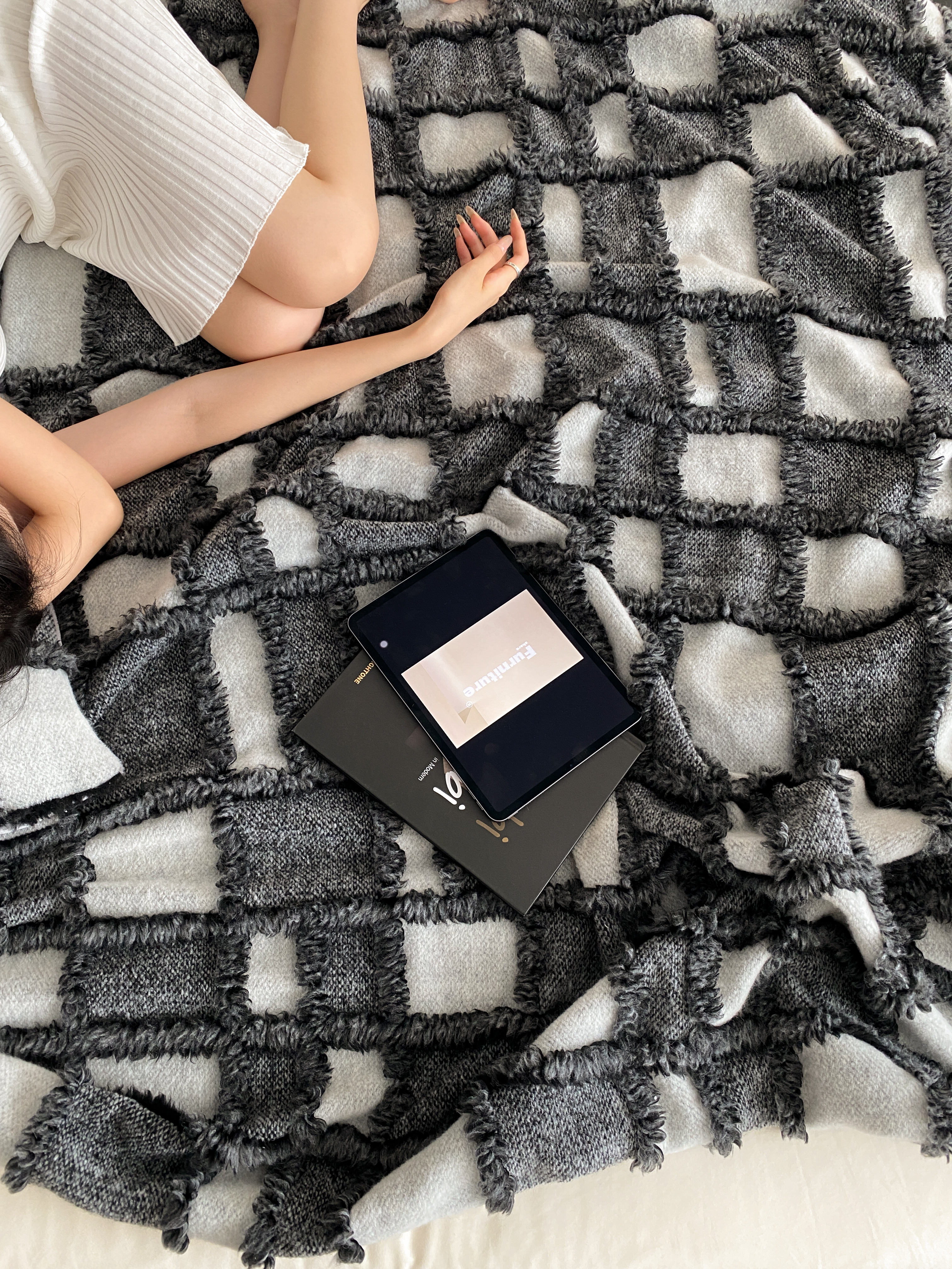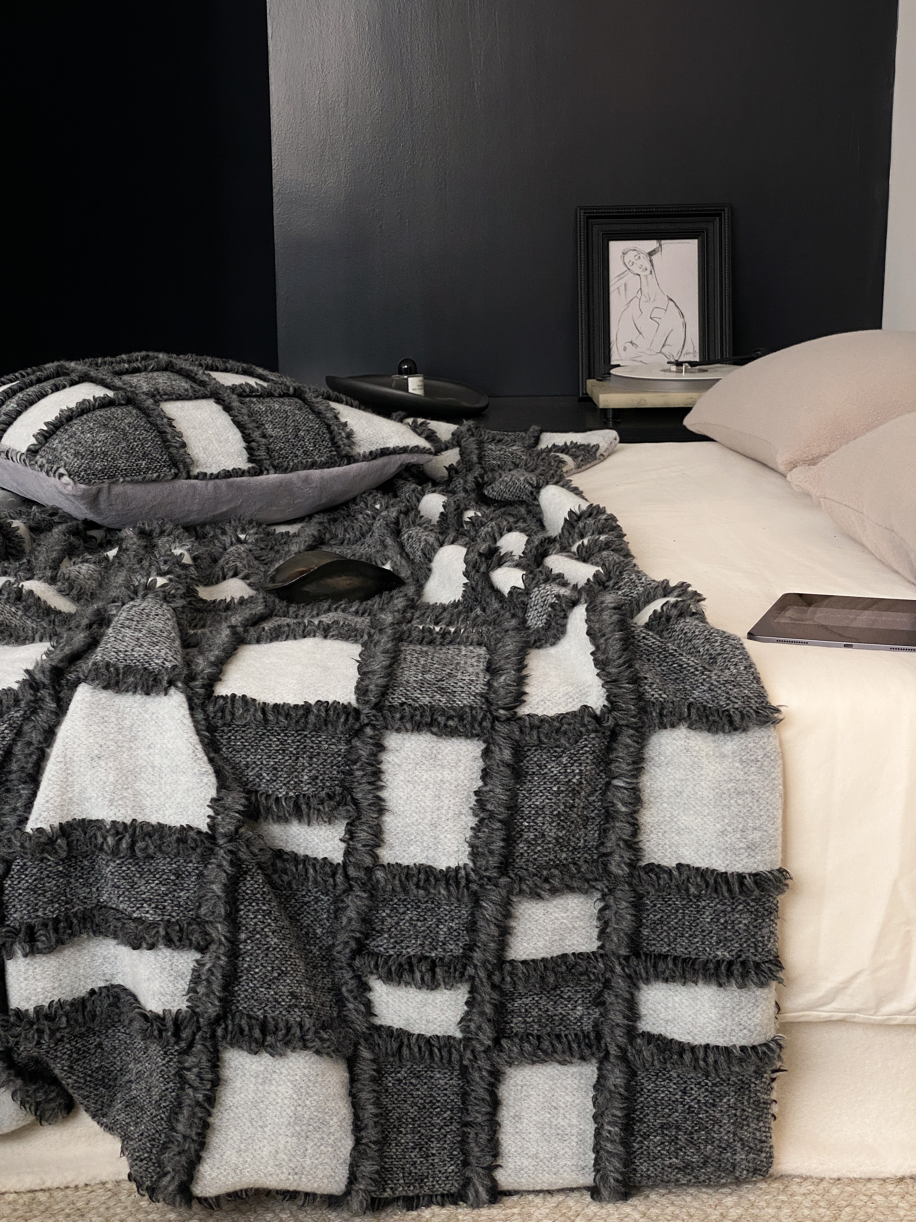 扎染黑白风一整个高级住,面料上也做了不同层次的混纺,是一条时髦小众的精品毛毯哦