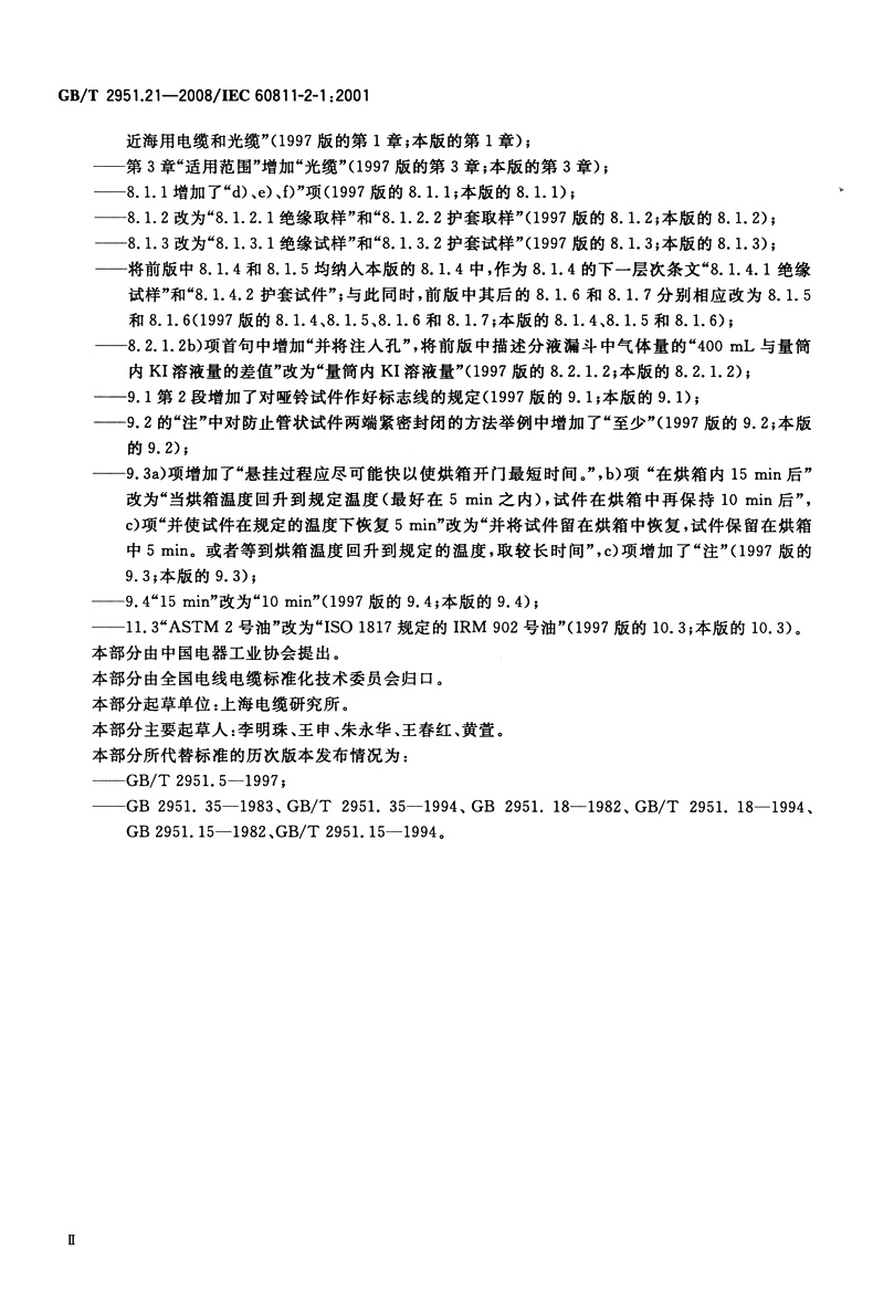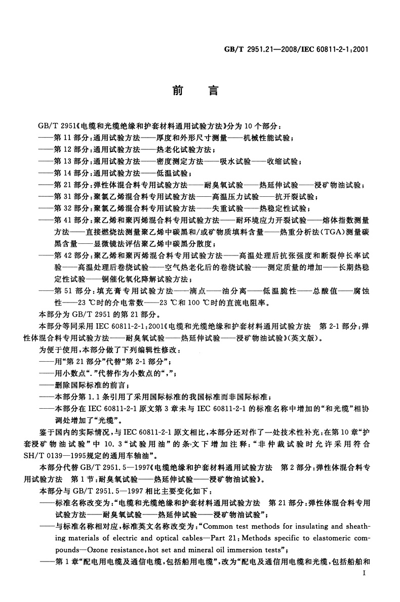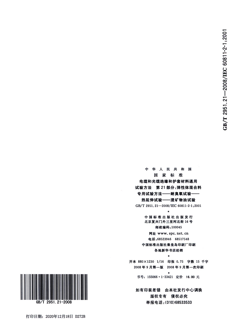 书名:速印不退 GB/T 2951.21-2008电缆和光缆绝缘和护套材料通用试验方法 第21部分:弹性体混合料专用试验方法—— 耐臭氧试验——热延伸试验——浸矿物油试验