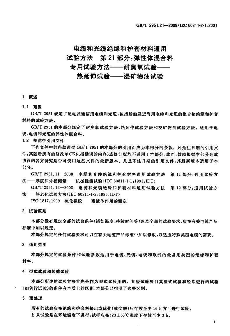GB/T 2951.21-2008电缆和光缆绝缘和护套材料通用试验方法 第21部分:弹性体混合料专用试验方法—— 耐臭氧试验——热延伸试验——浸矿物油试验