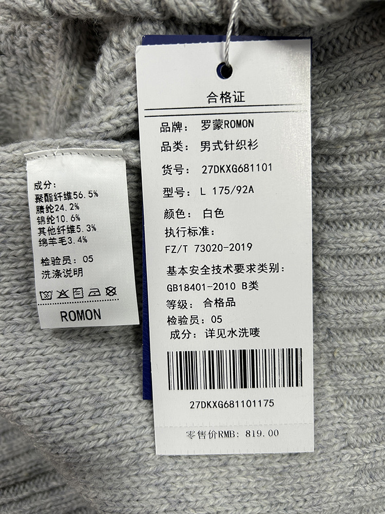 面料:聚酯纤维56.5%腈纶24.2%锦纶10.6%其他纤维5.3%绵羊毛3.4%
